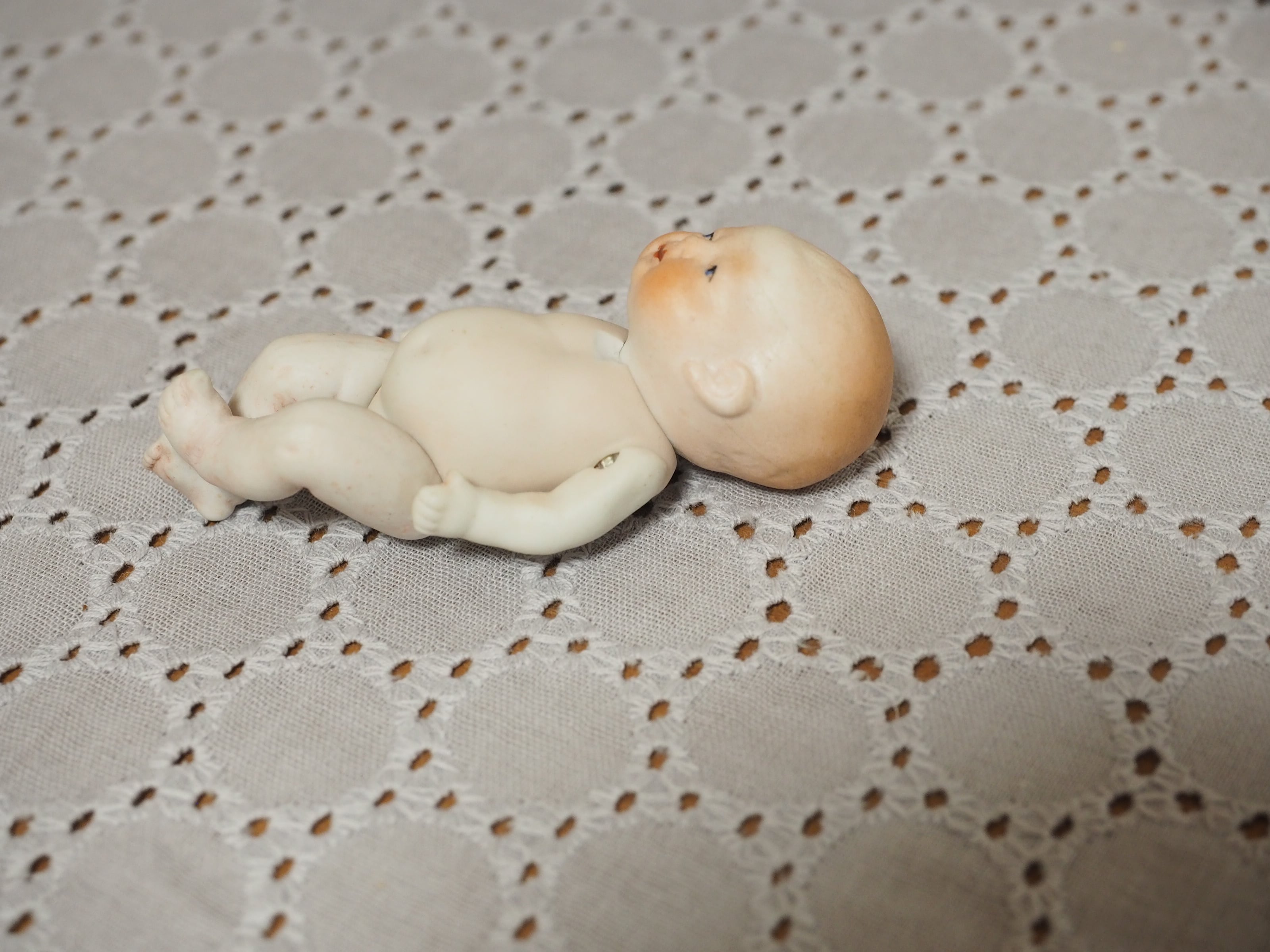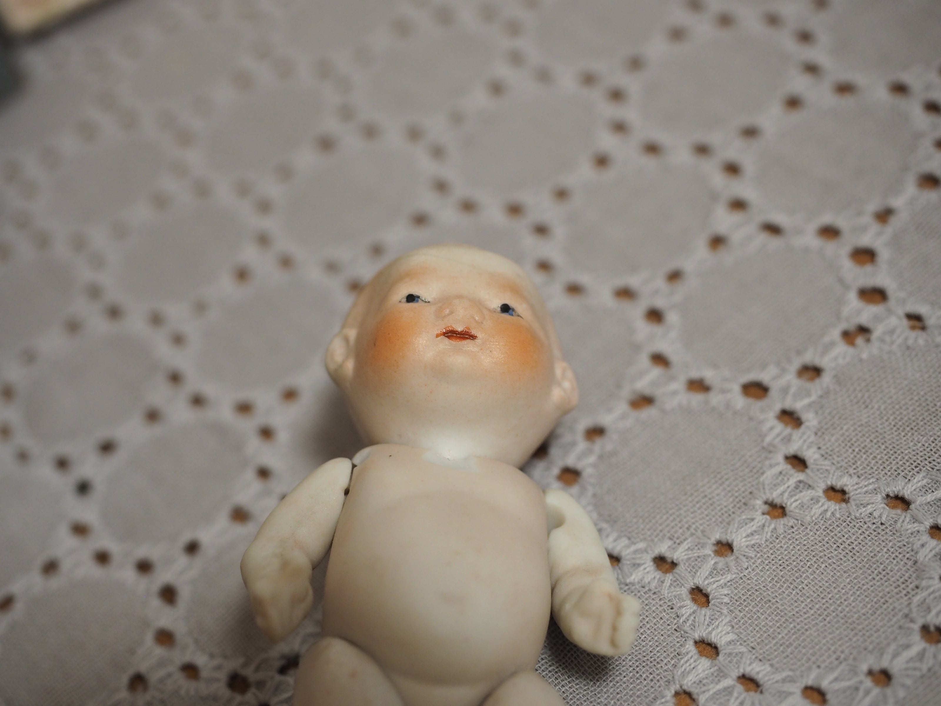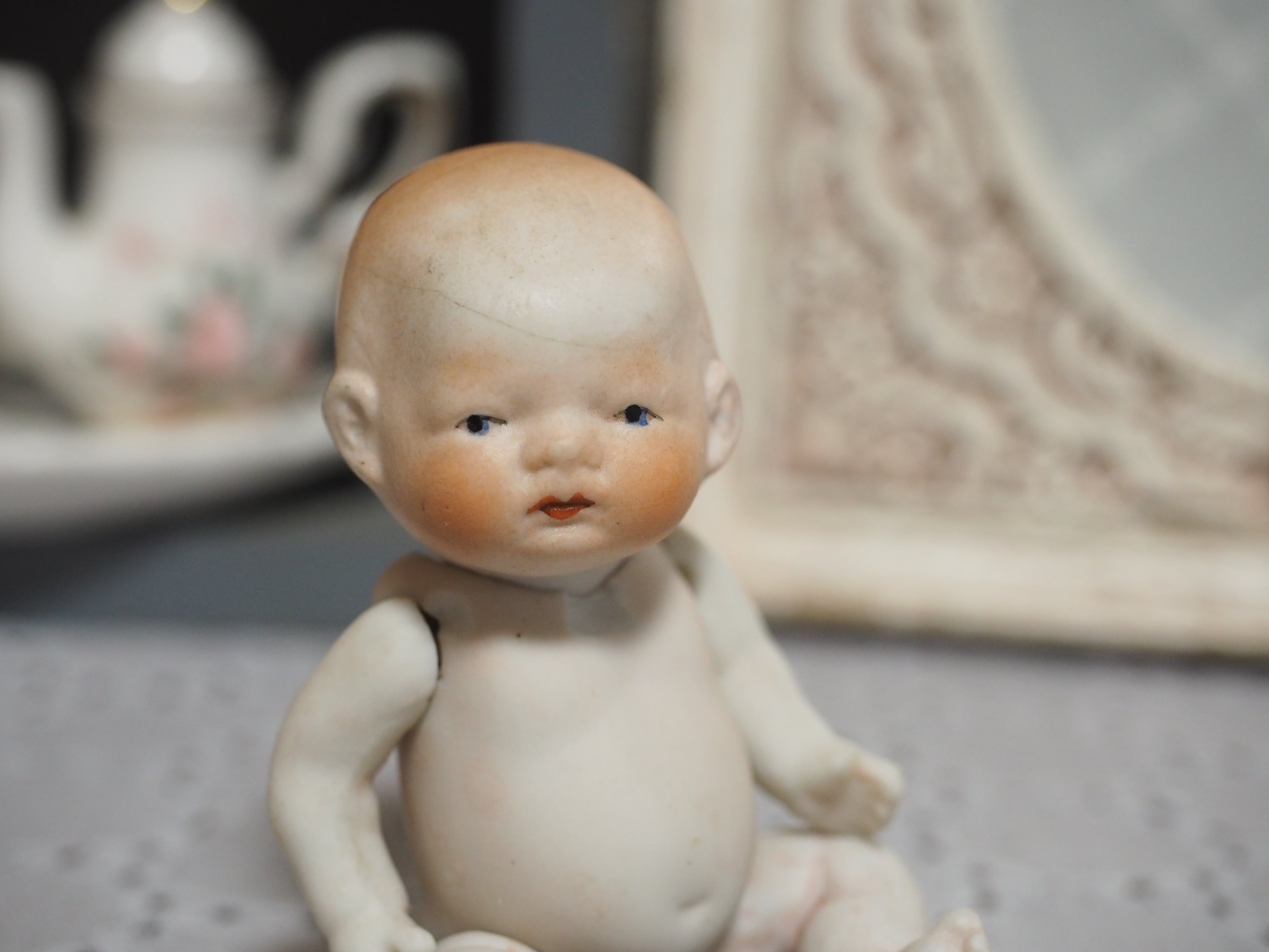 山城柳平商店(のちの丸山陶器)が製作のベビーに似ており、作りもとても細やかです。背中のMADE IN JAPANの字体も山城柳平商店と同じですが、メーカーマークがなく、模倣されて作られていたお人形もあるそうで不明です。