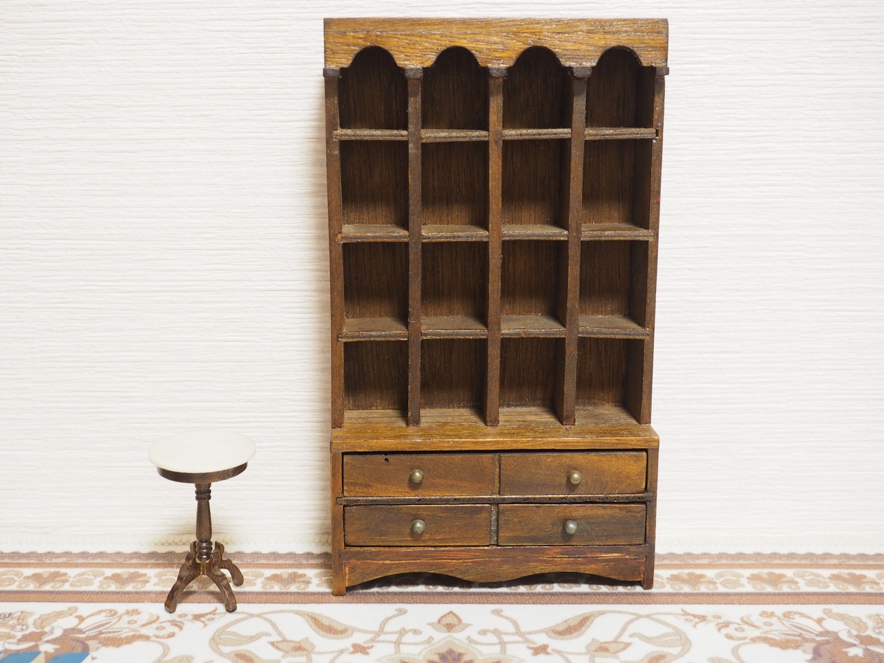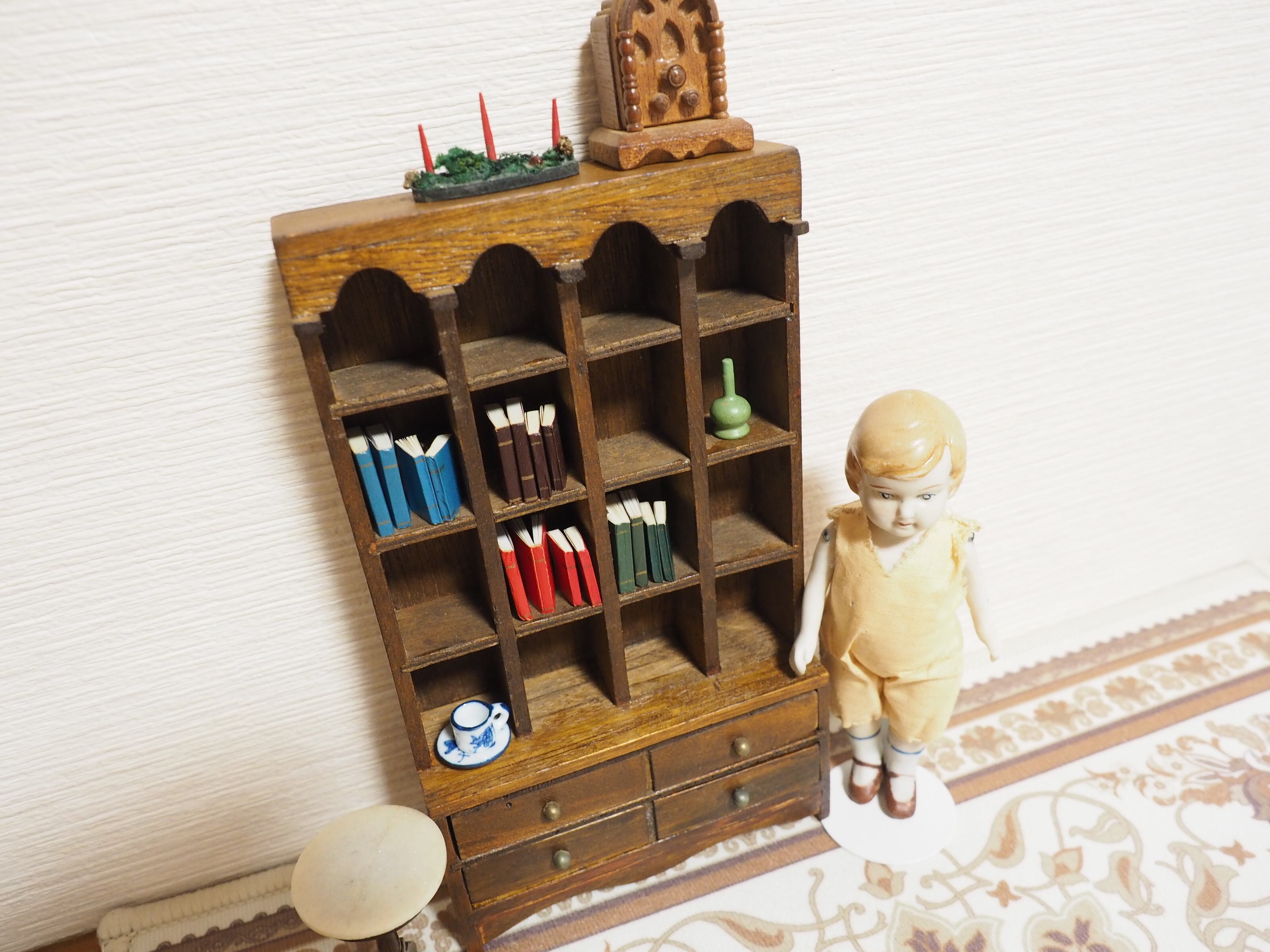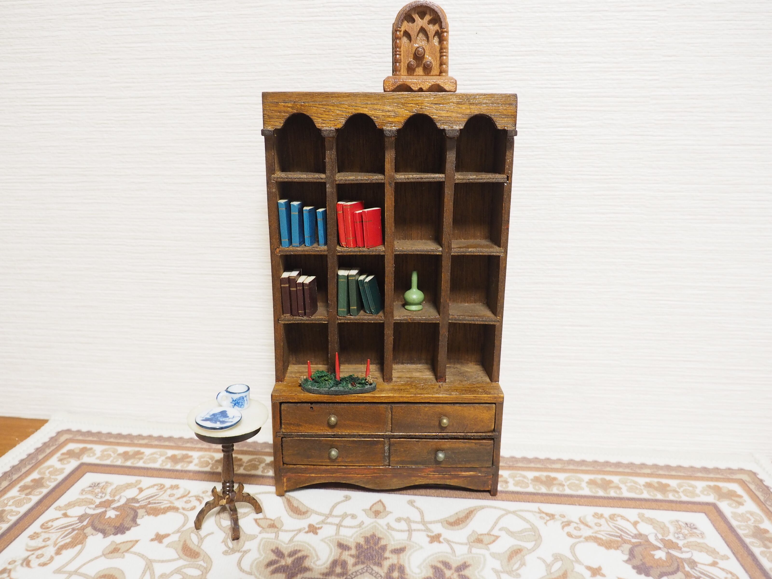 落ち着いた色合いの木製ドール家具、本棚・小さなテーブル・ラジオ・本16冊・木製飾り2つ・カップアンドソーサーのセットです。
