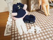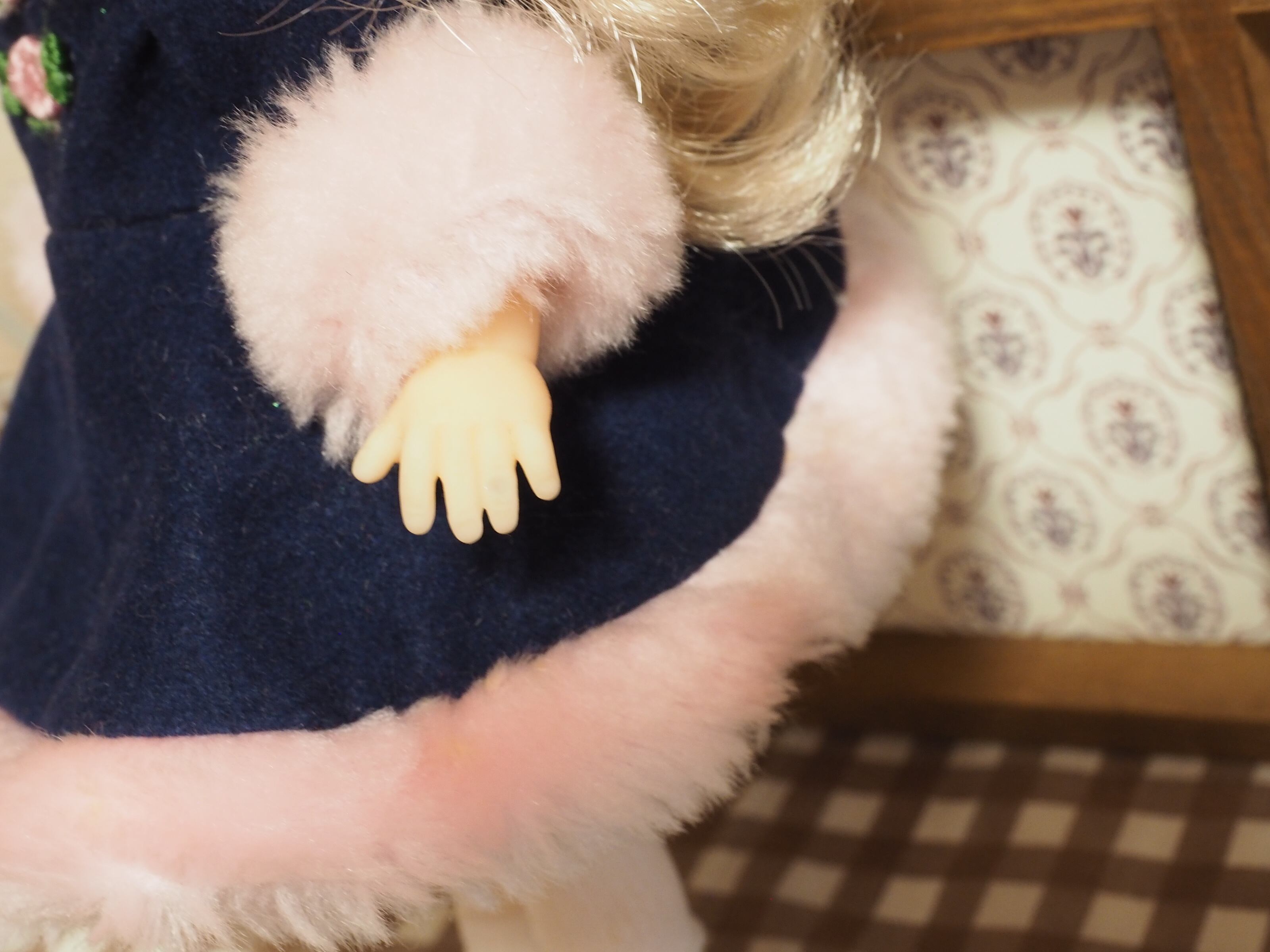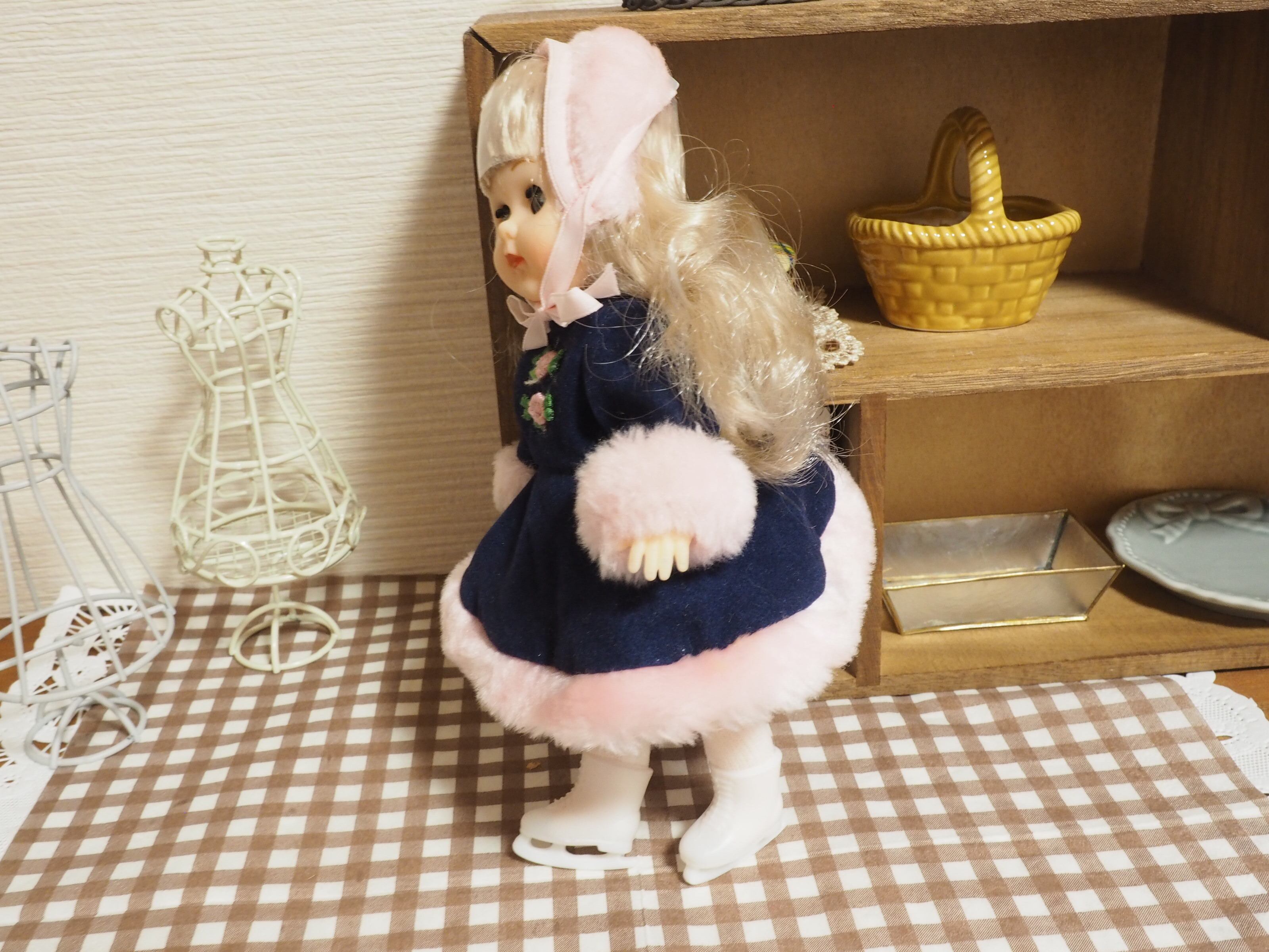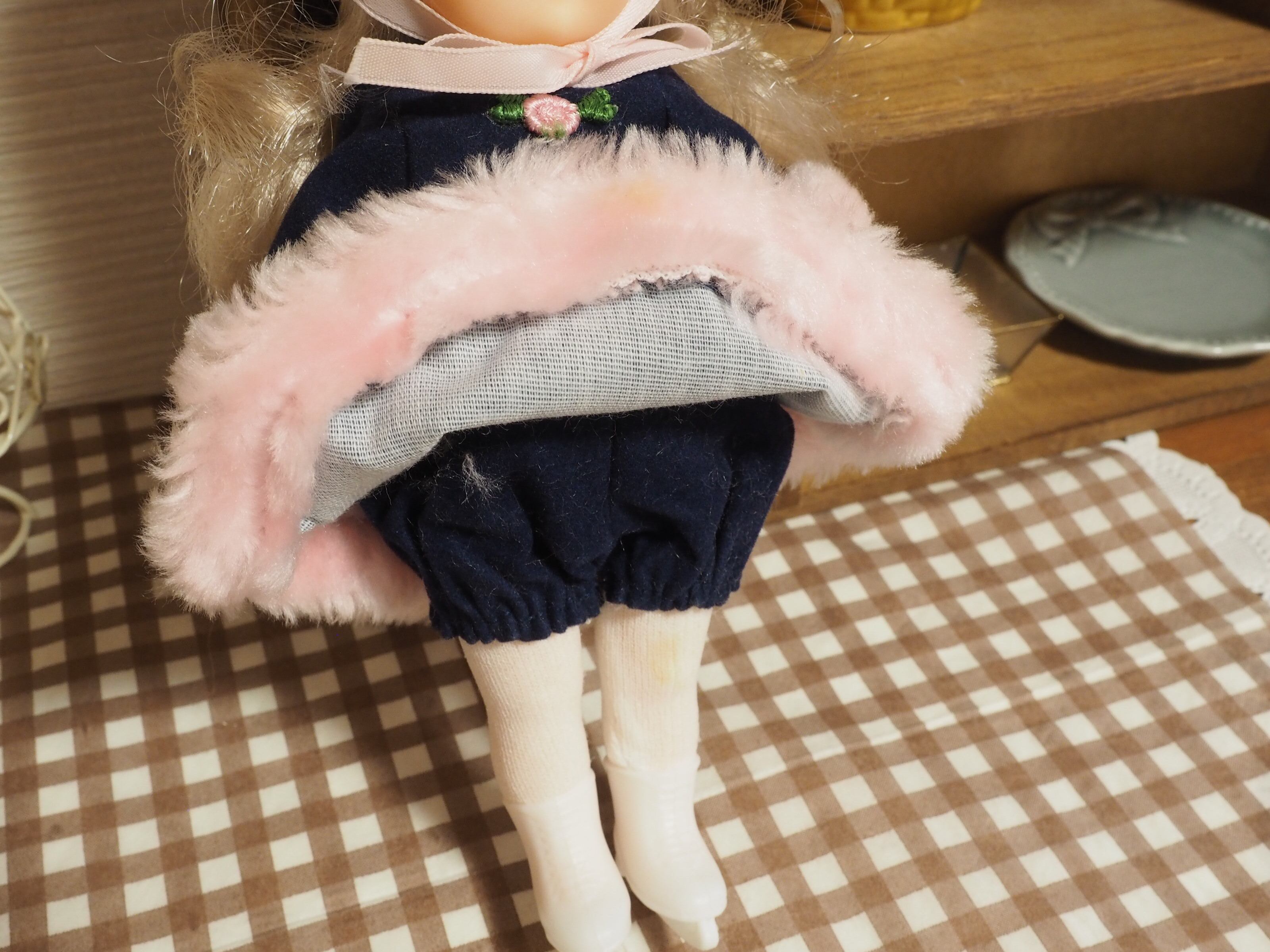 ピンクのファーヘッドドレスにファートリミングのワンピース、スケート靴をはいたジニーです。