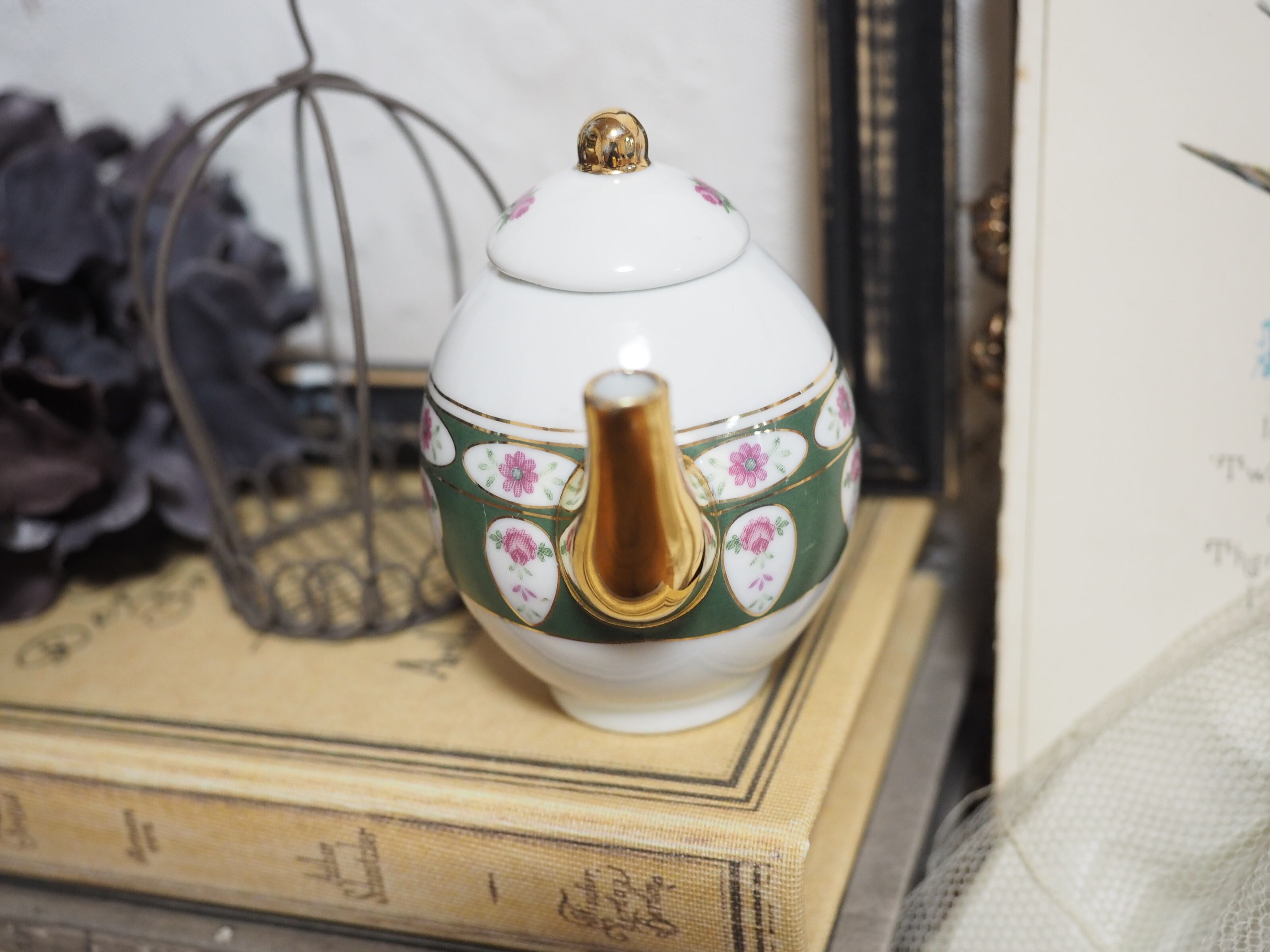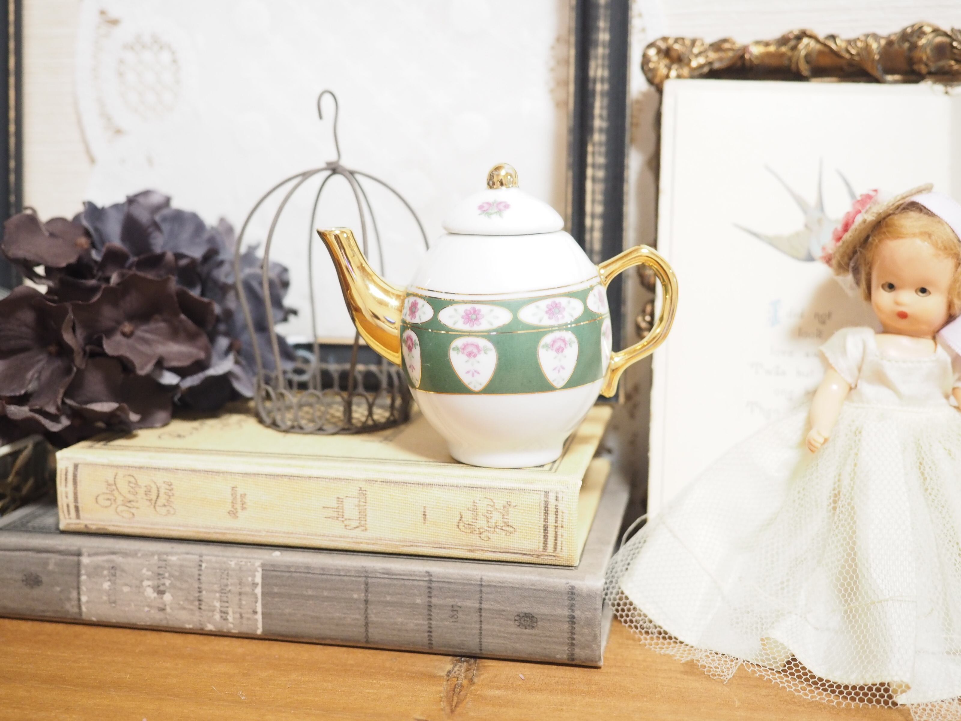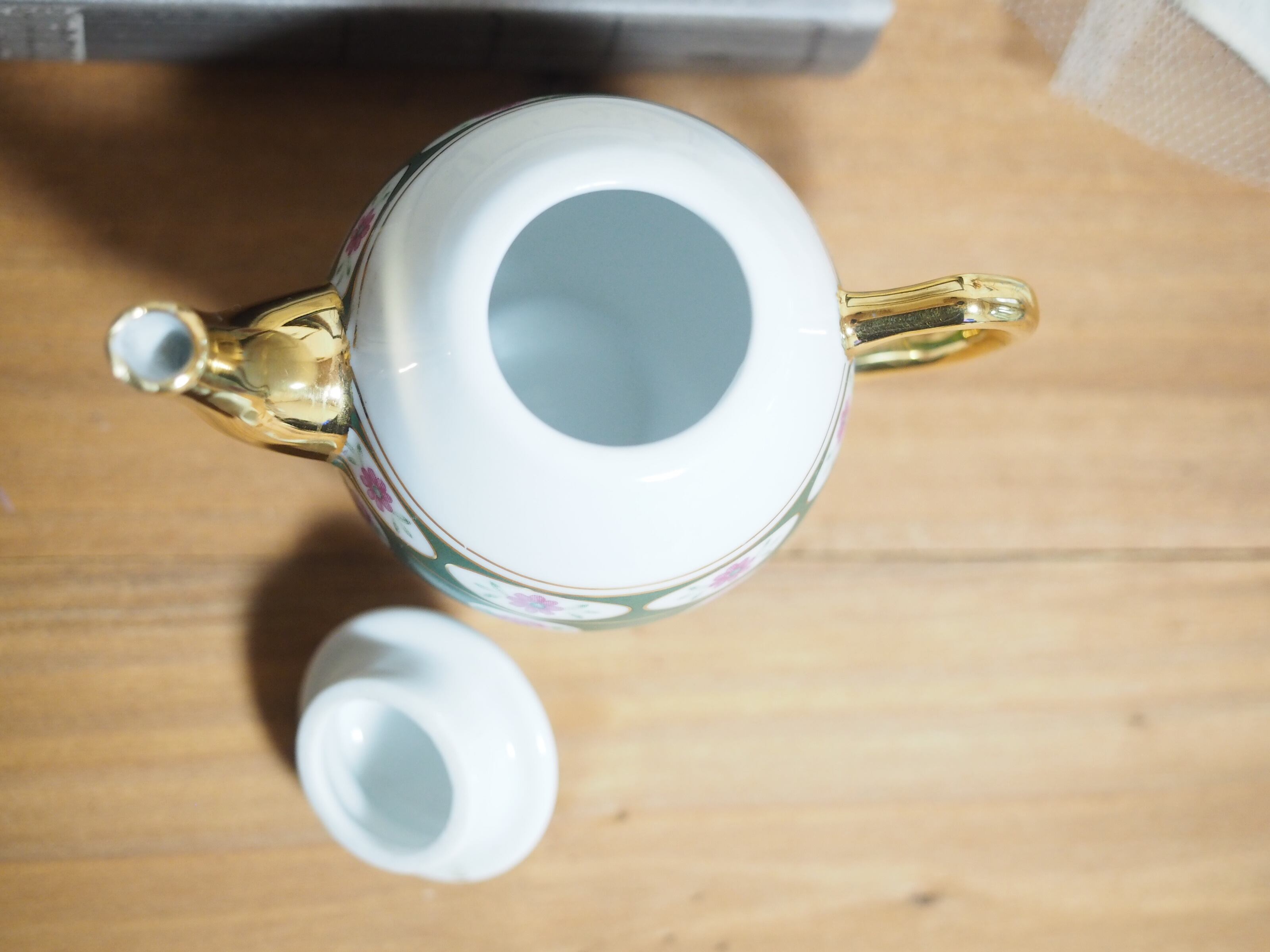 モスグリーンにコスモスと薔薇のモチーフ・金彩がおしゃれなポットです。やや大き目で存在感があります。
