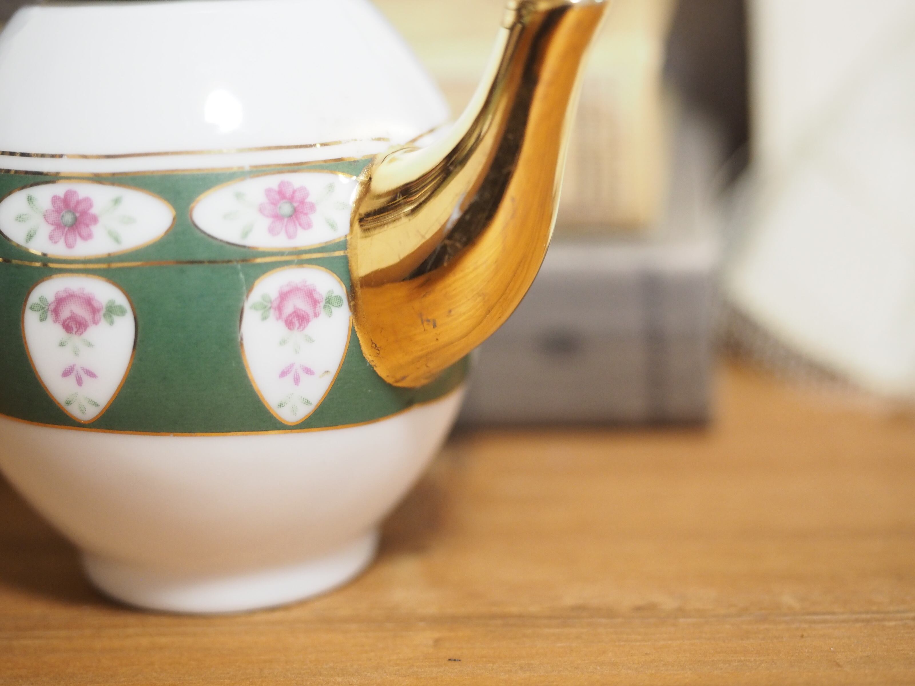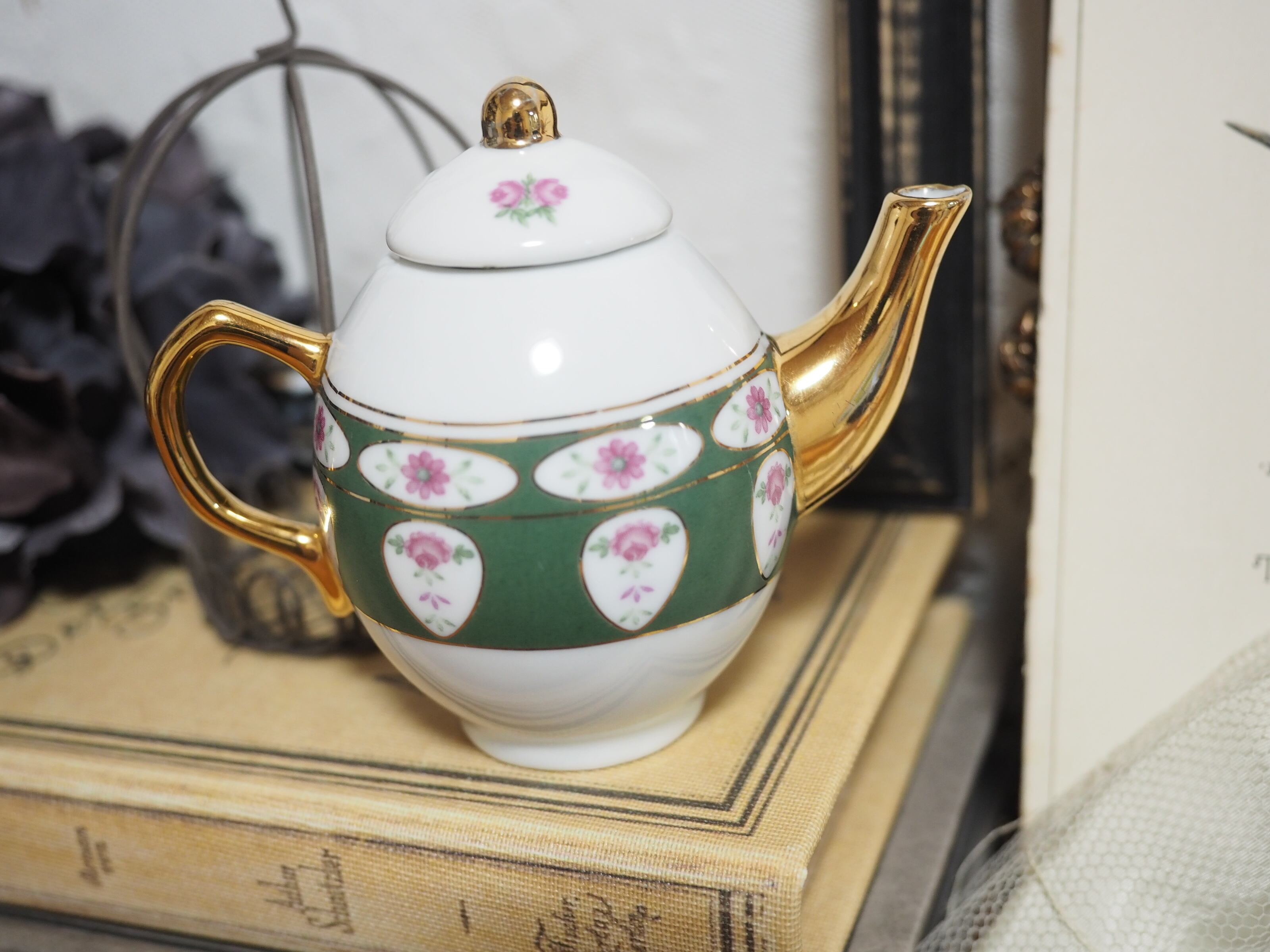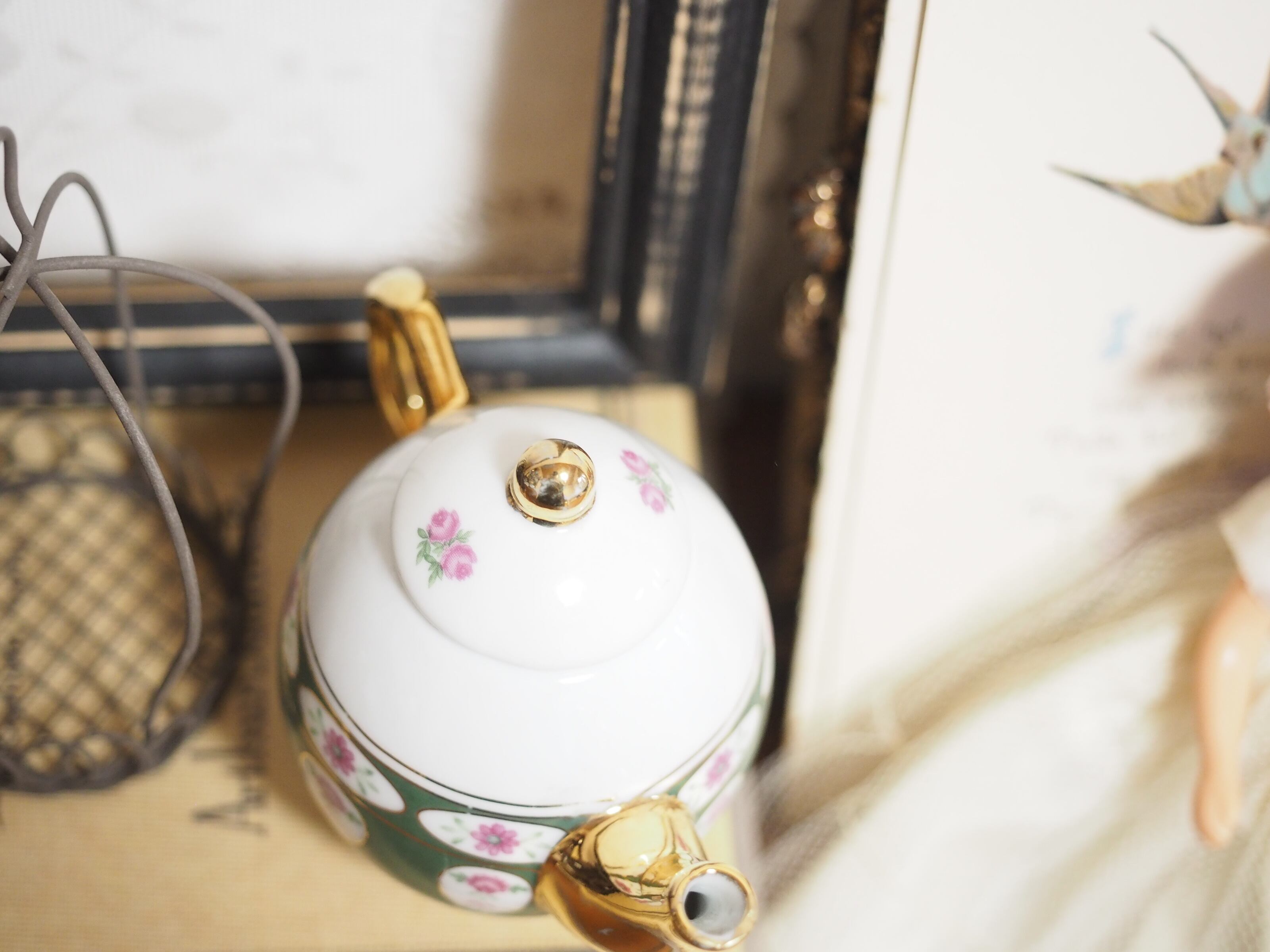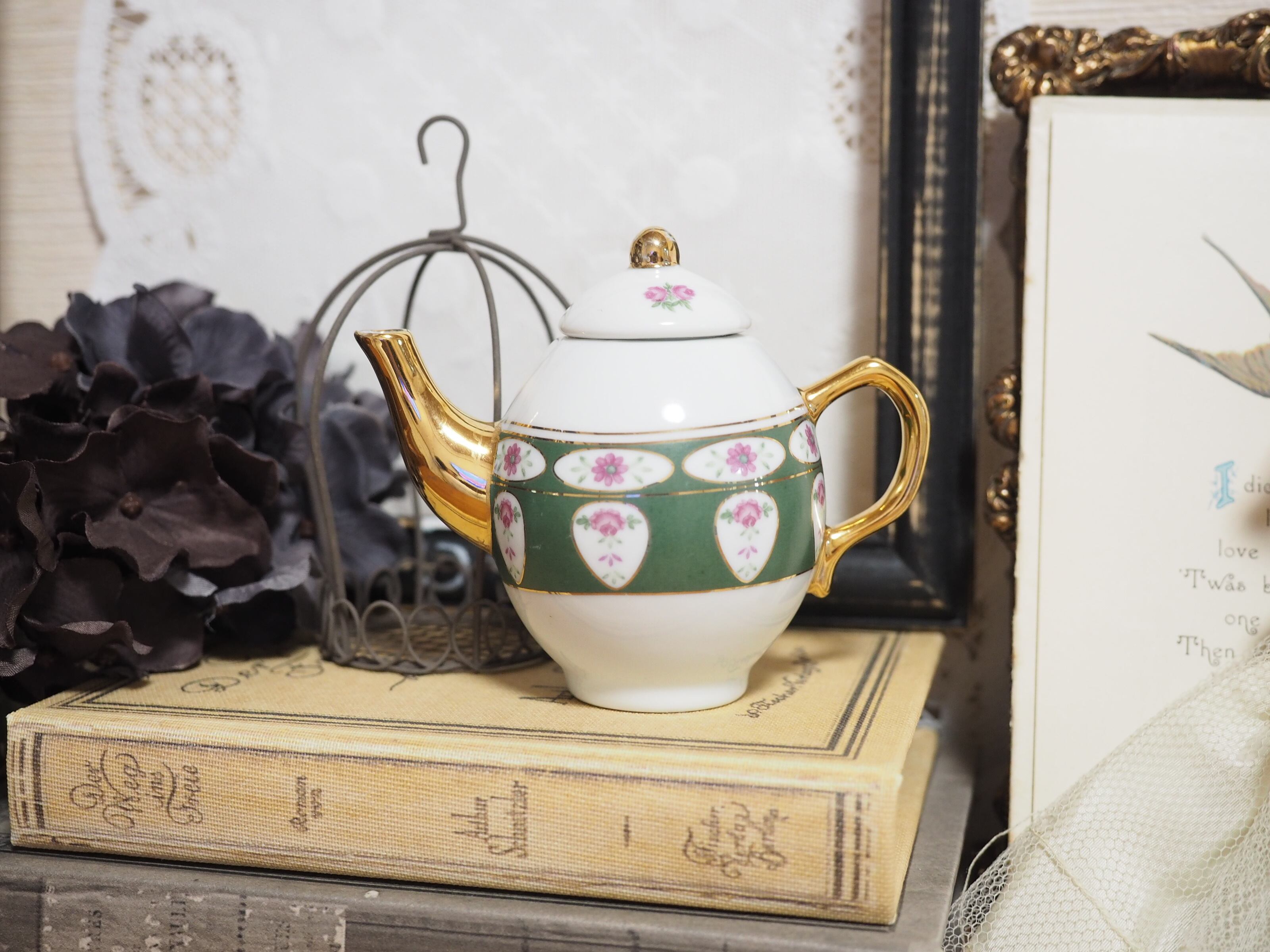 モスグリーンにコスモスと薔薇のモチーフ・金彩がおしゃれなポットです。やや大き目で存在感があります。