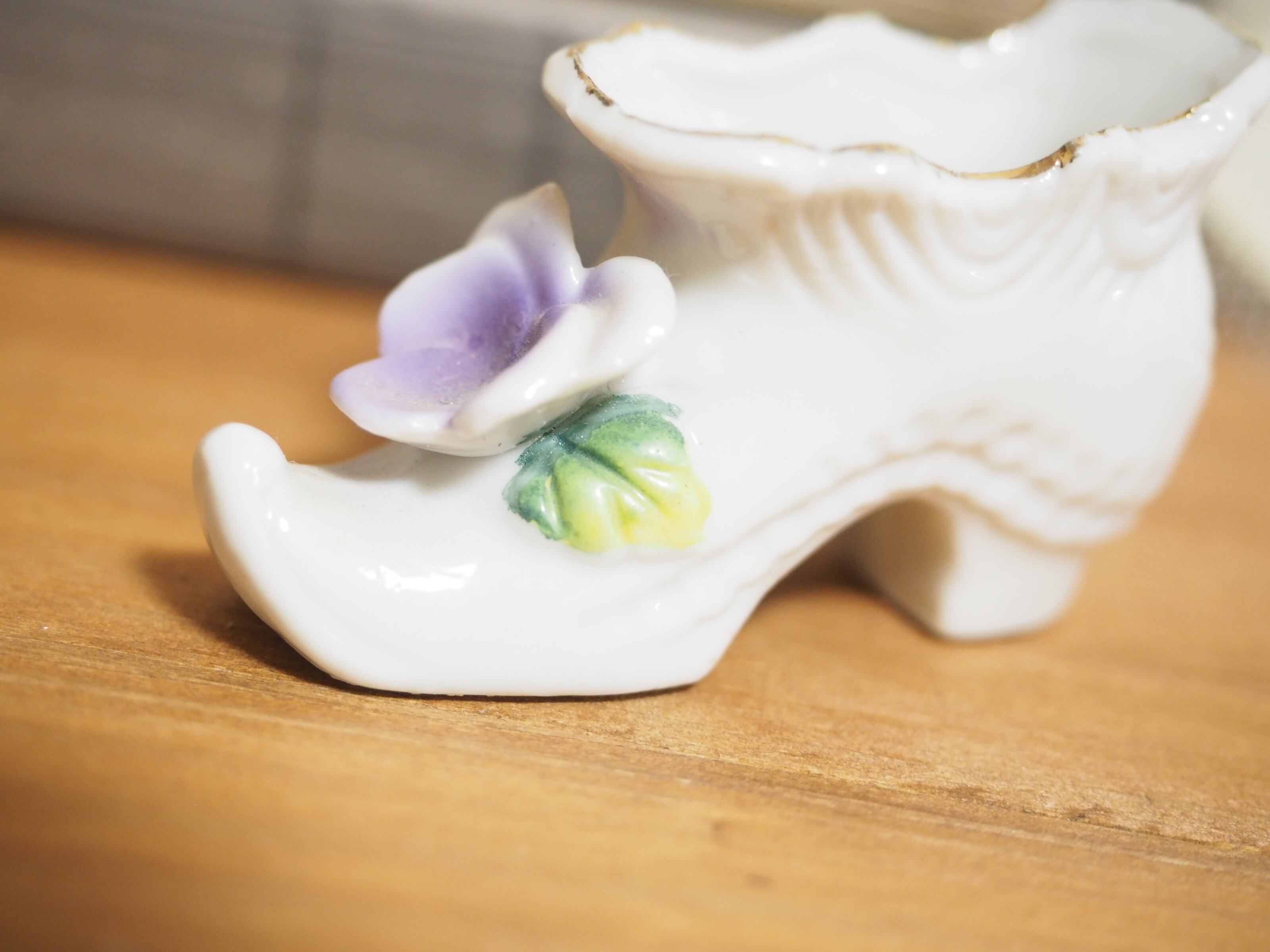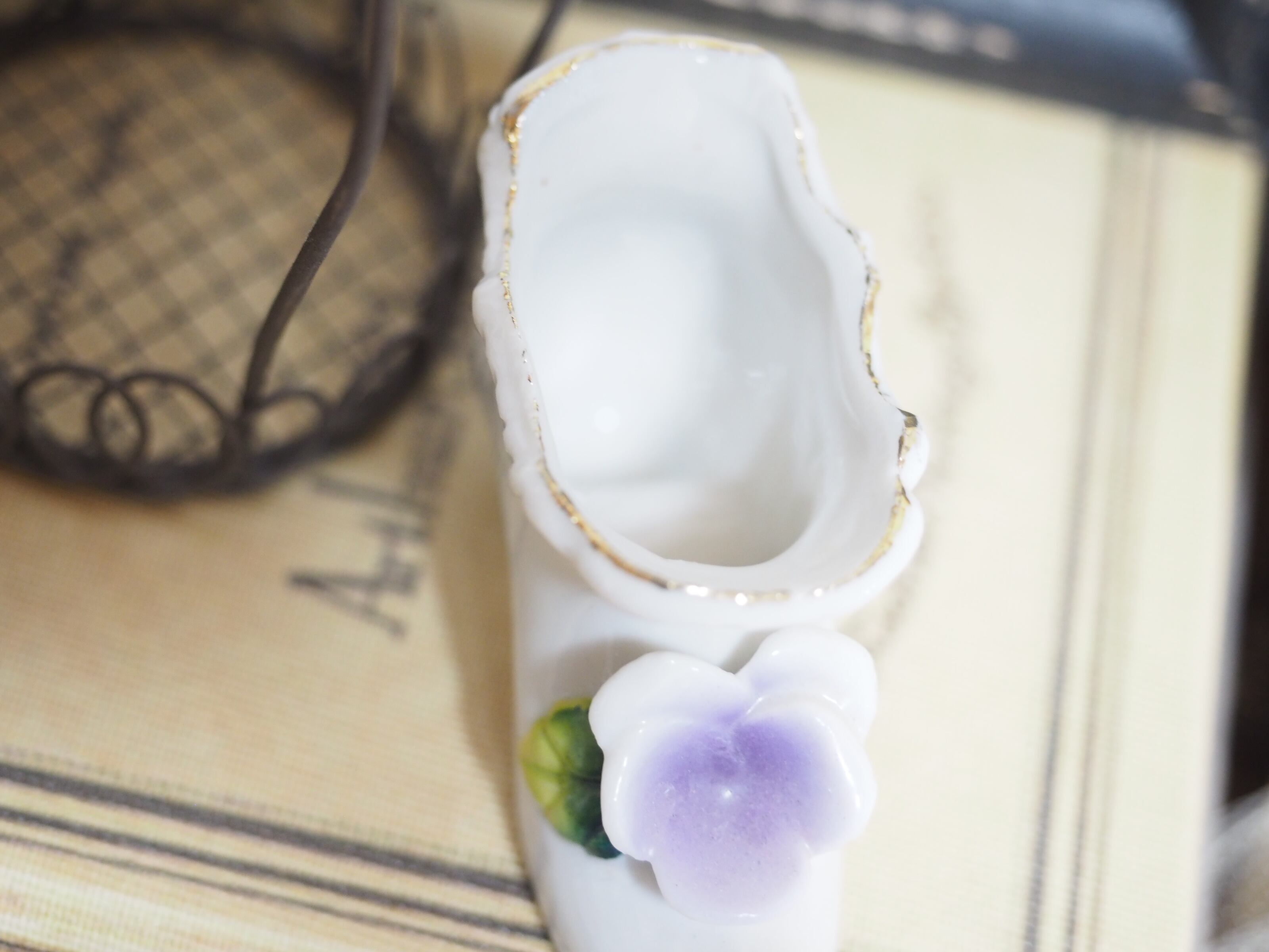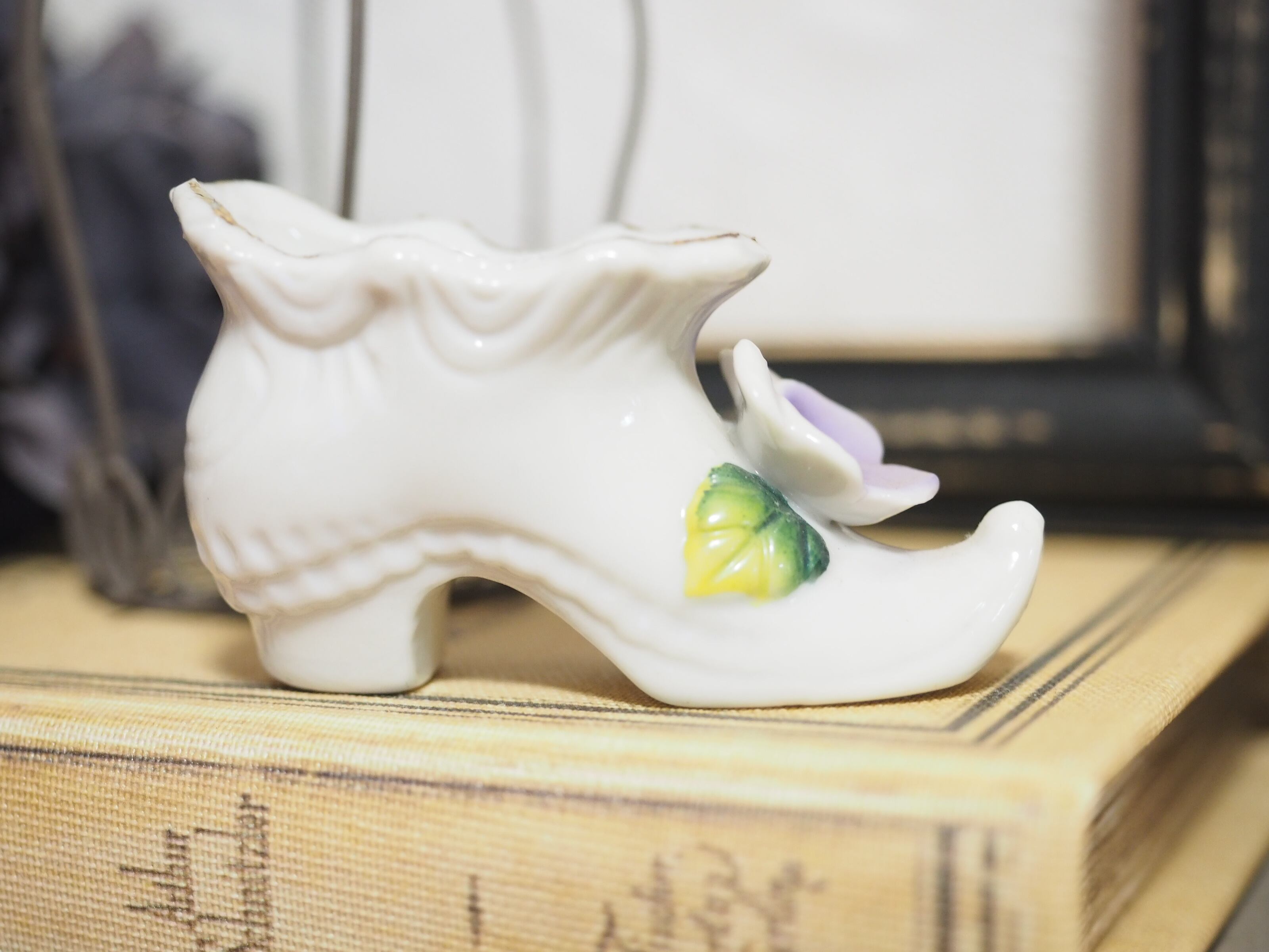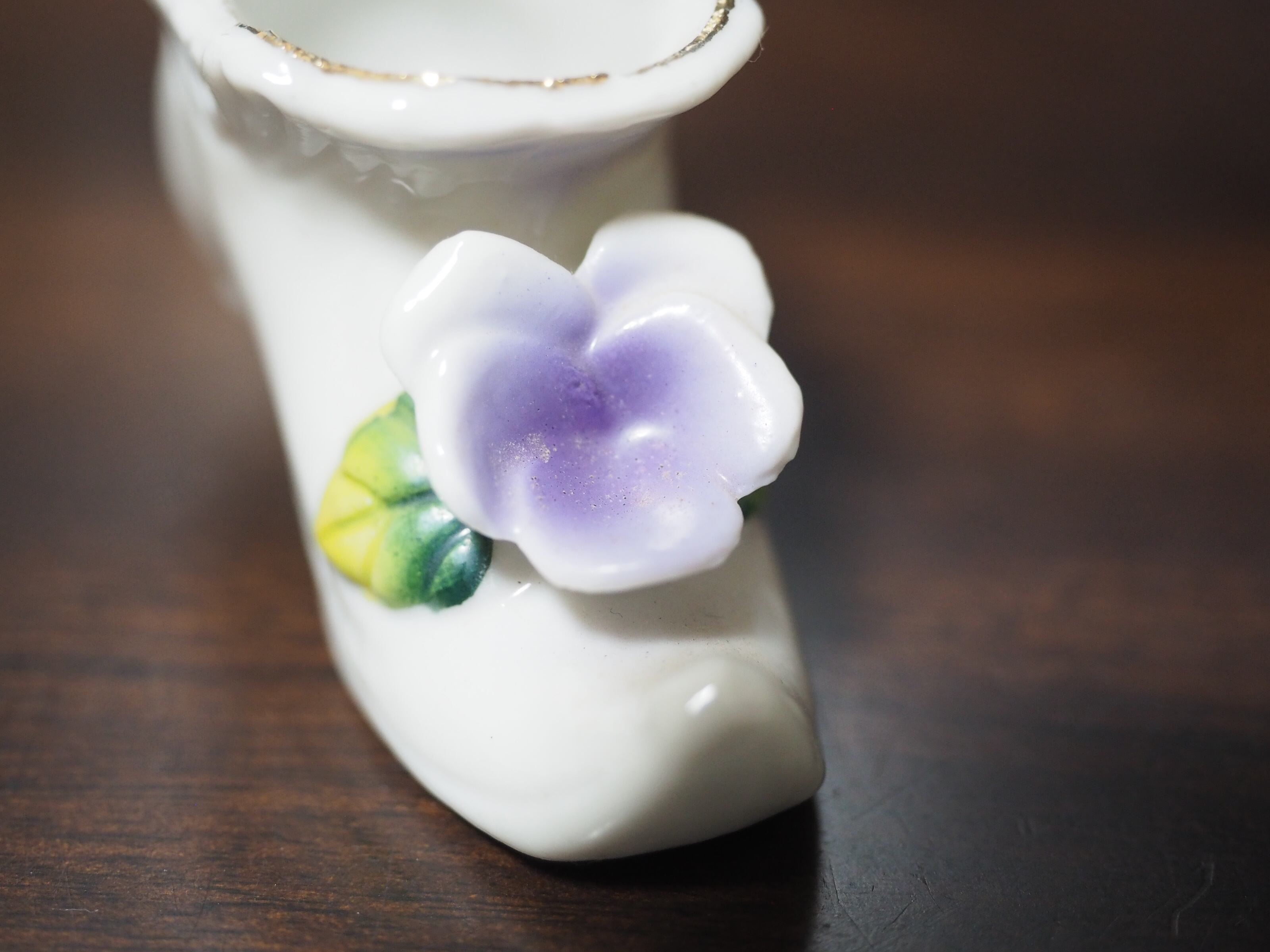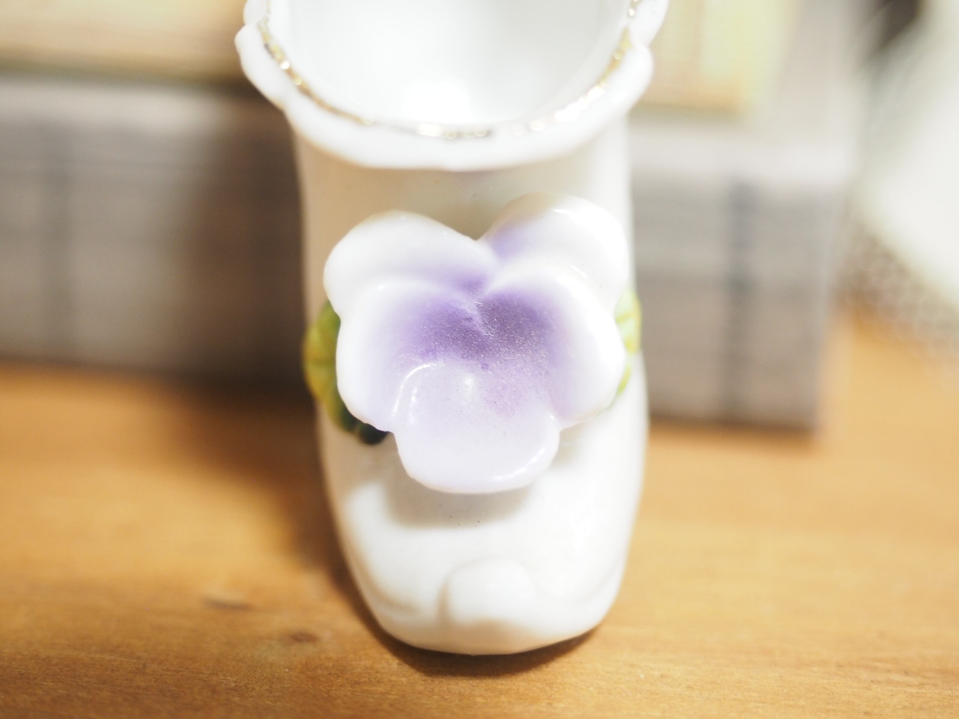 マットなパンジーが美しい、繊細な模様が施されたポーセリンシューズです。