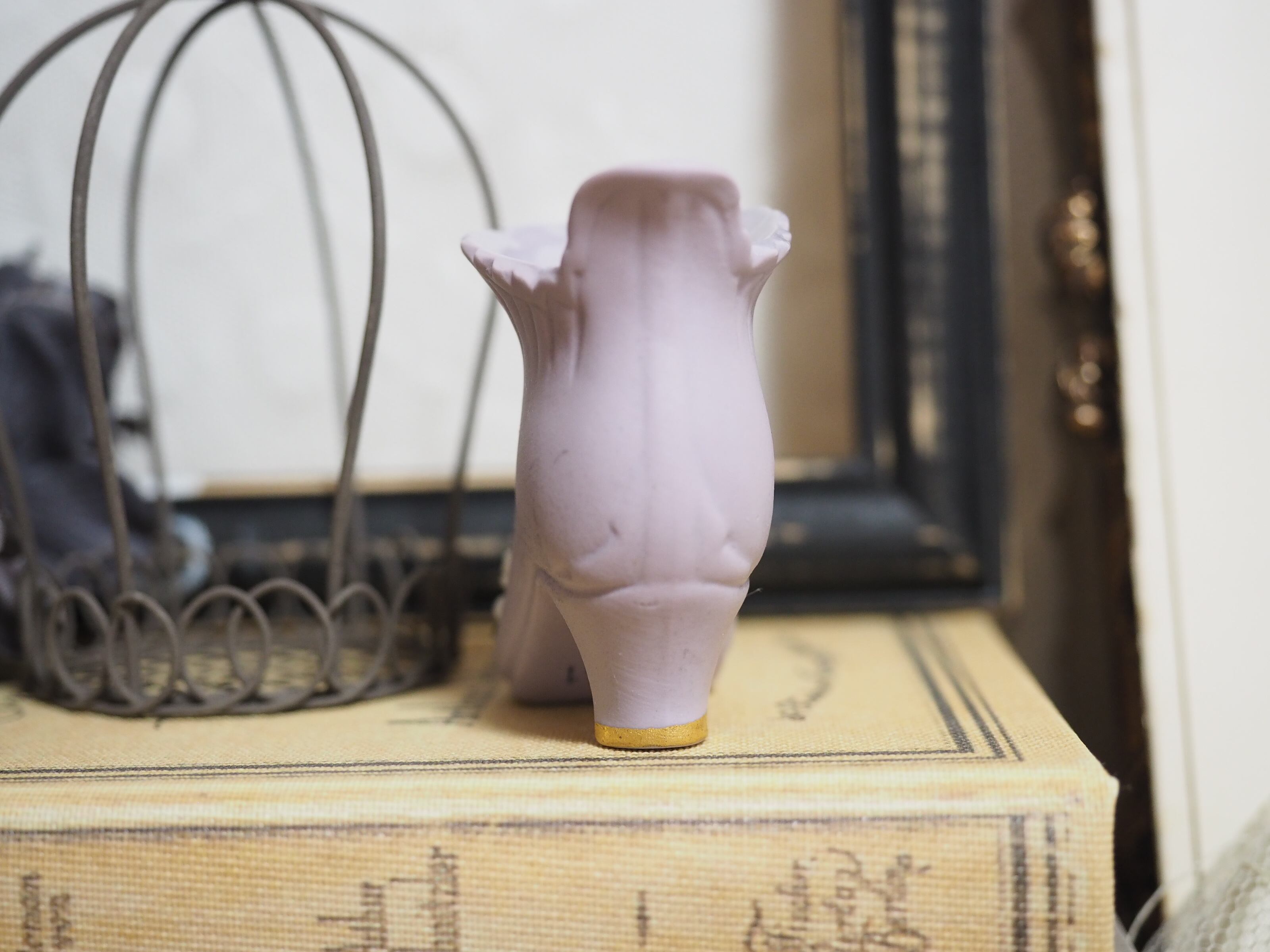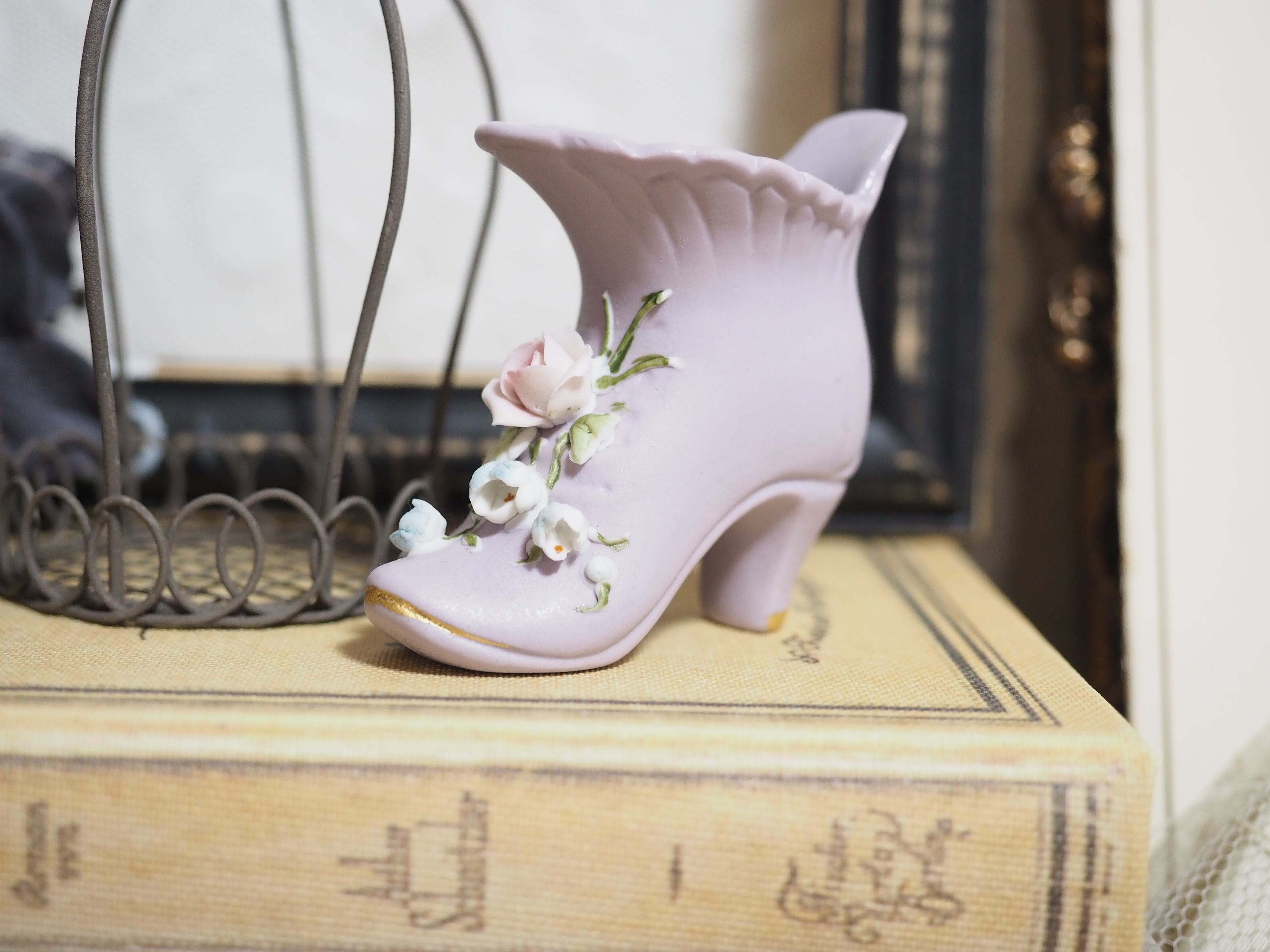 マットなパープルの陶器に立体のお花が美しいシューズです。レフトン製