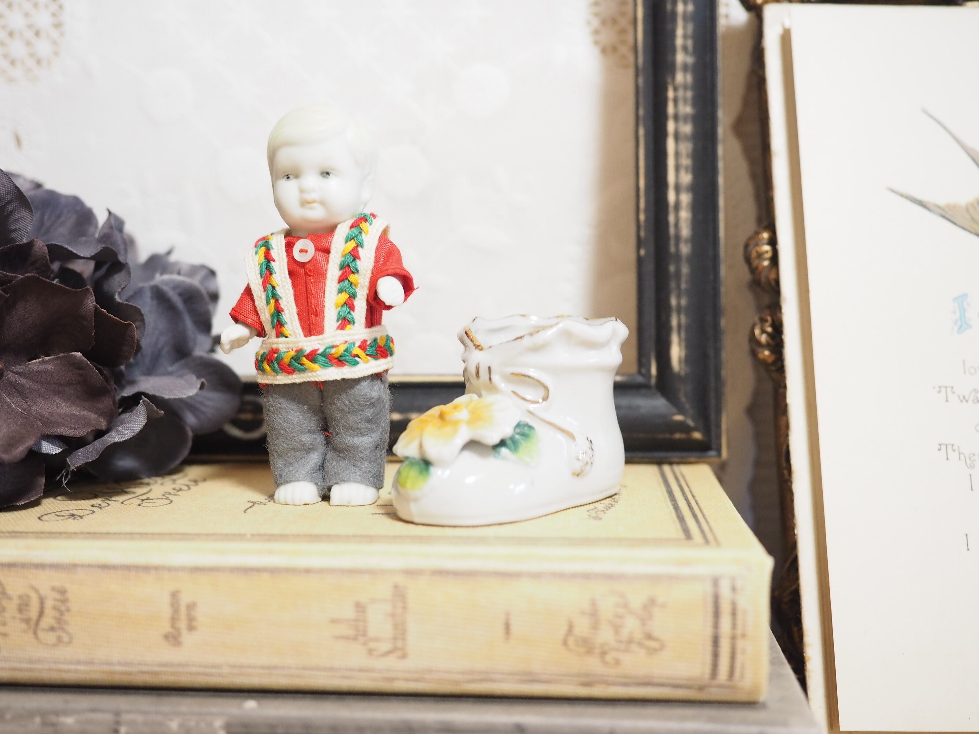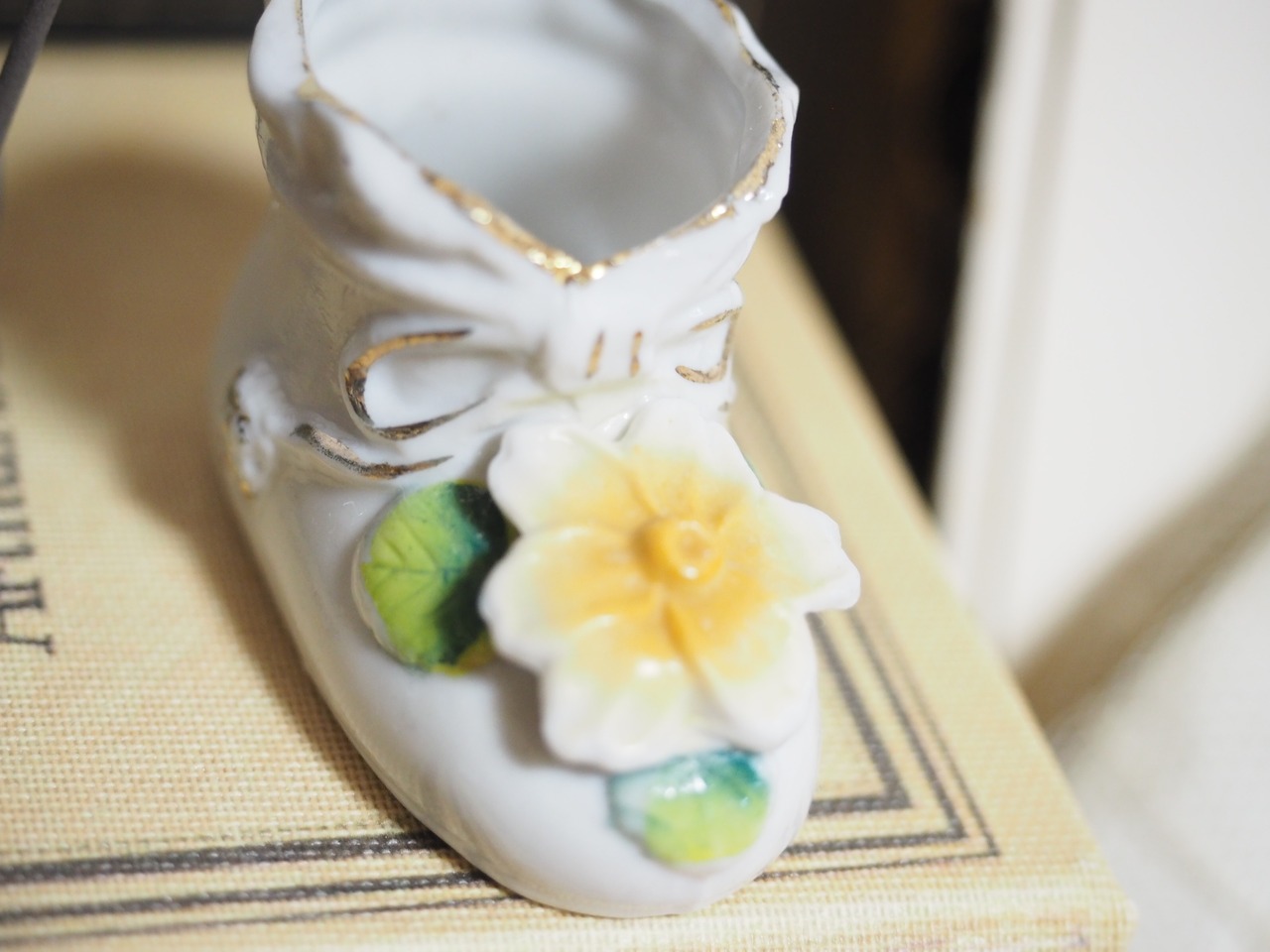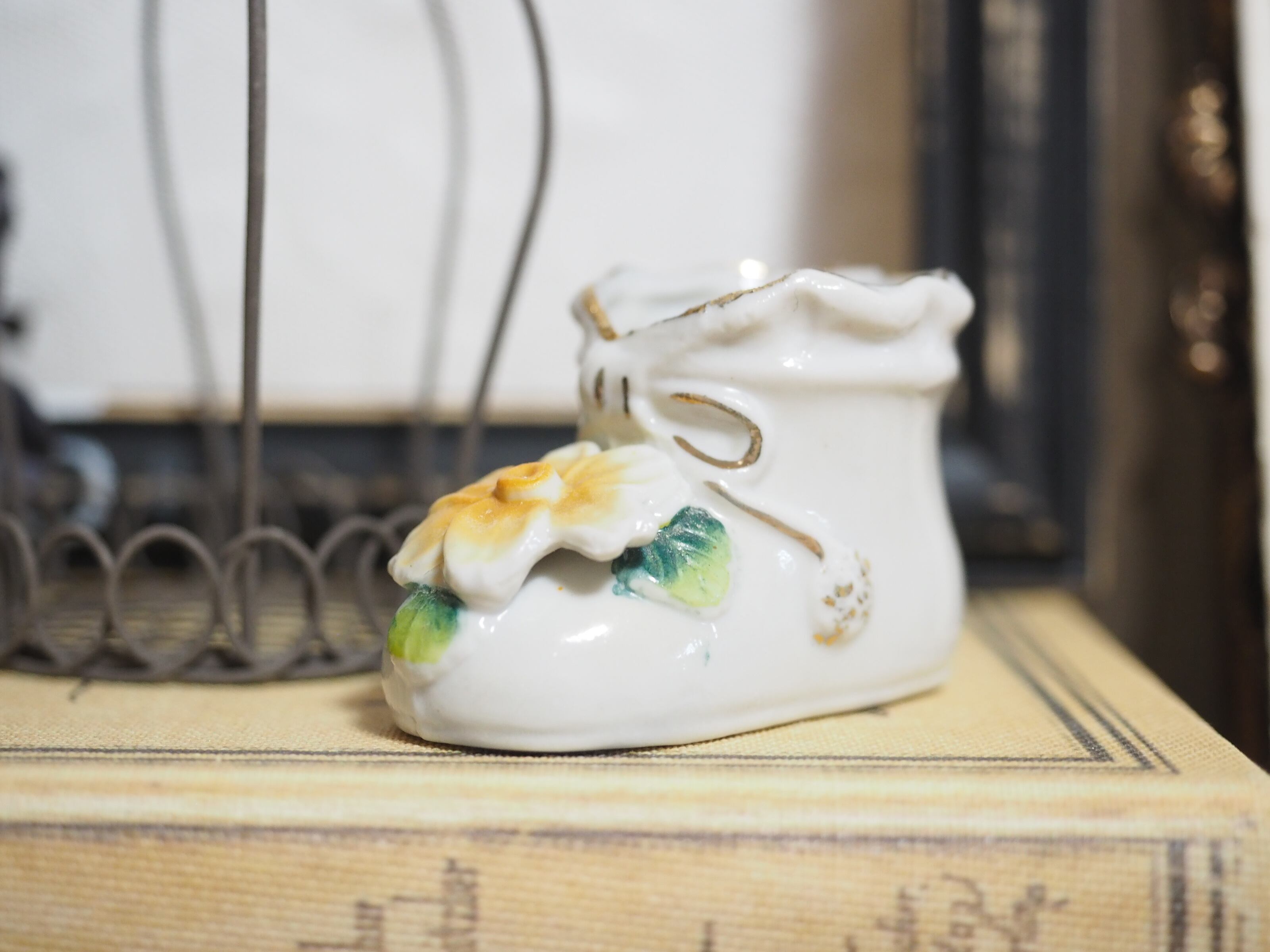 ぽってりした形にニットで編まれたようなリボンデザインにコスモスのような黄色のお花、ベビーシューズをかたどったポーセリンシューズと思われます。