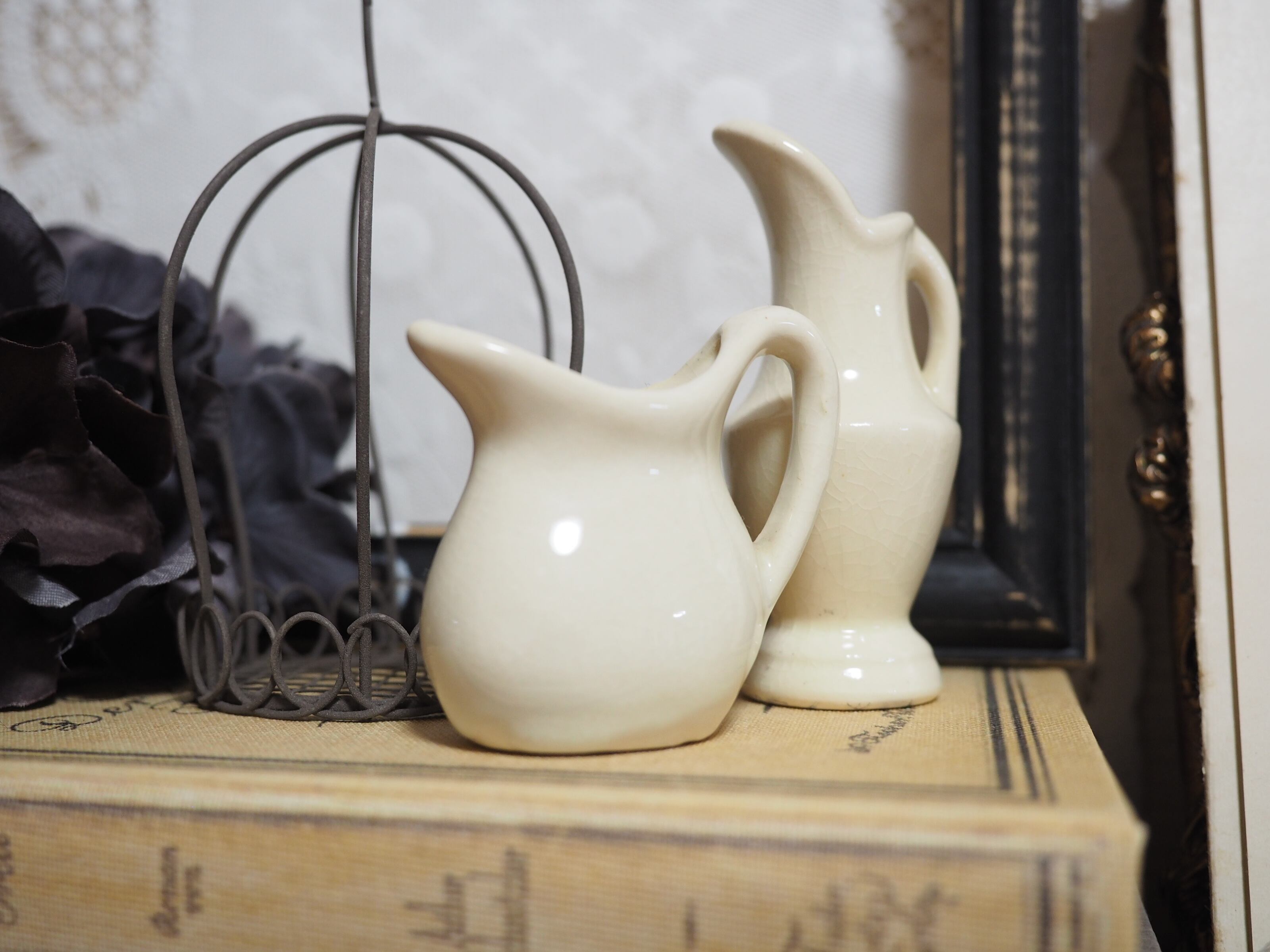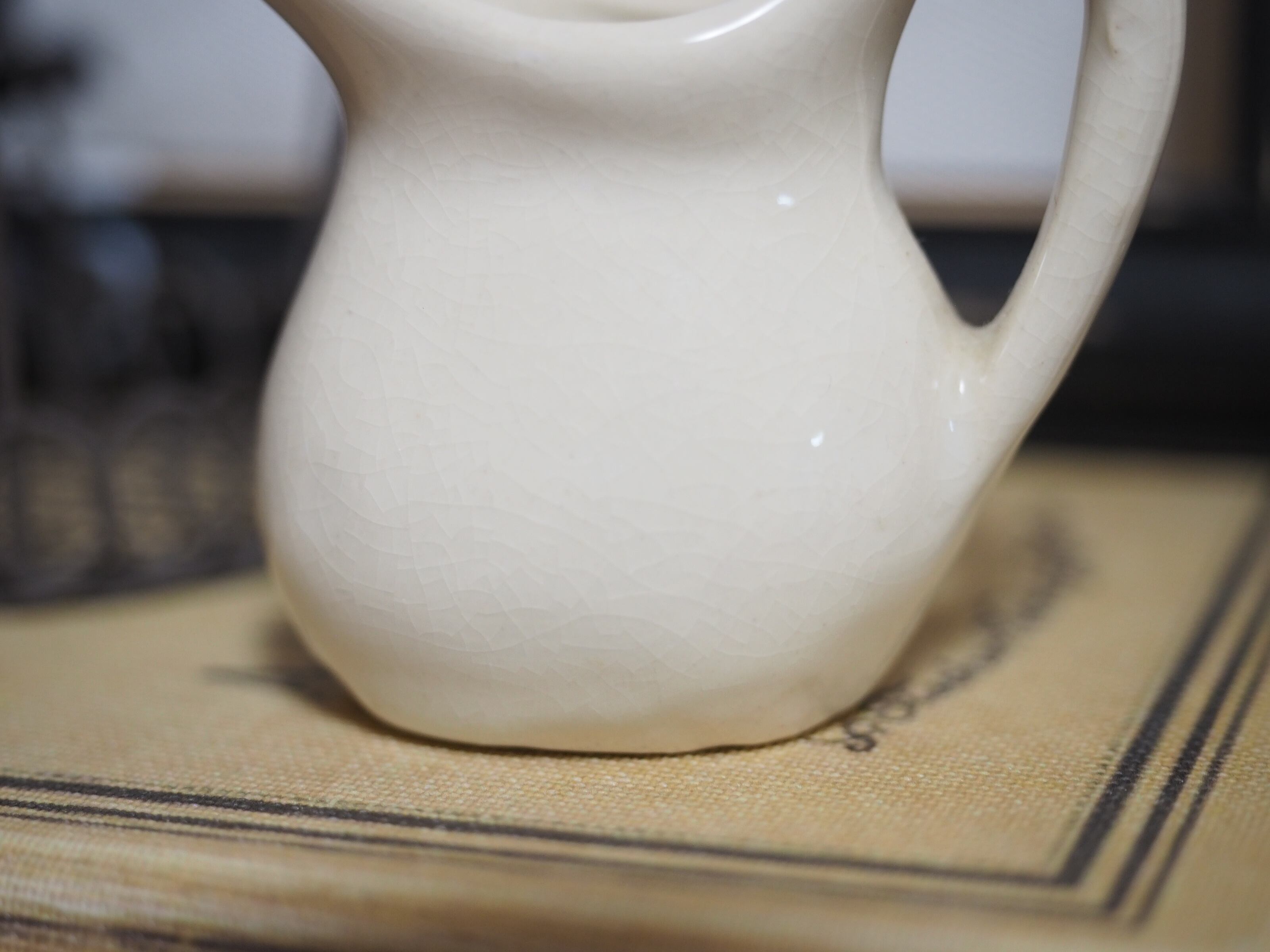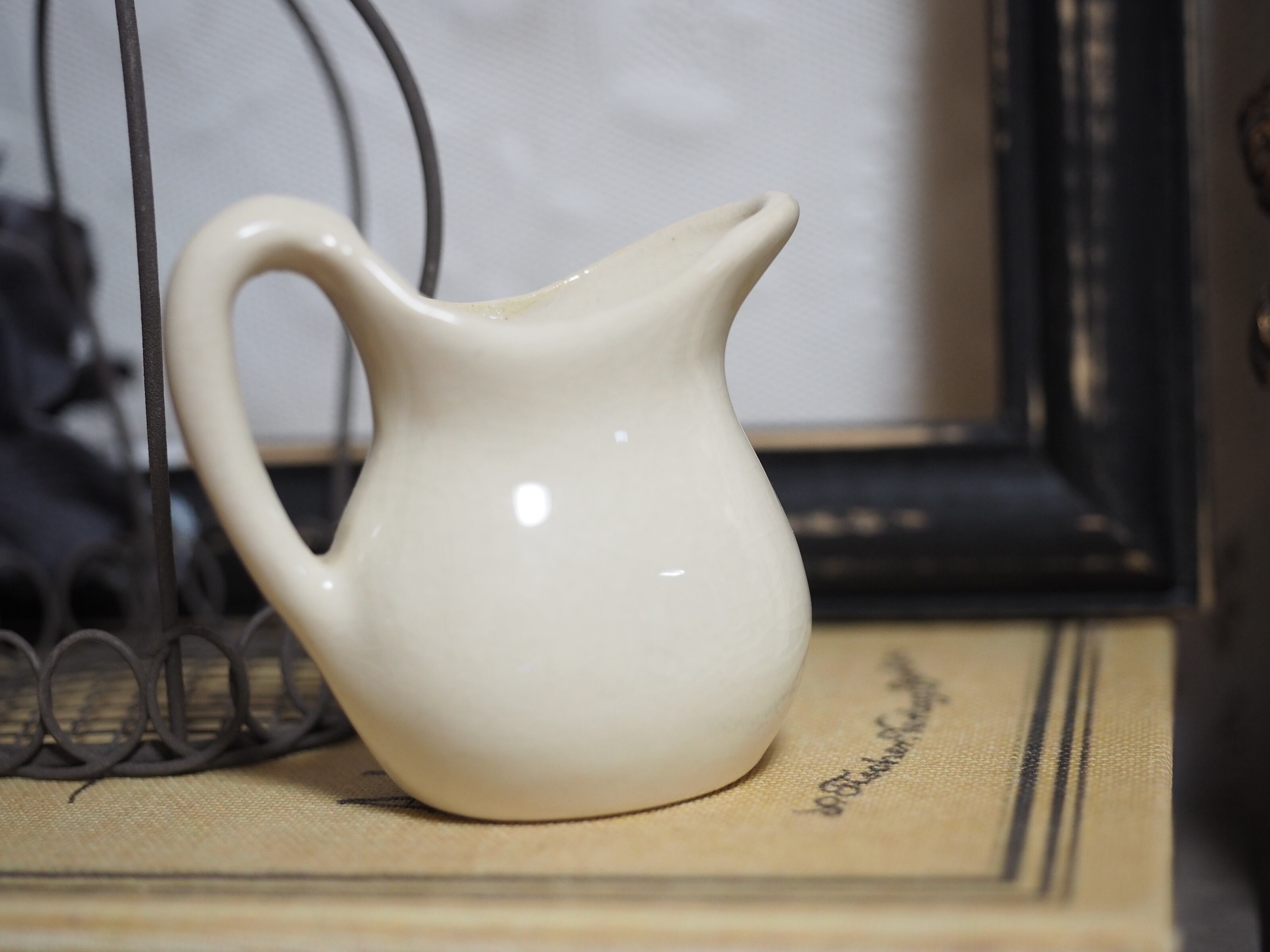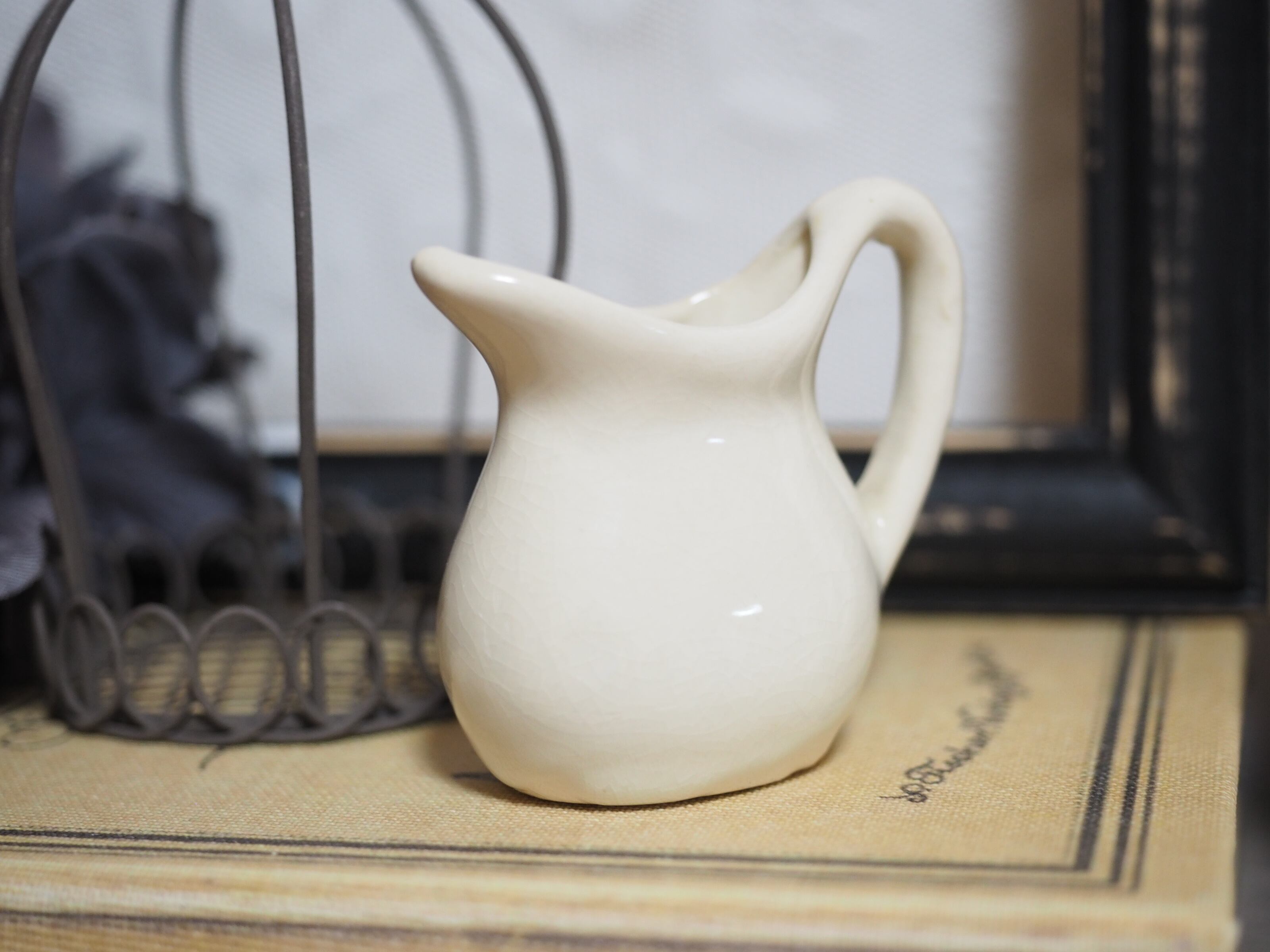 クリーム色のシンプルで小さな水差しです。色合いと全体に入った貫入がビンテージな風合い。(実際の方がこっくりしたベージュがかったクリーム色です)