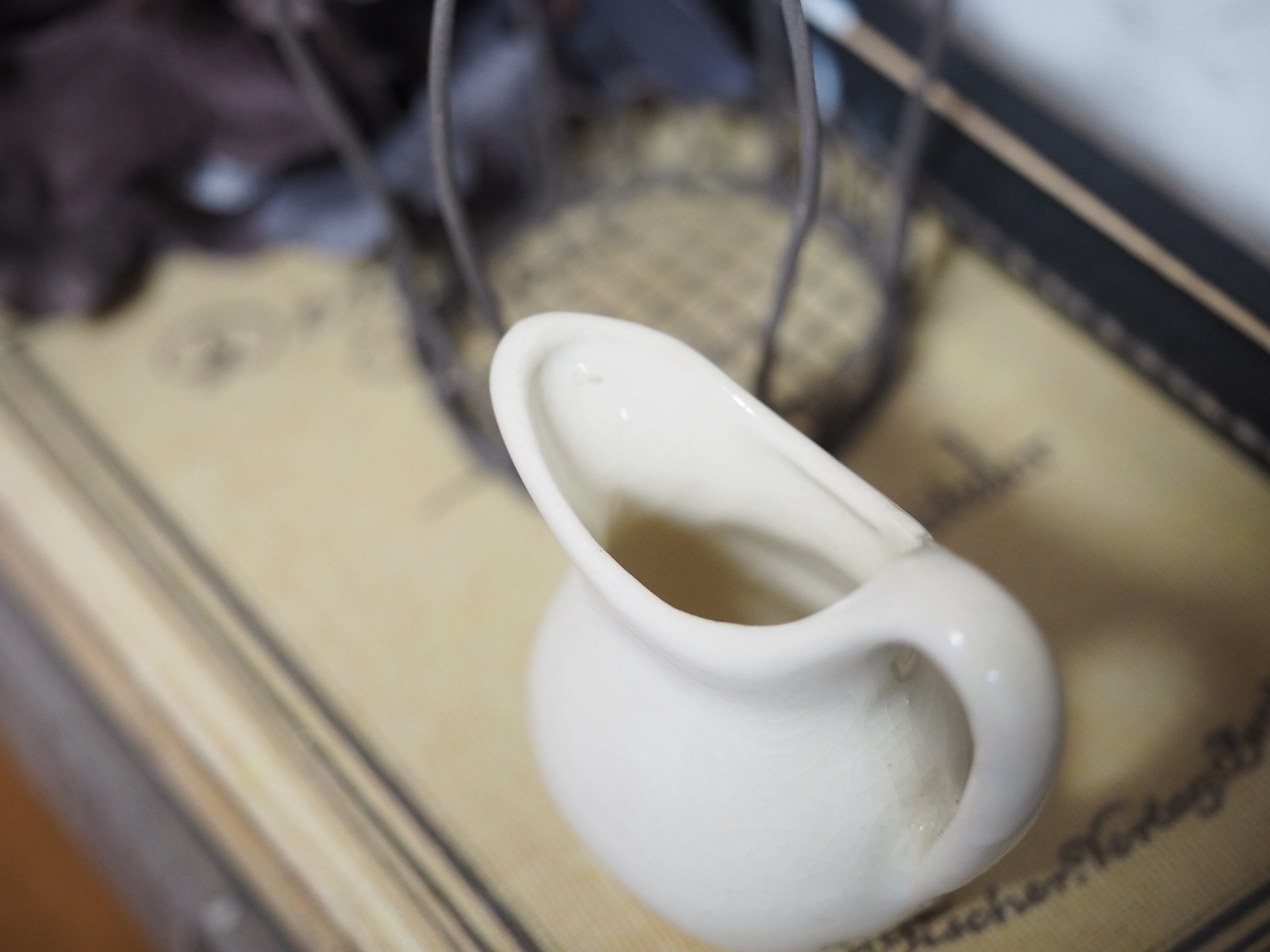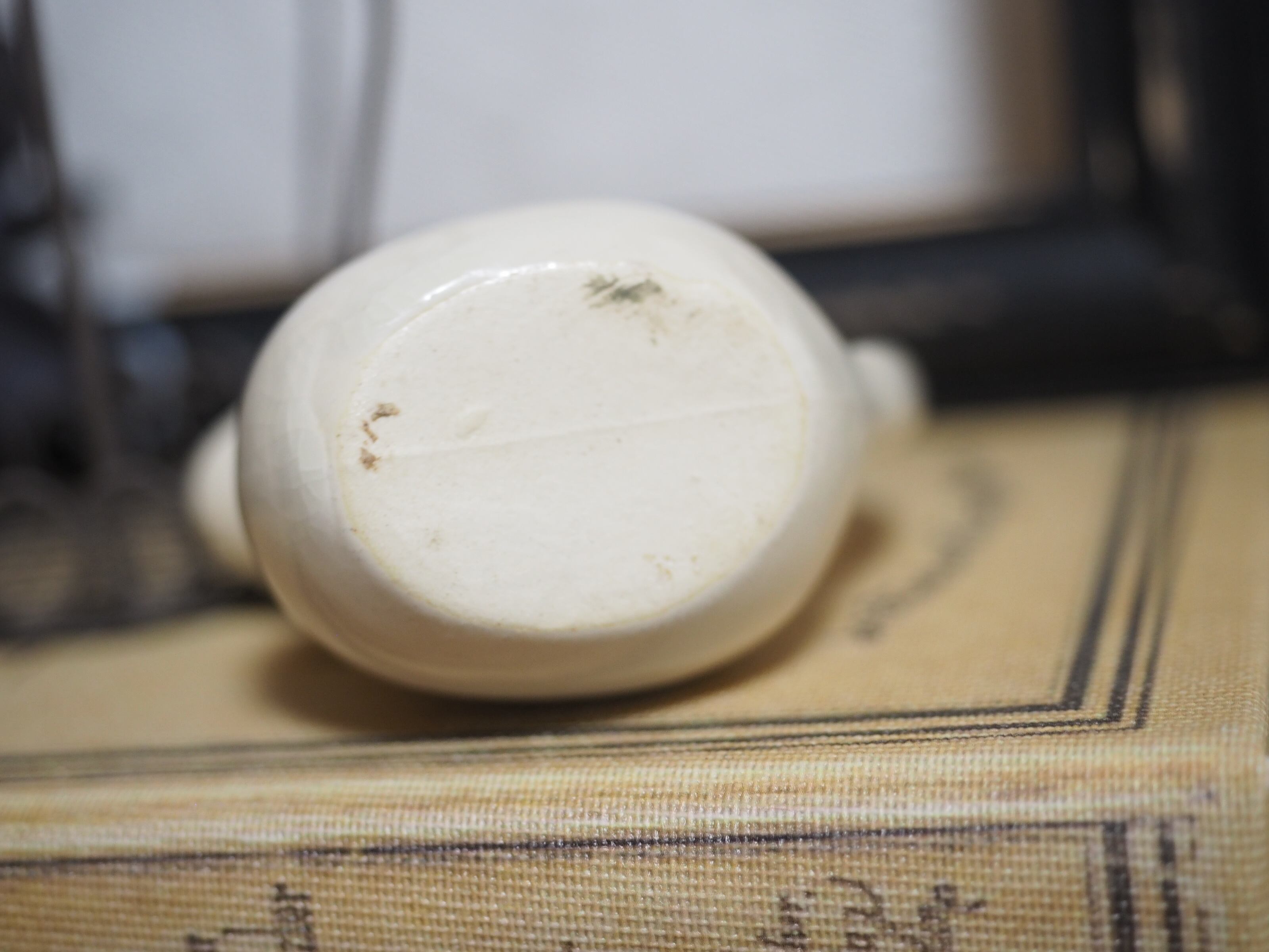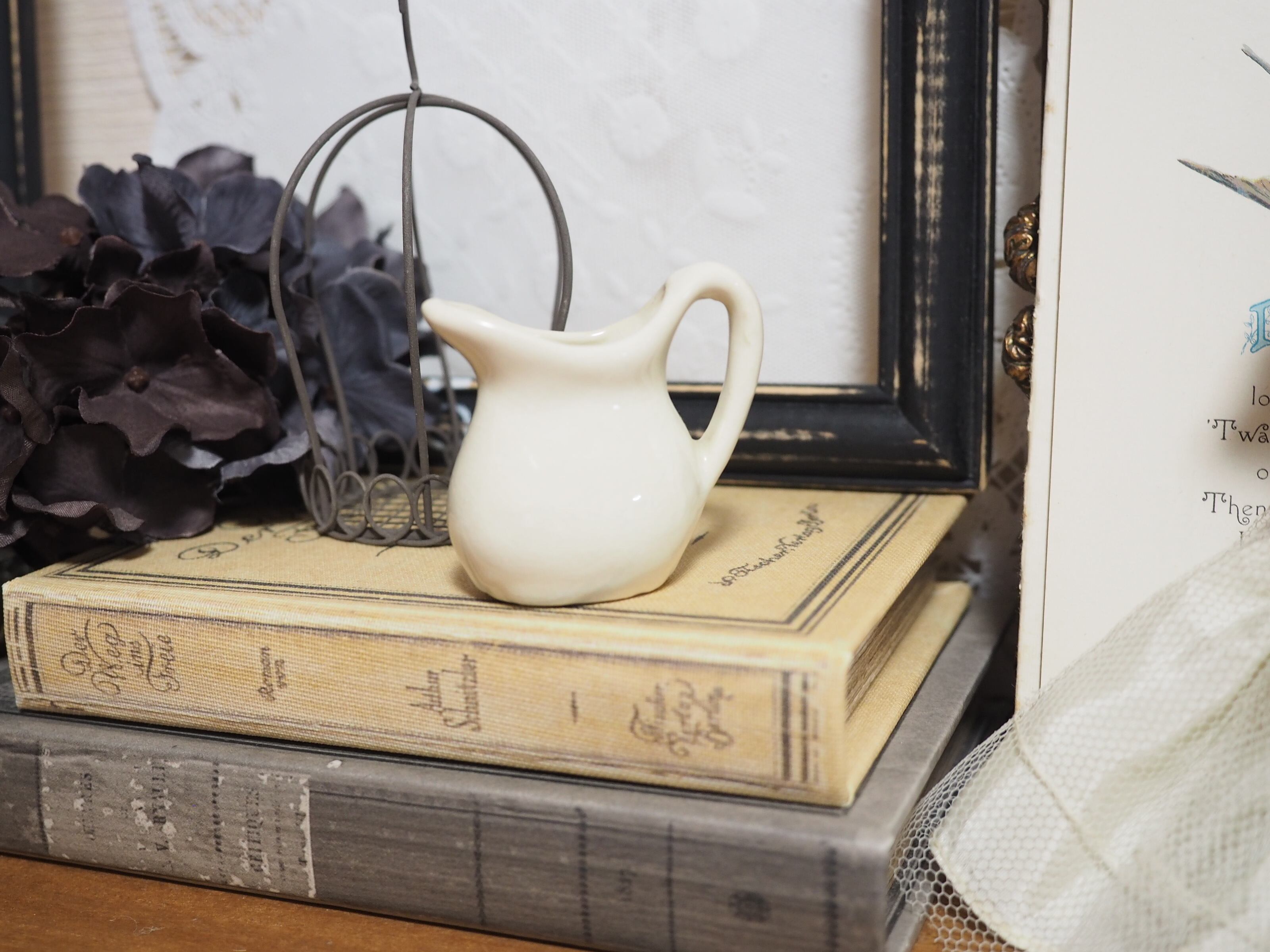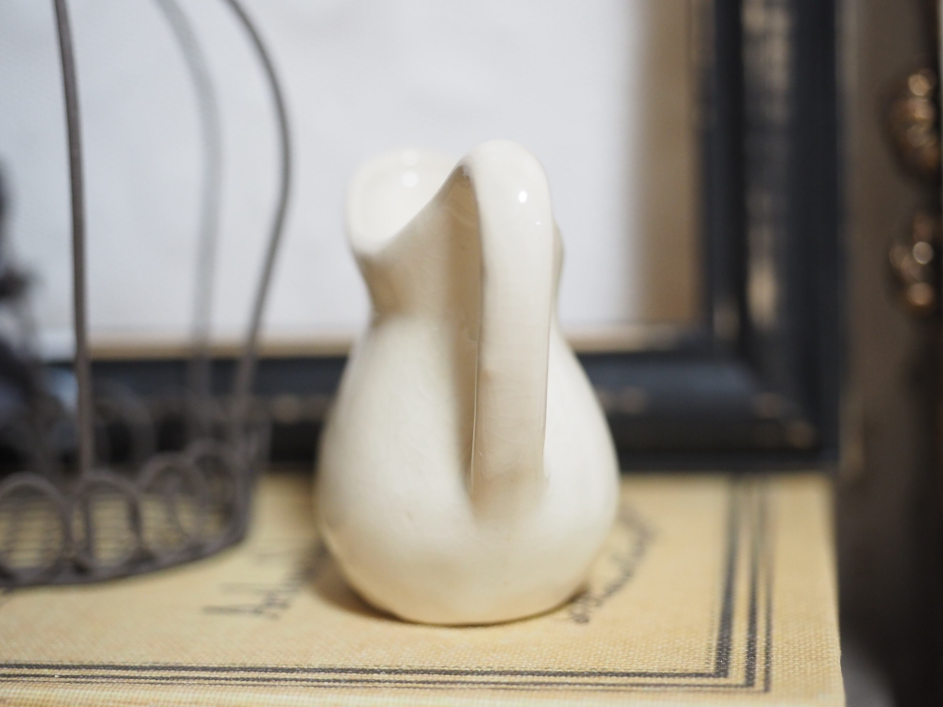 クリーム色のシンプルで小さな水差しです。色合いと全体に入った貫入がビンテージな風合い。(実際の方がこっくりしたベージュがかったクリーム色です)