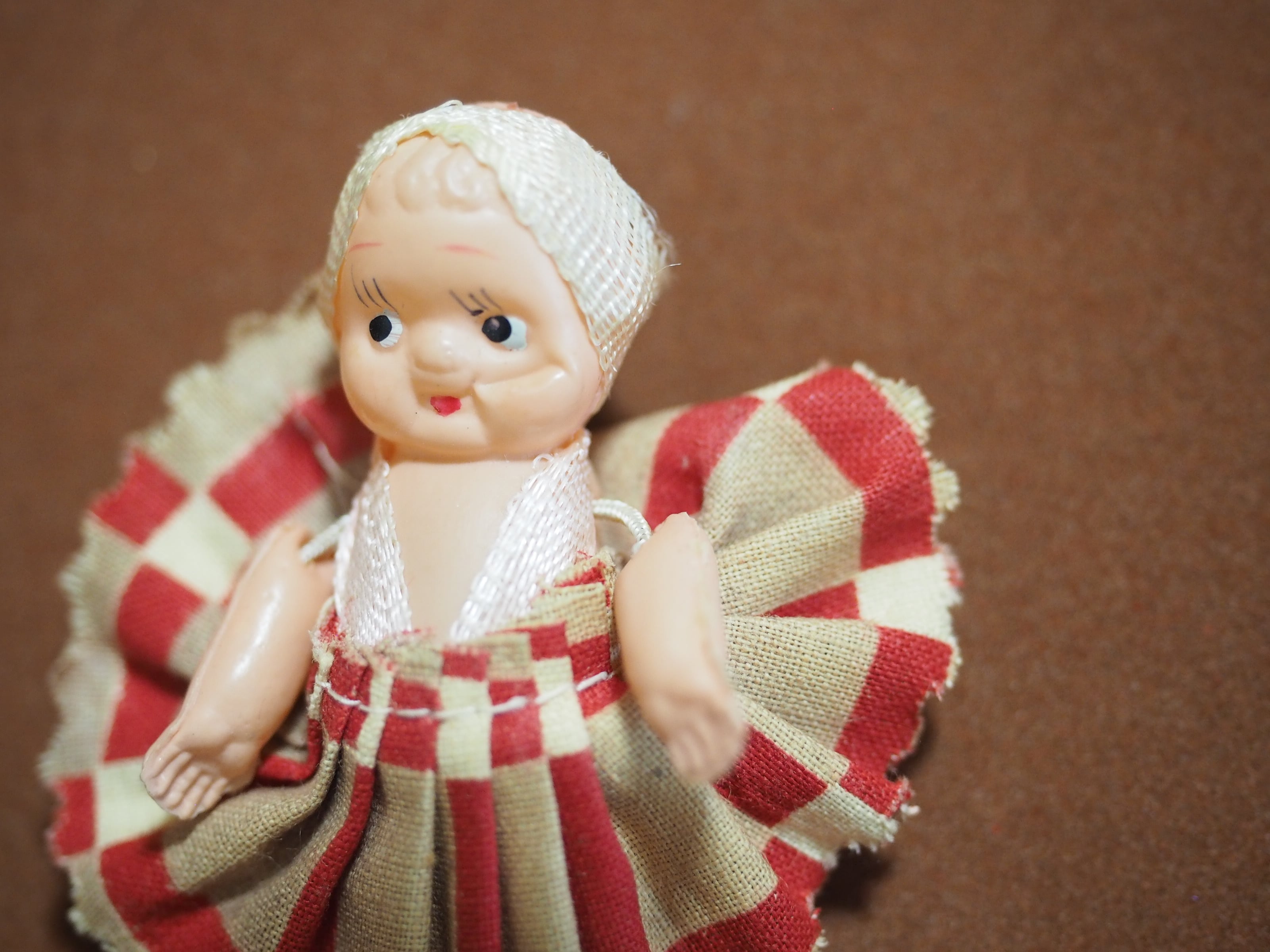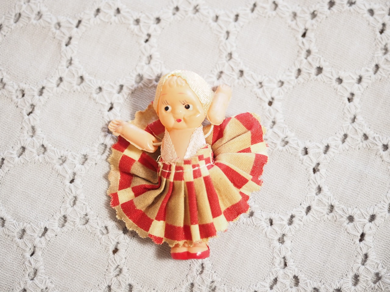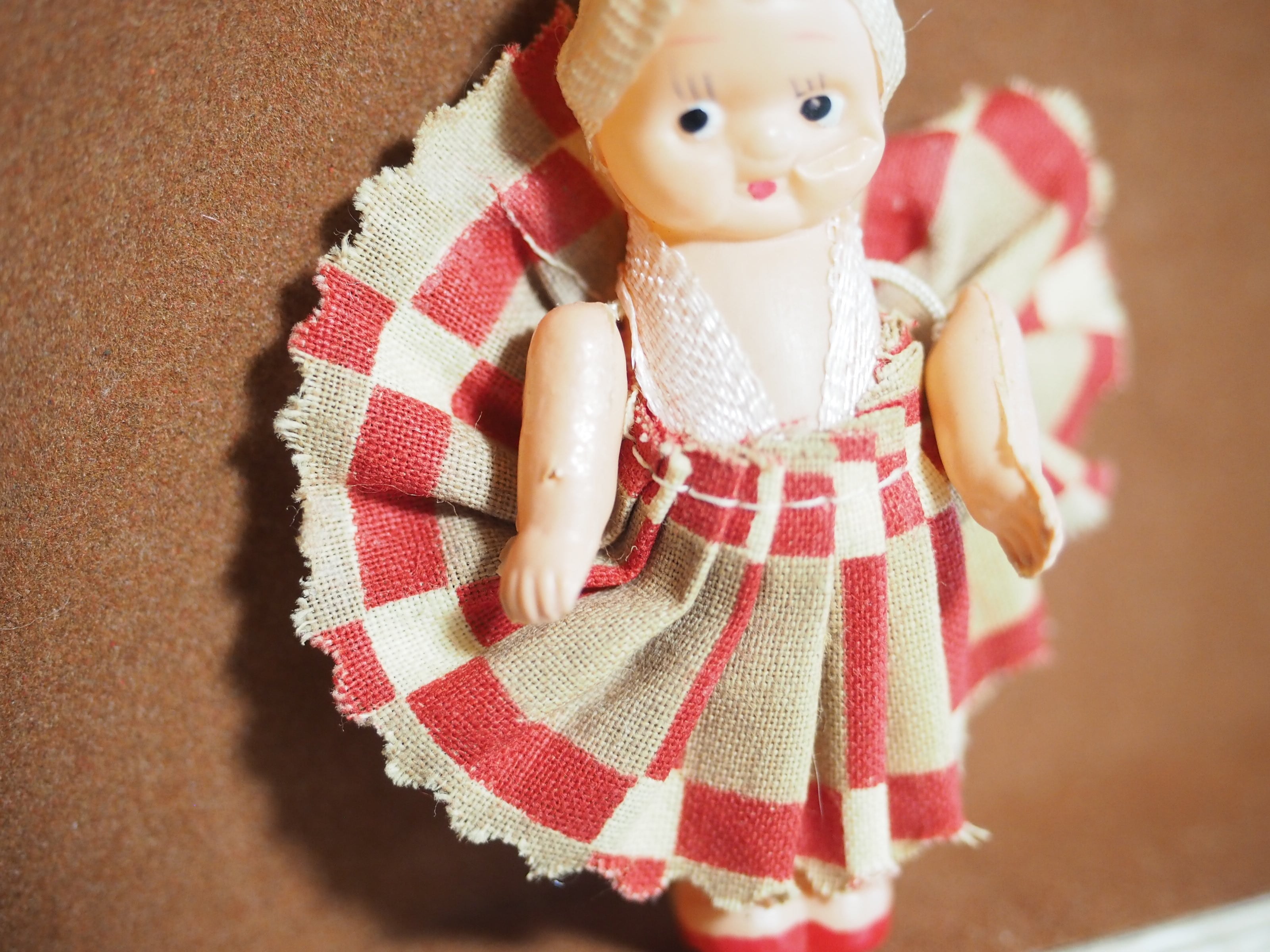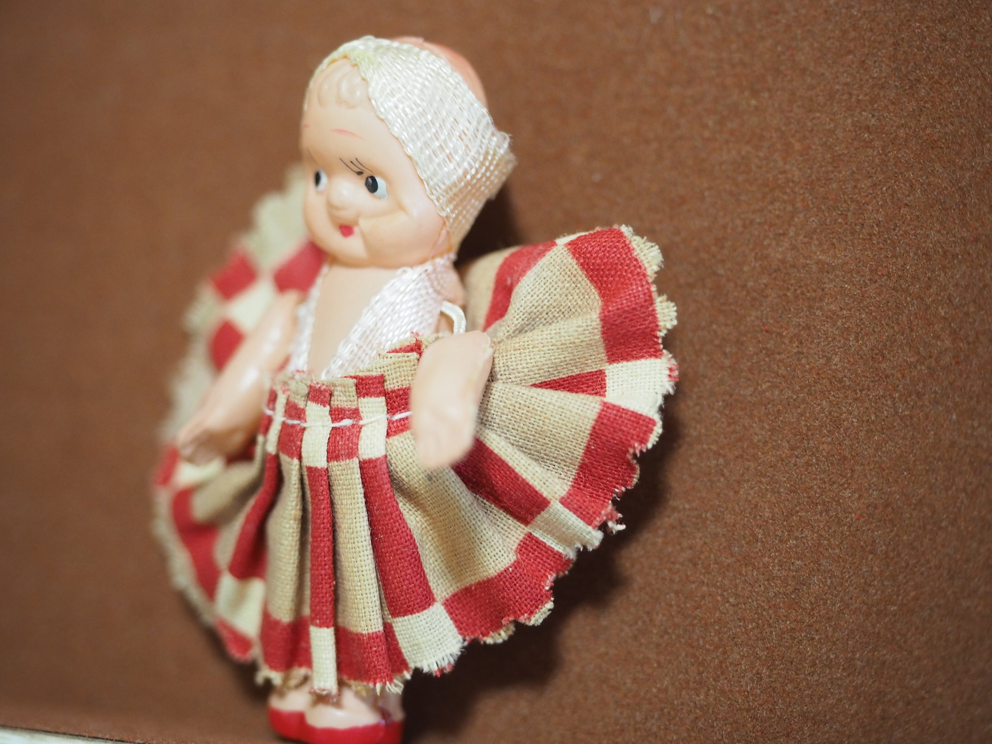 ちっちゃなキューピーですが、頭にはターバン、和テイストのチェックのようなプリーツスカートがおしゃれです。