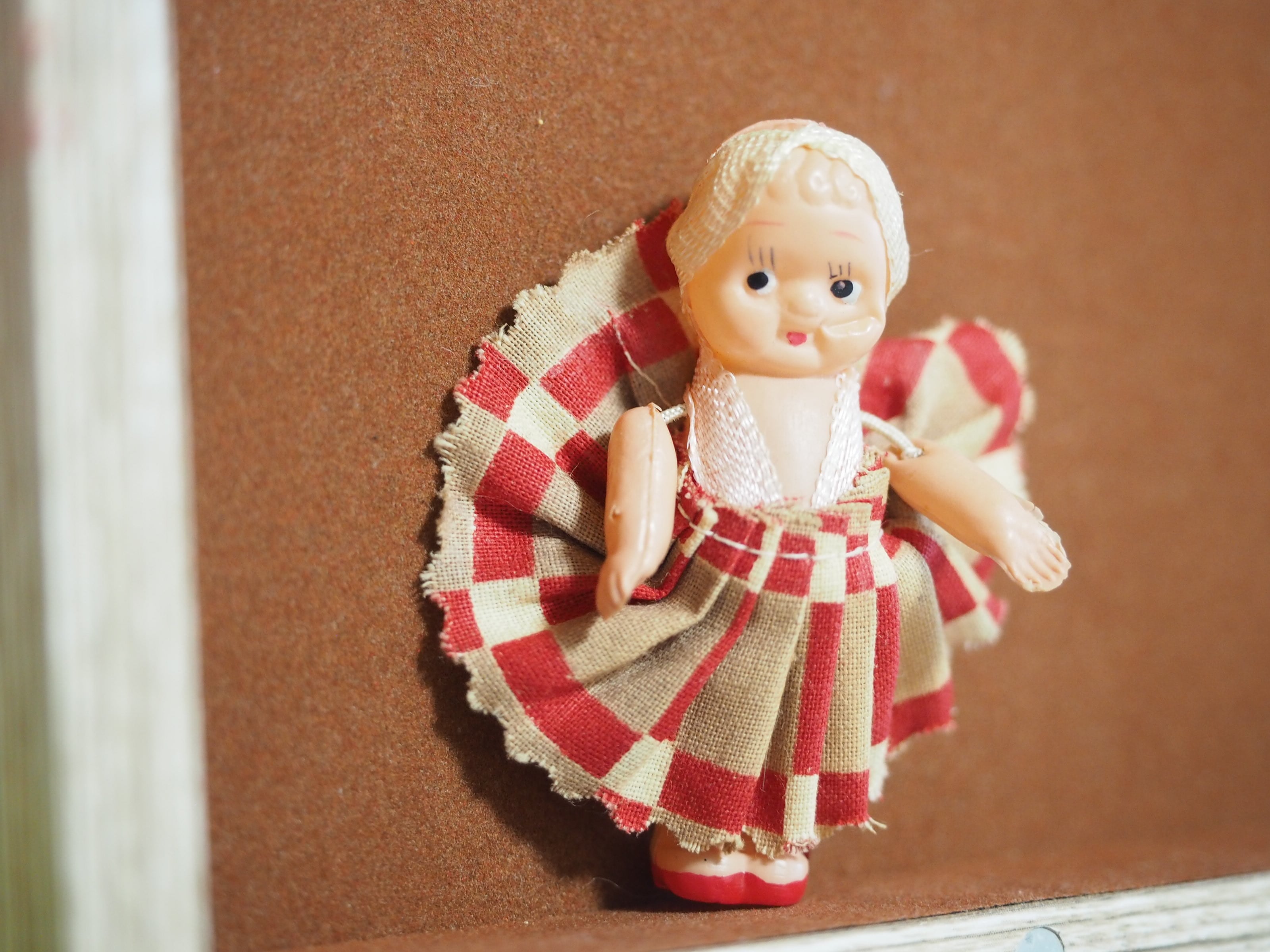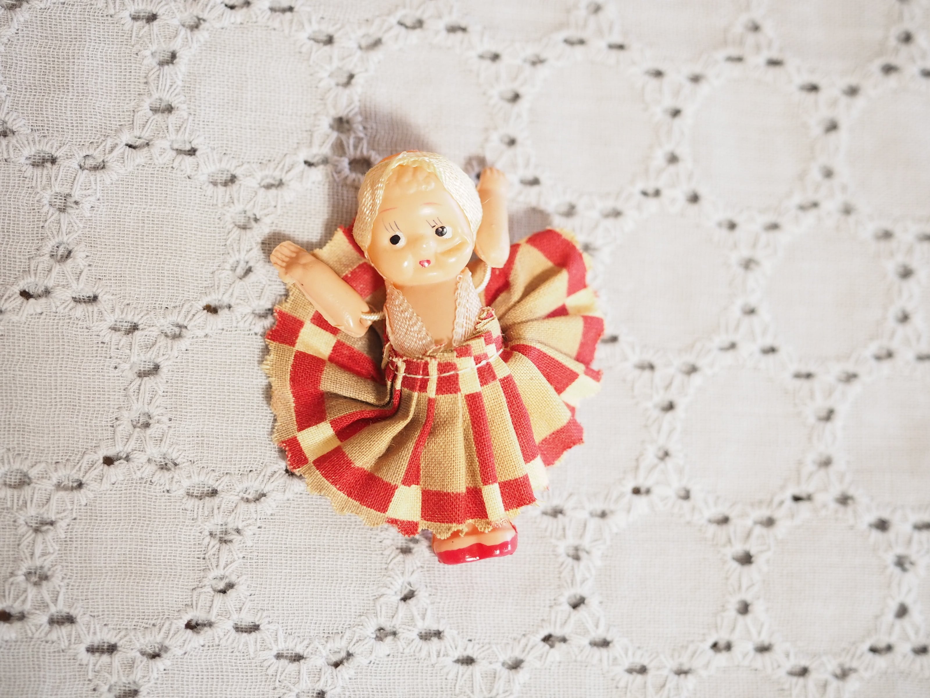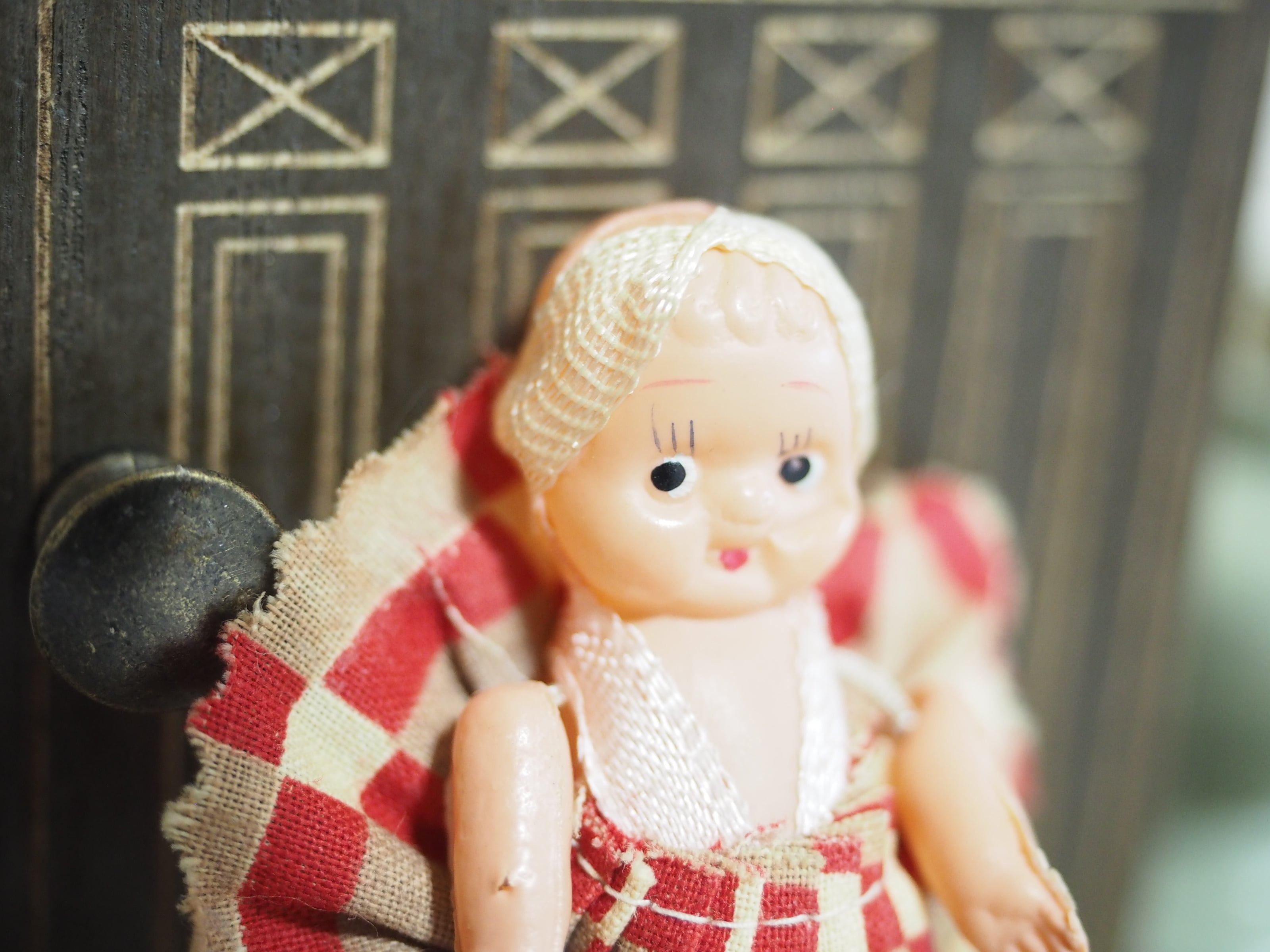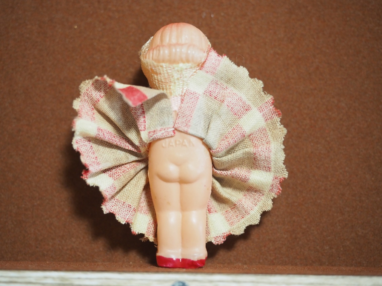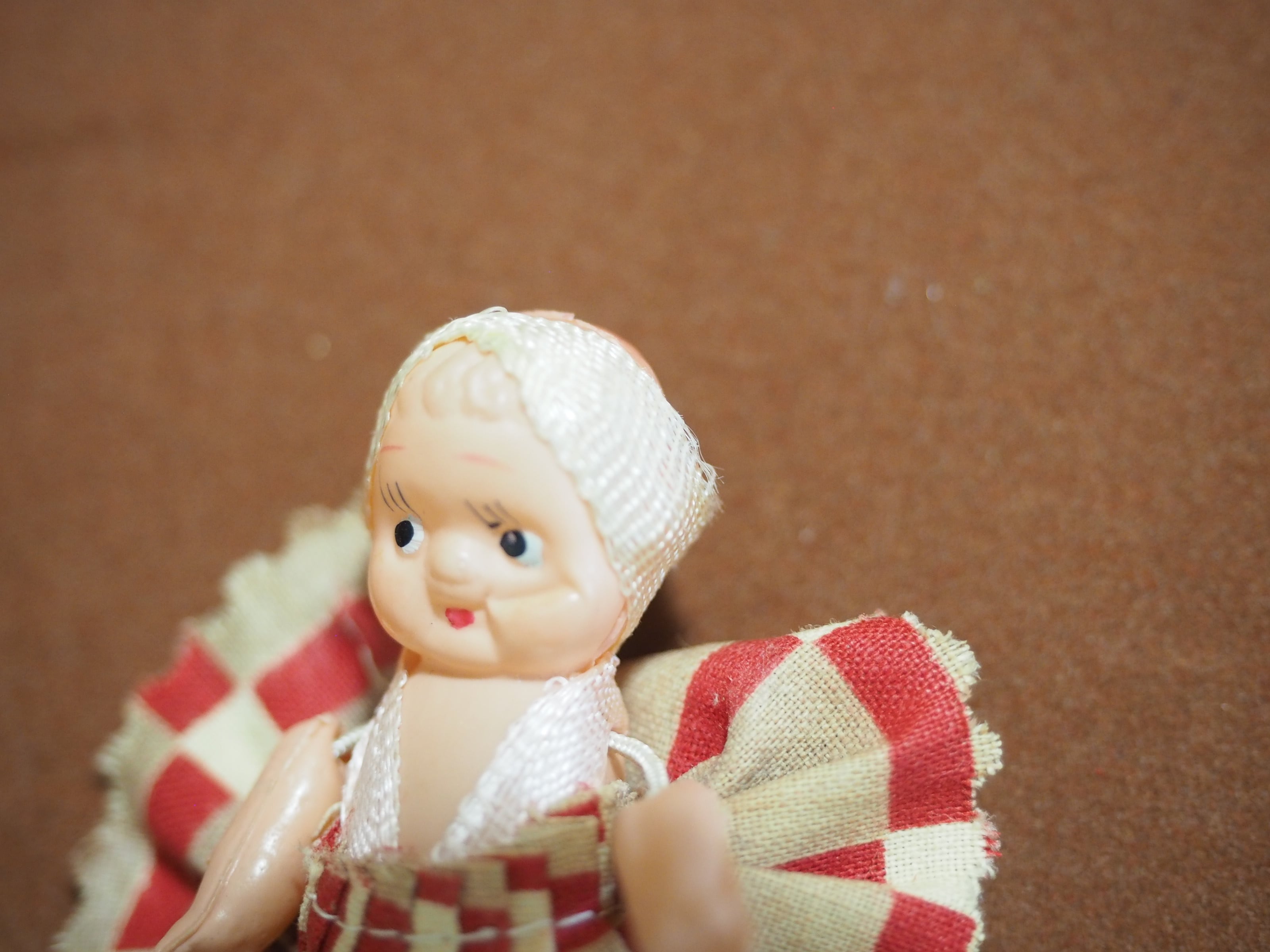 ちっちゃなキューピーですが、頭にはターバン、和テイストのチェックのようなプリーツスカートがおしゃれです。