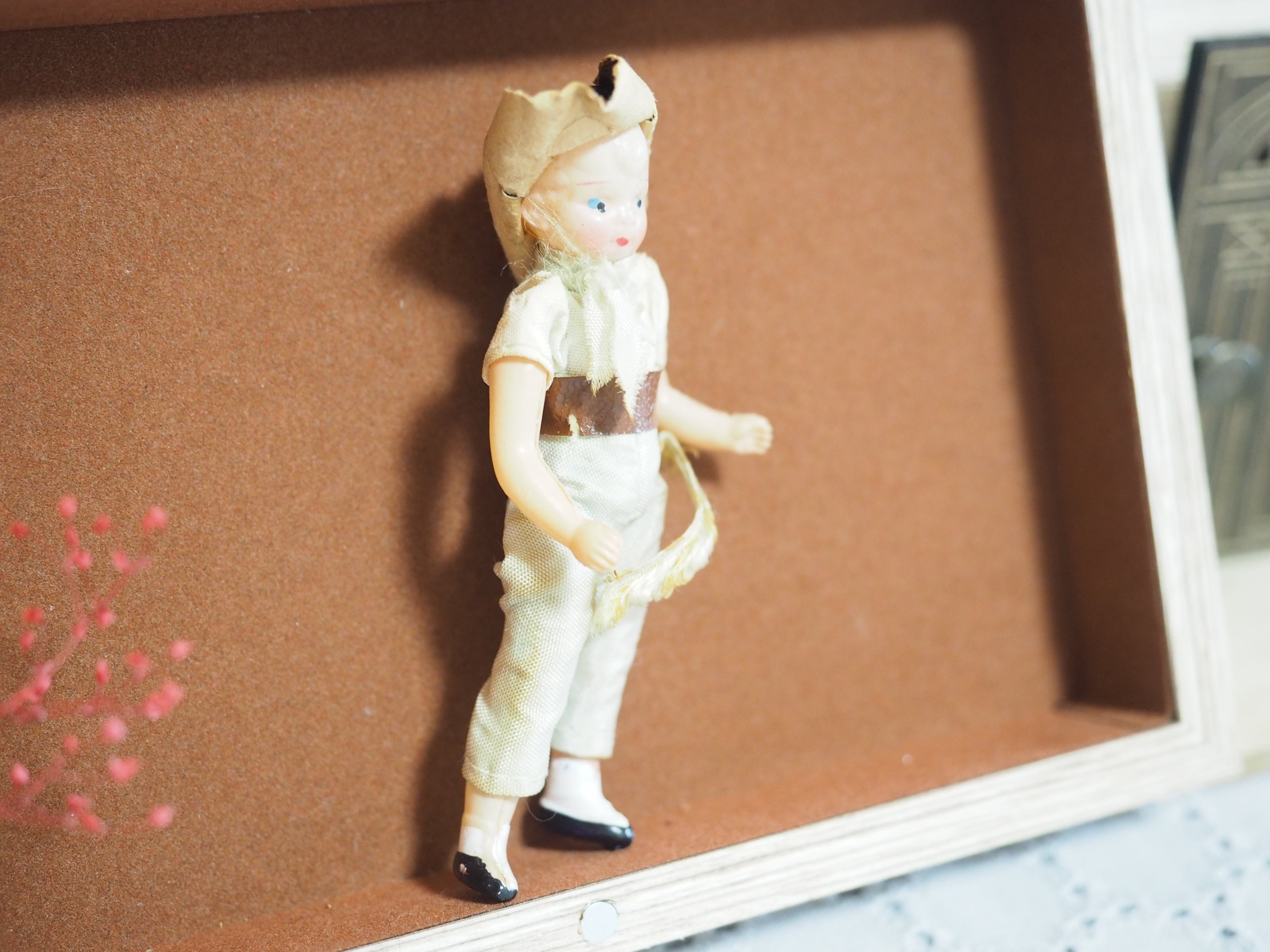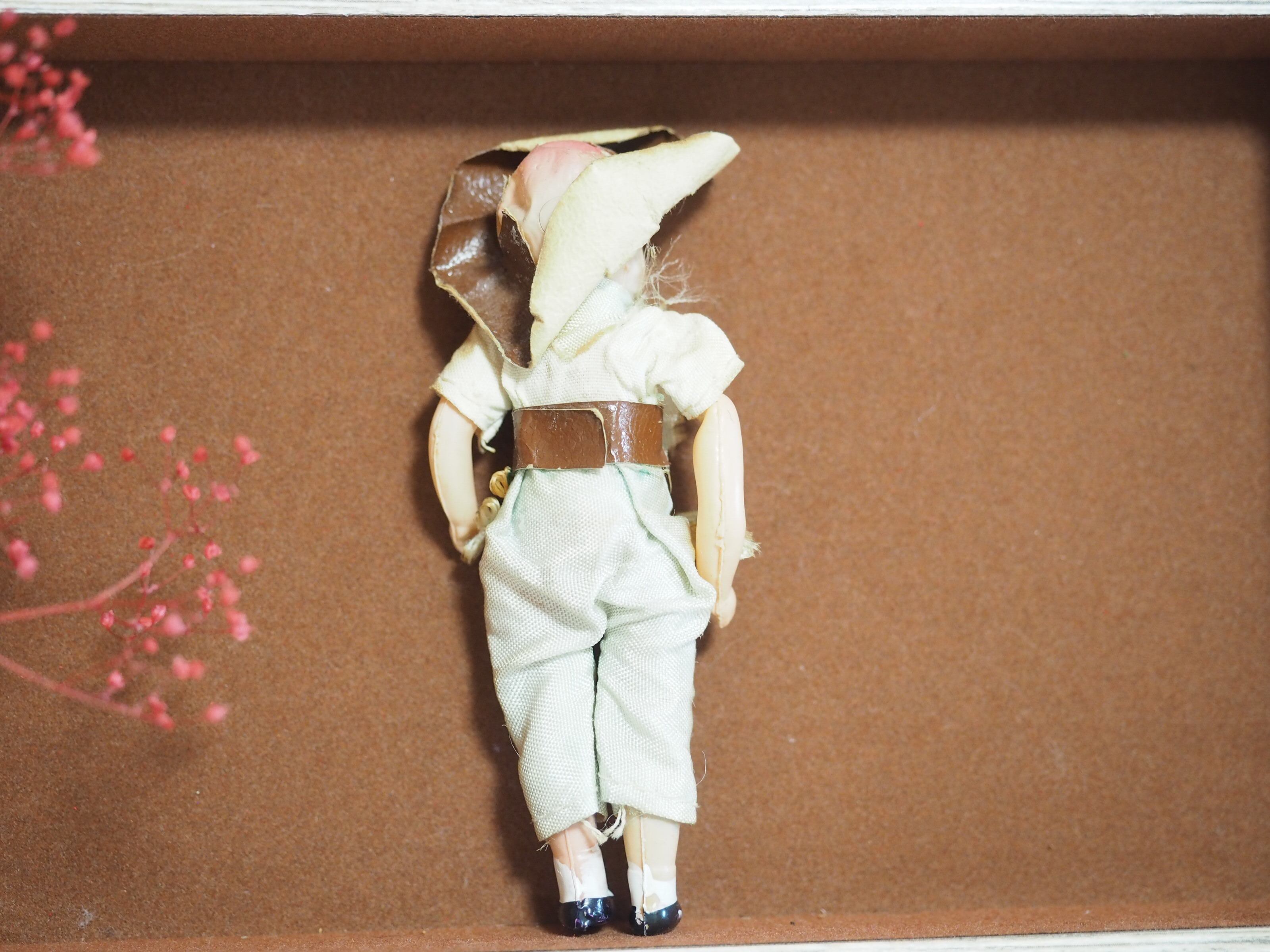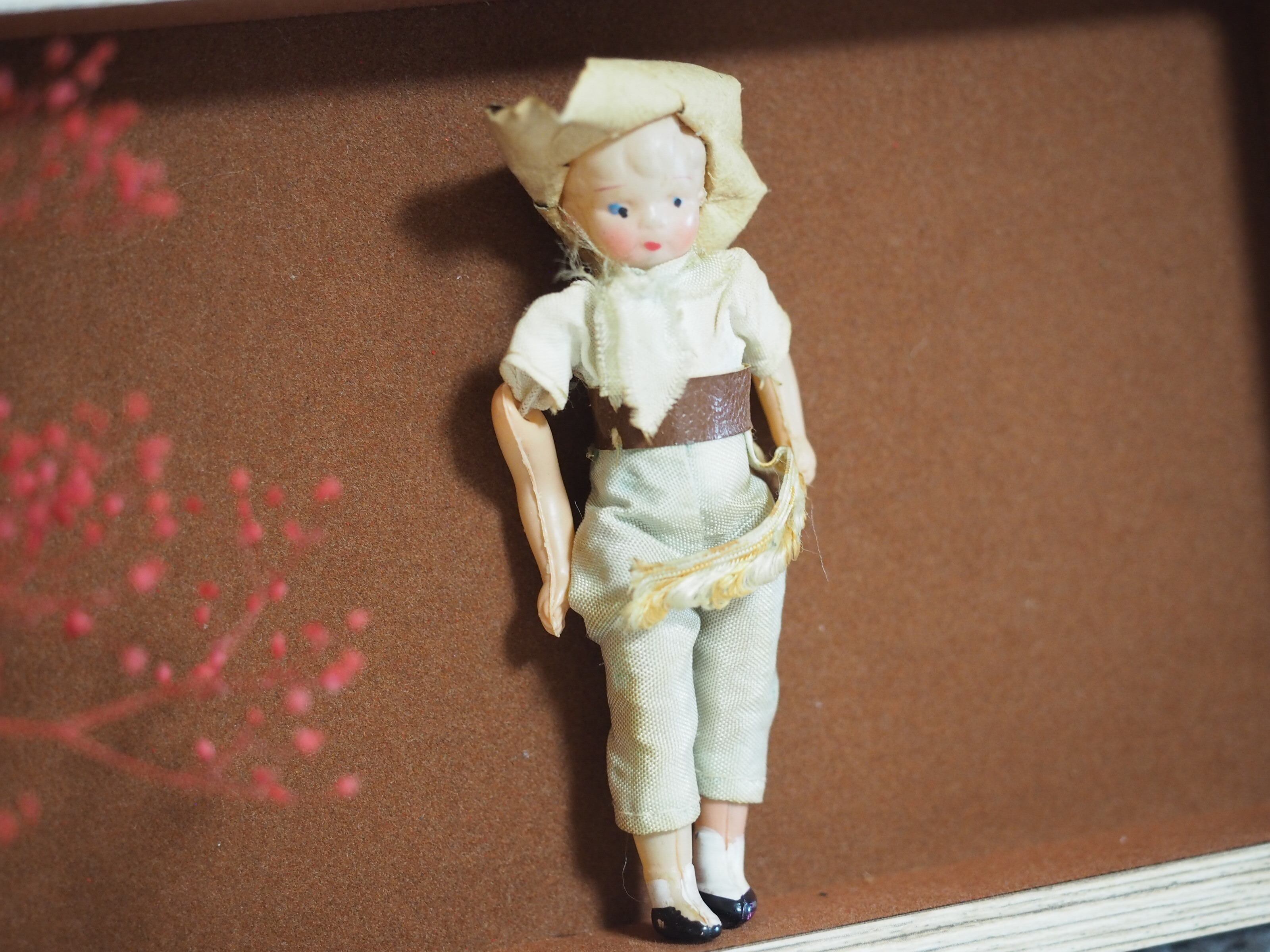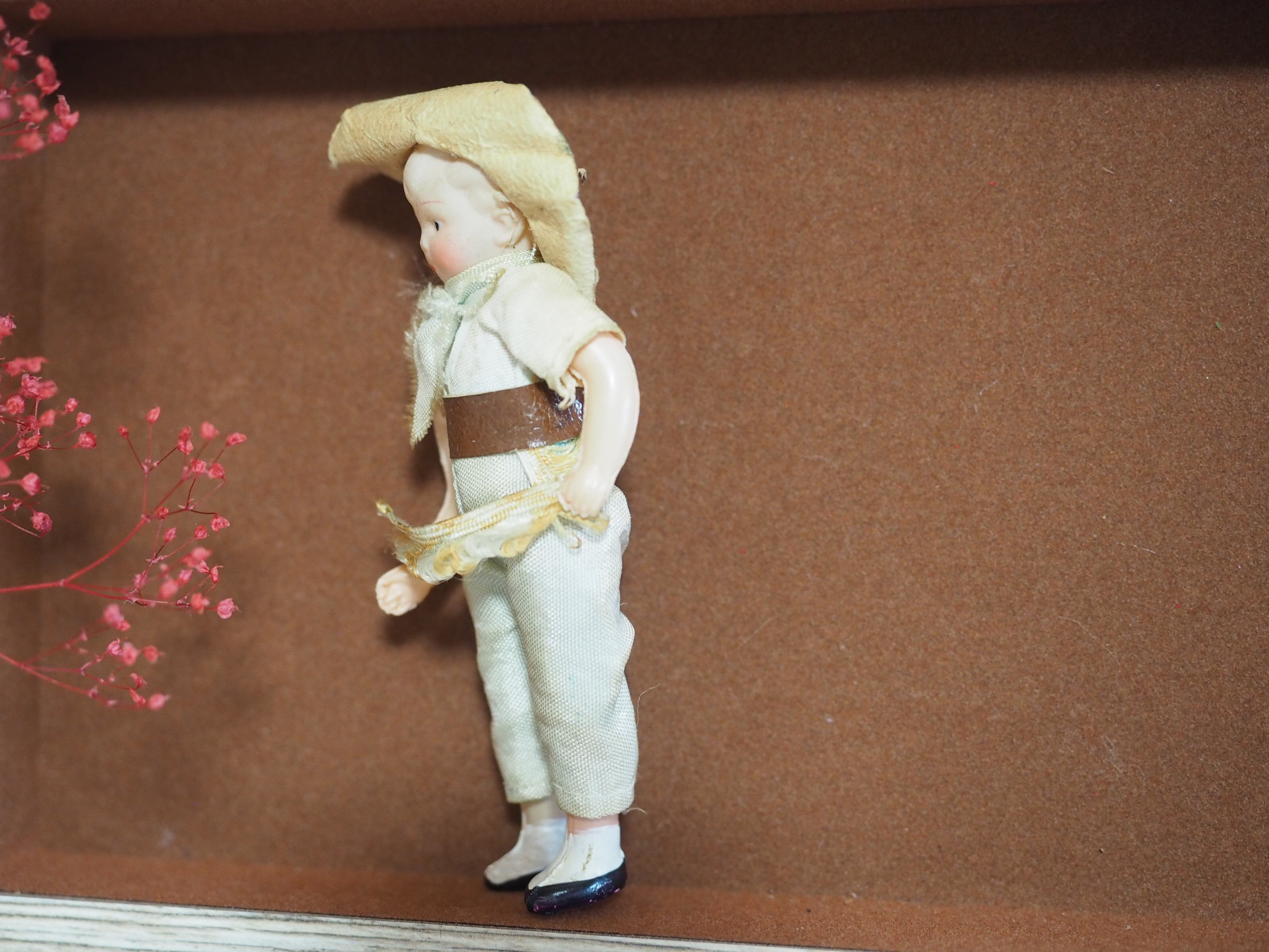 小さく繊細でおしゃれなお洋服を着たセルロイドの男の子です。