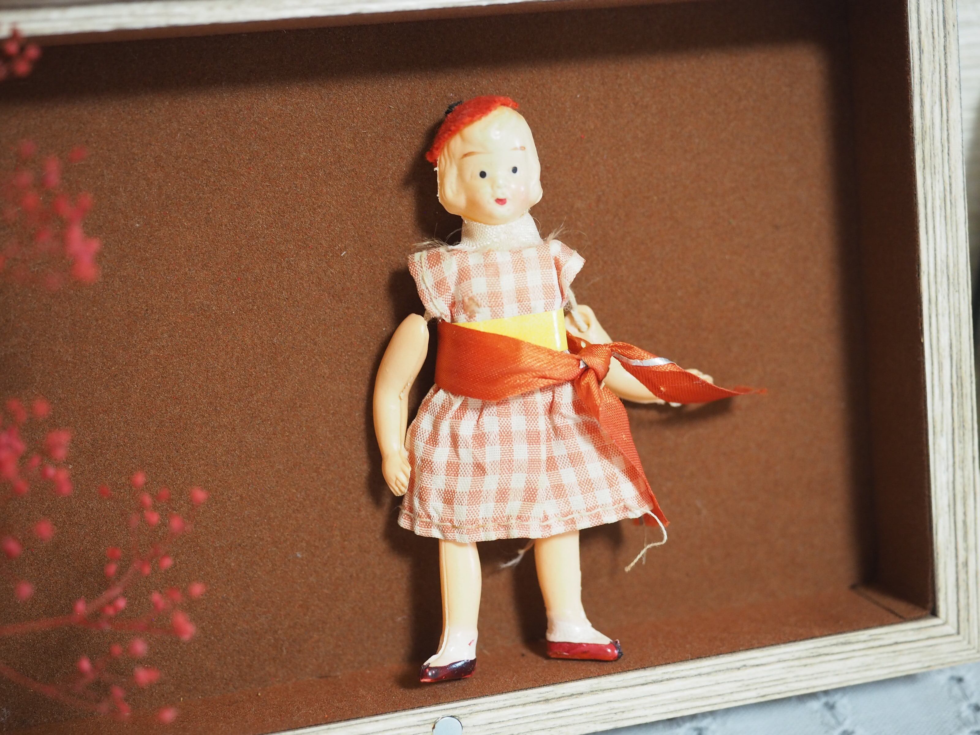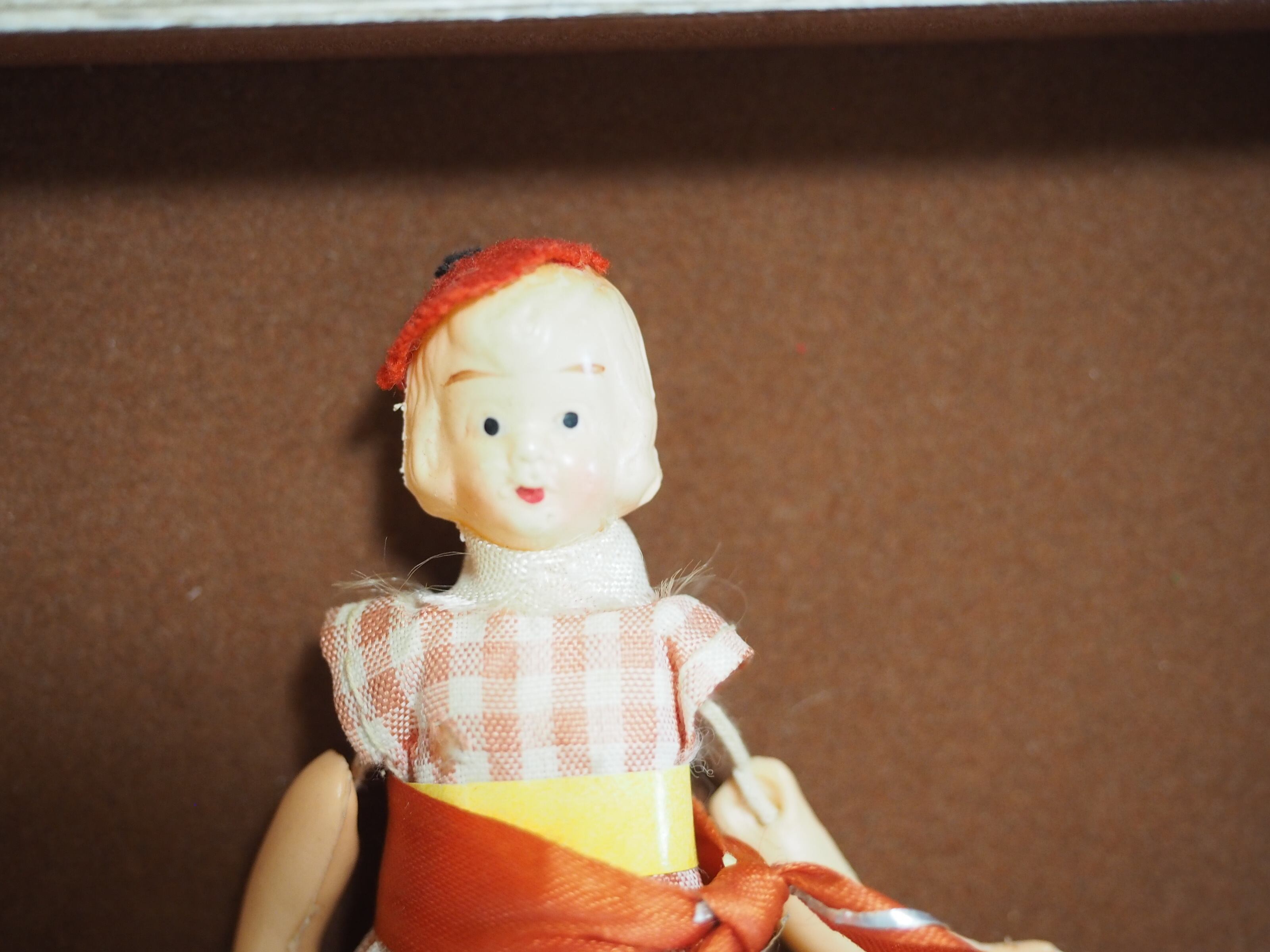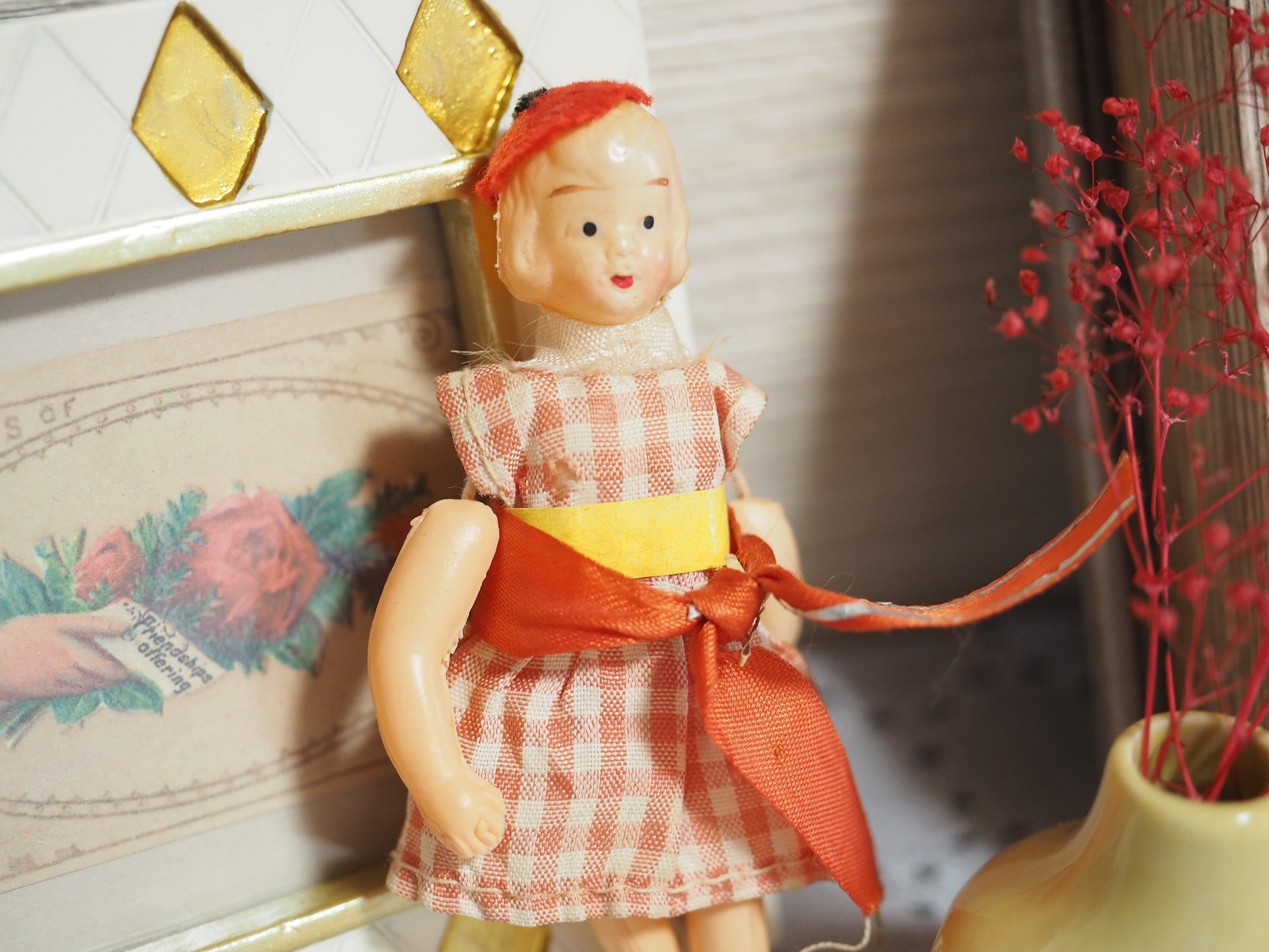 小さく繊細でおしゃれなお洋服を着たセルロイドの女の子です。