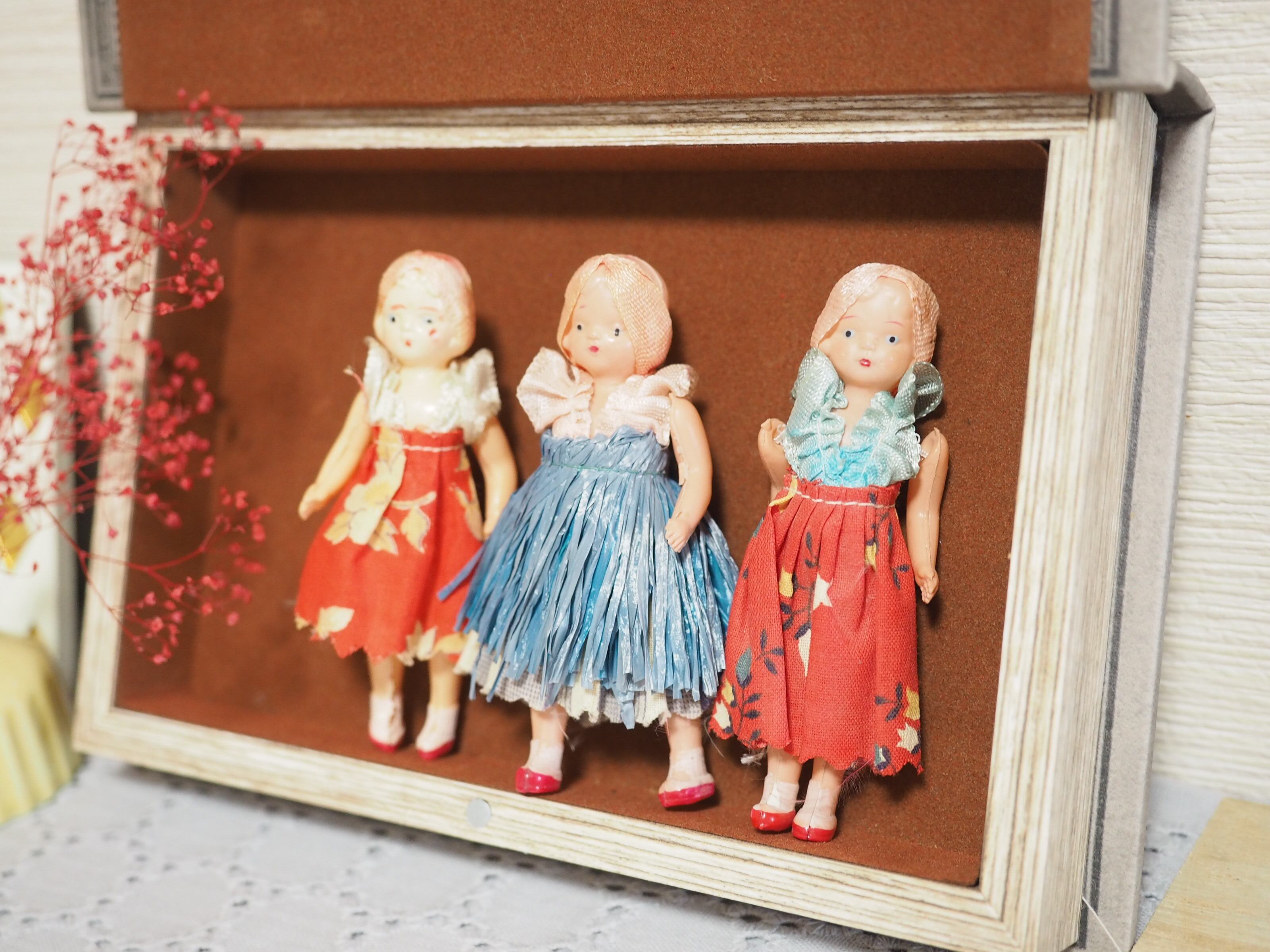 繊細なセルロイドのお人形に、1体1体異なるお洋服が着せられています。