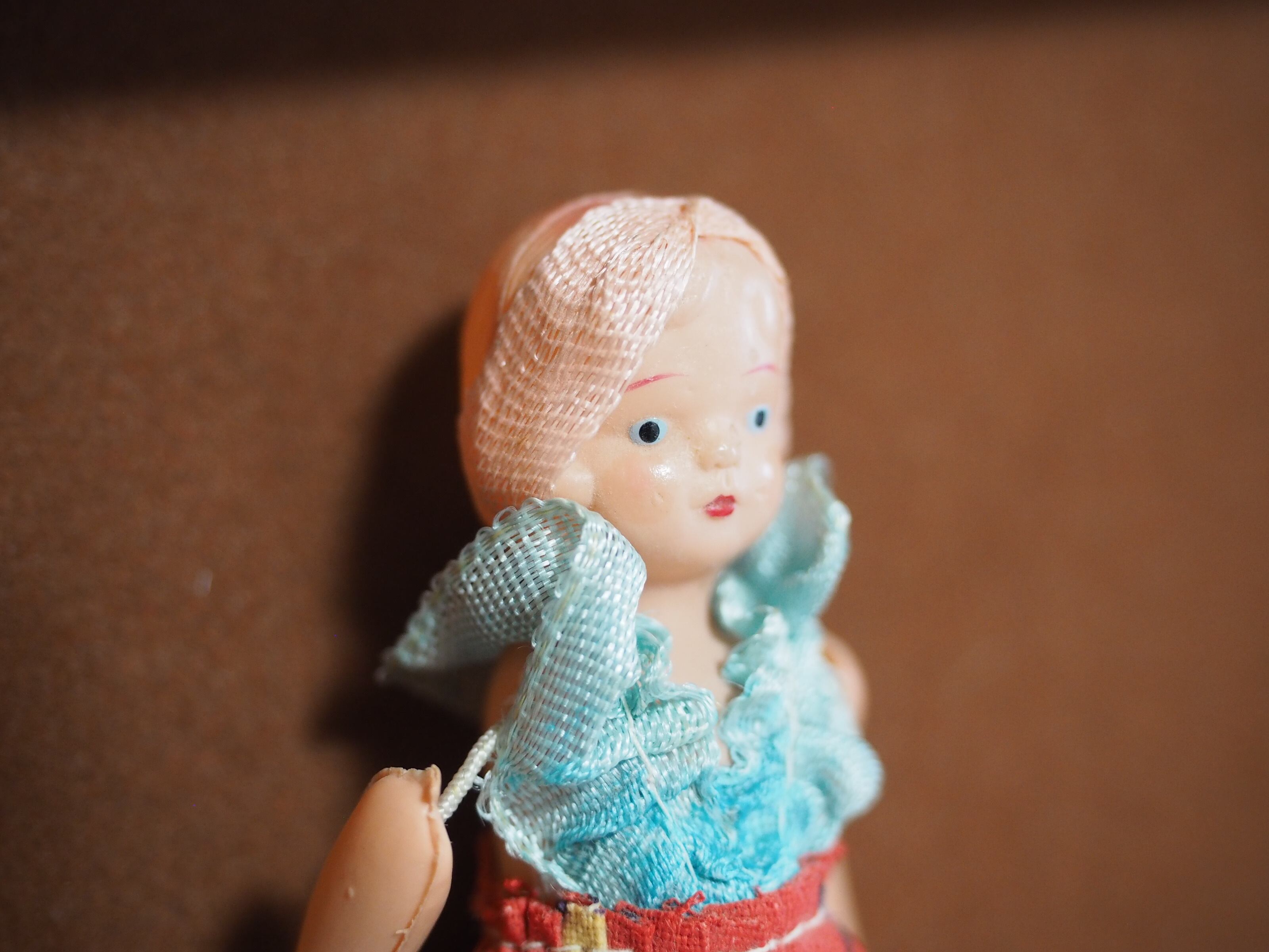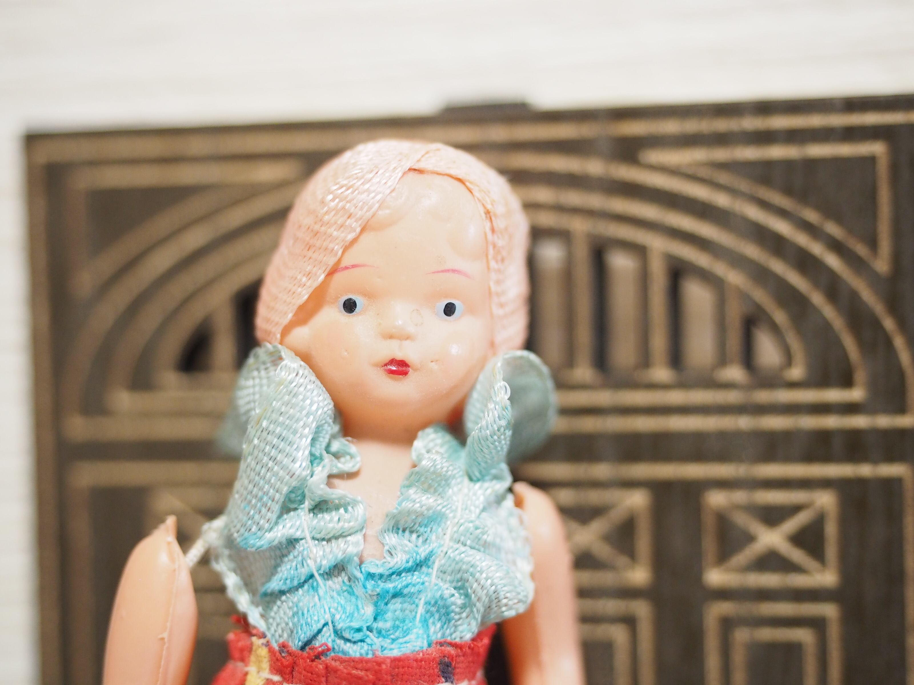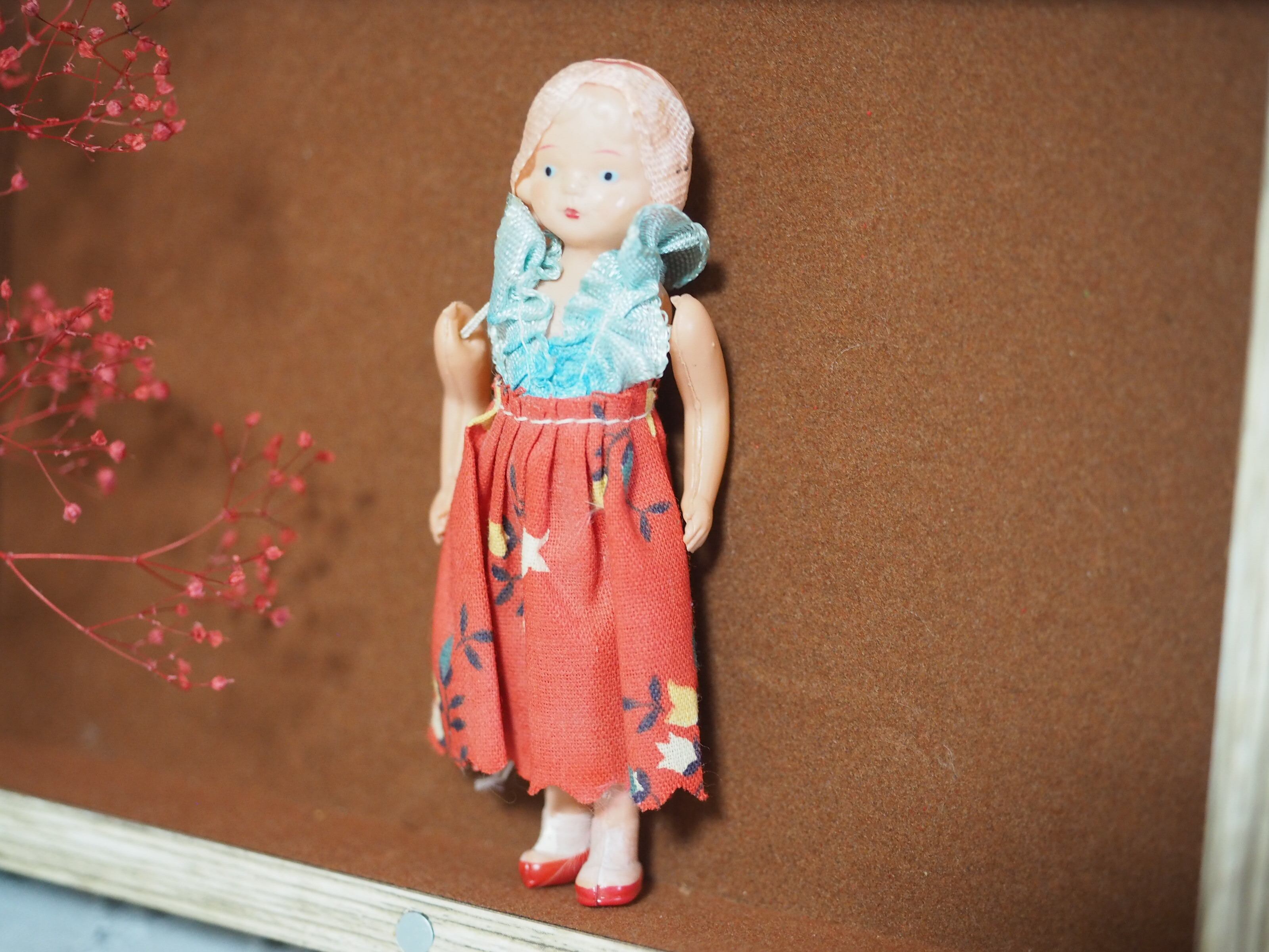 小さく繊細でおしゃれなお洋服を着たセルロイドの女の子です。