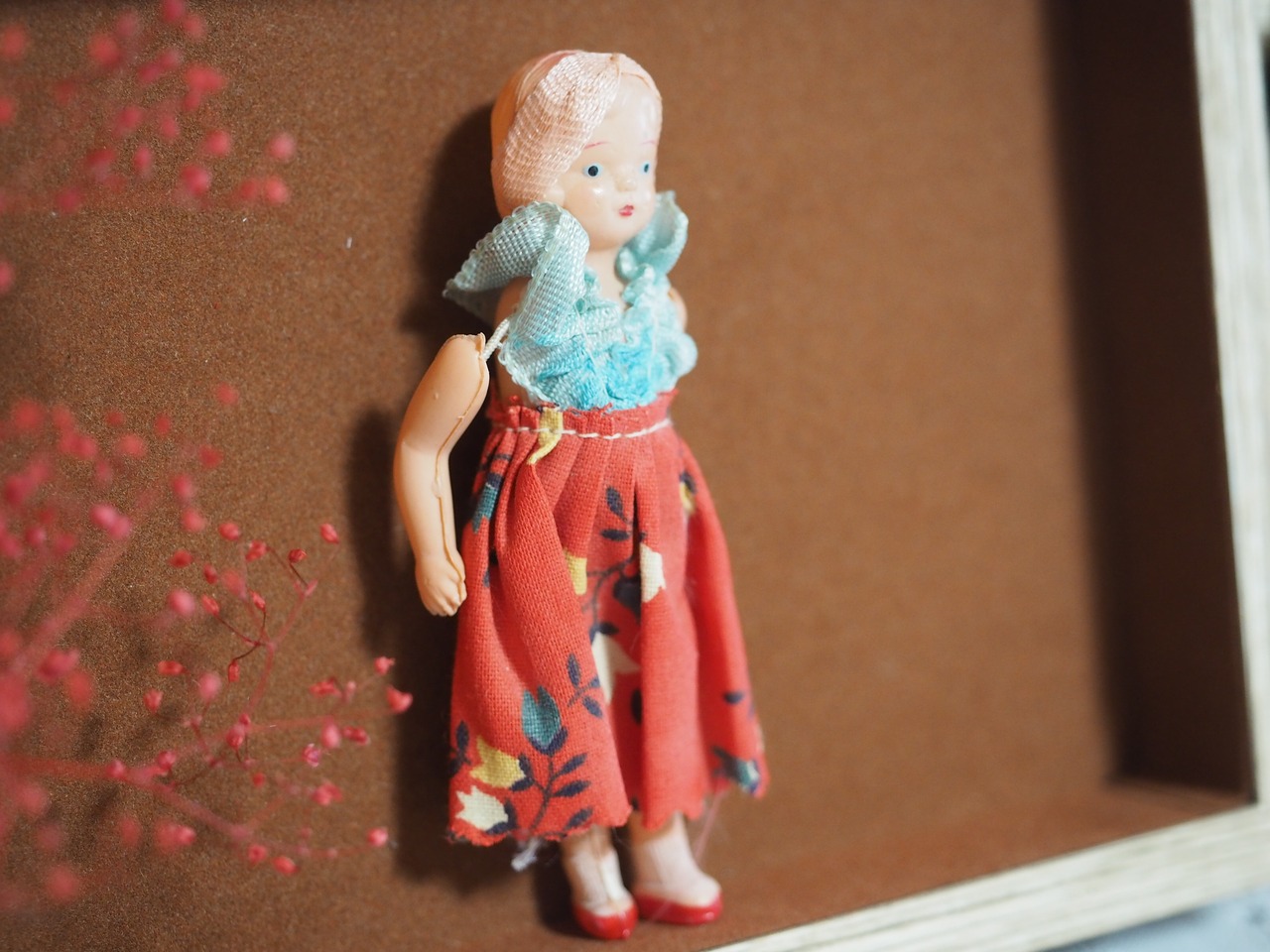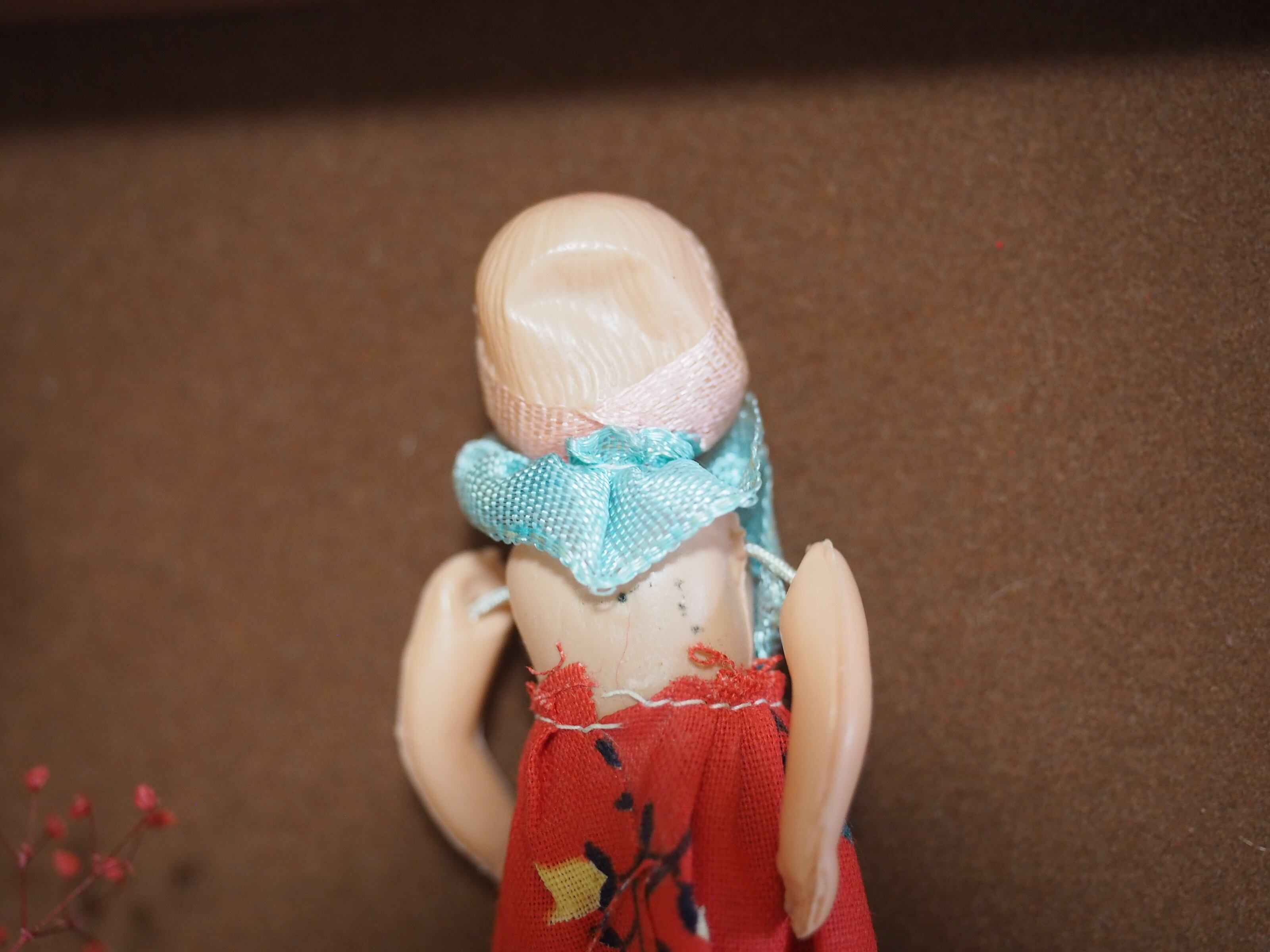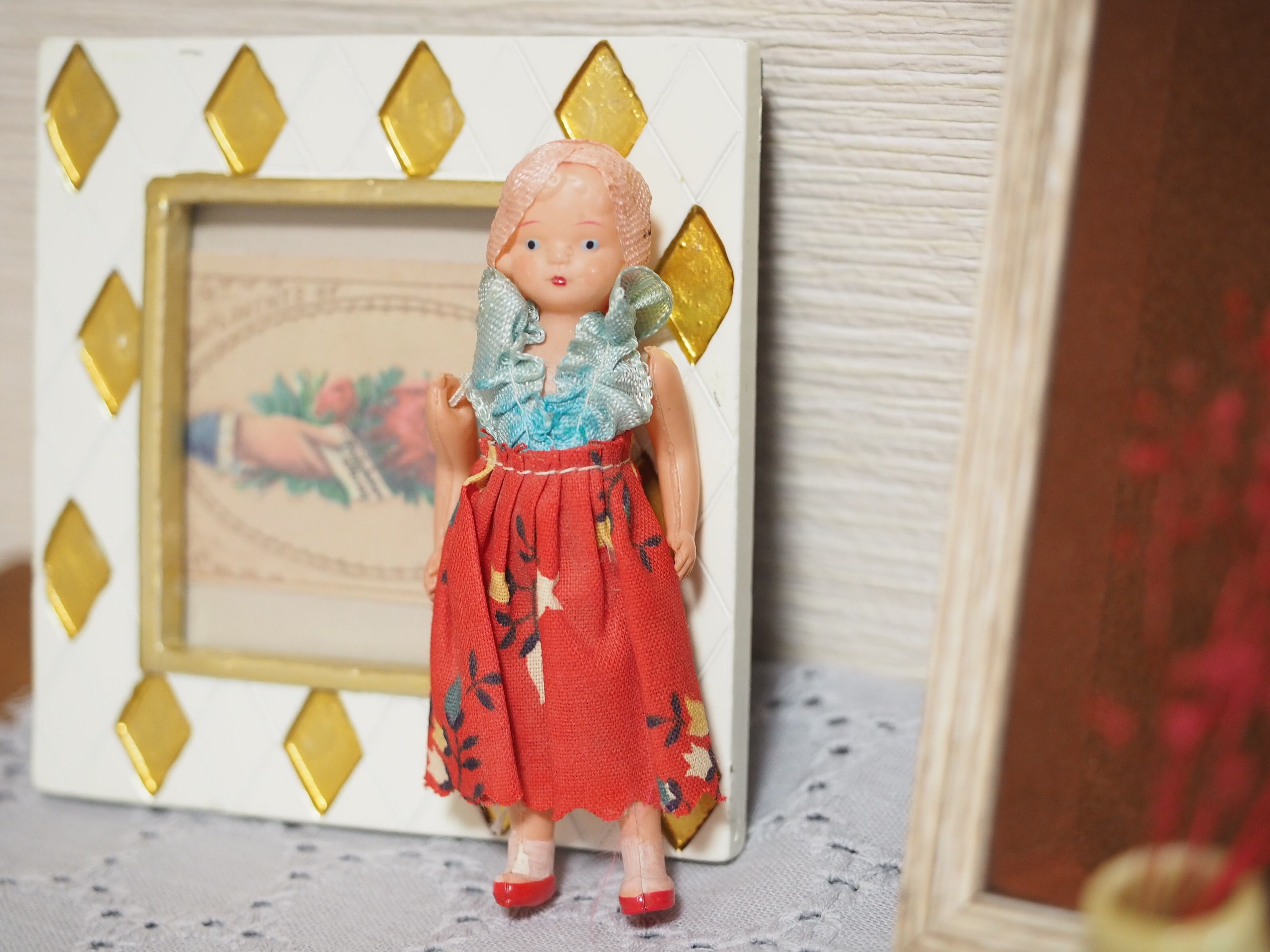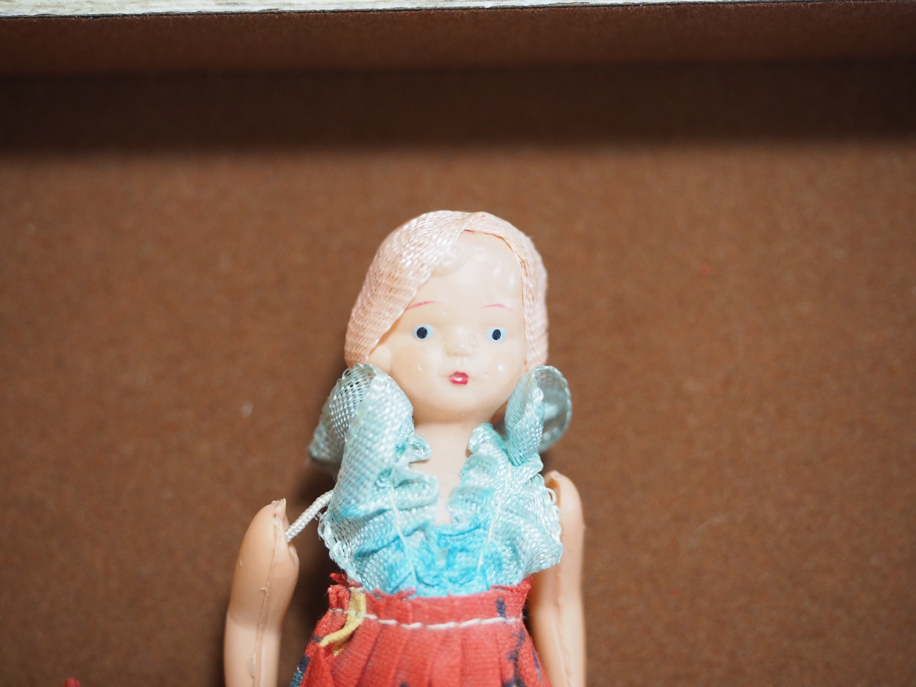 小さく繊細でおしゃれなお洋服を着たセルロイドの女の子です。