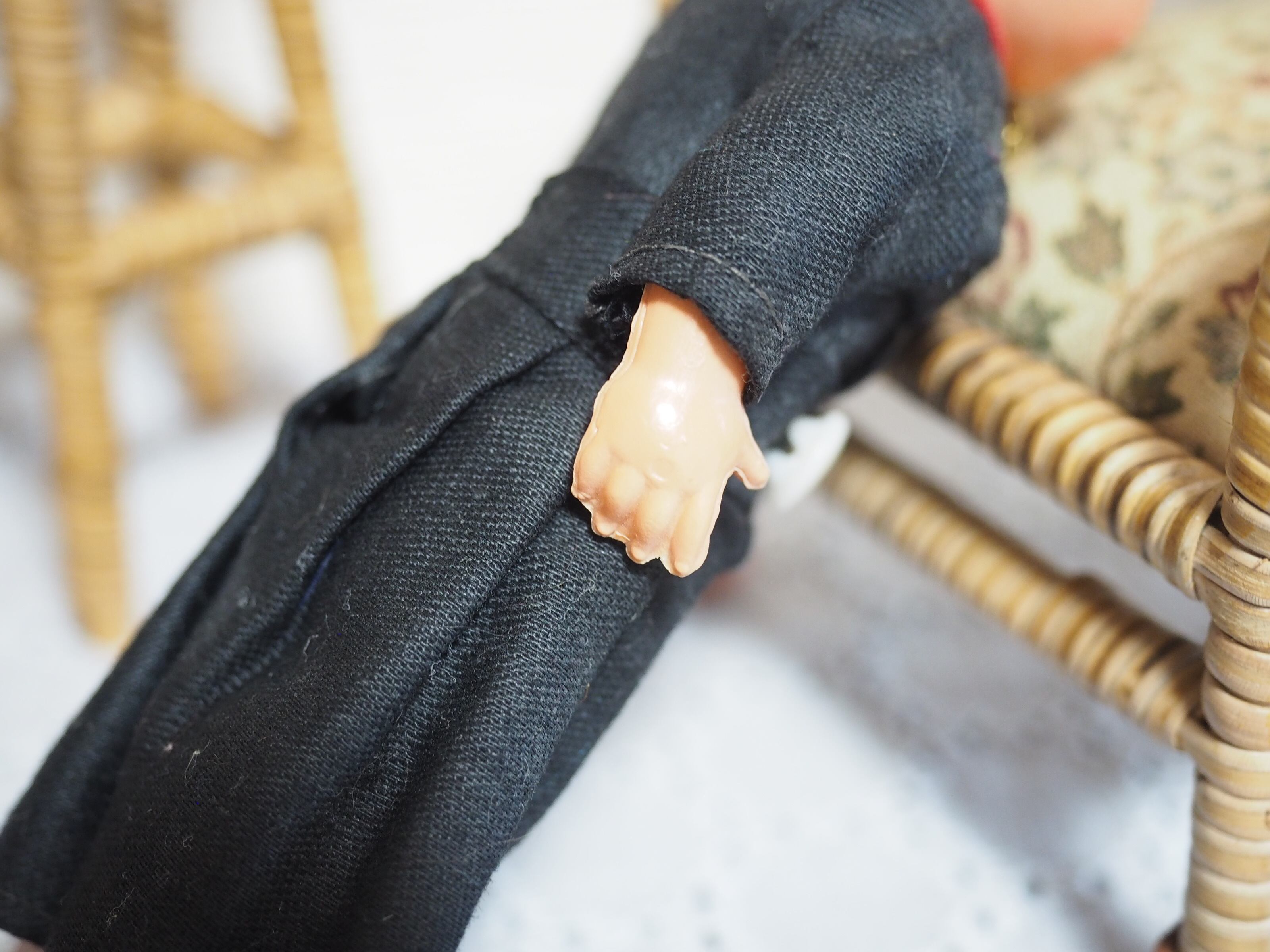 黒いつなぎのようなお洋服は色あせした所がありますが、しっかりした生地で穴など見当たりません。ボタン使いがおしゃれで、柄の入ったトップスに金属がぐるぐると巻かれた飾りがついています。