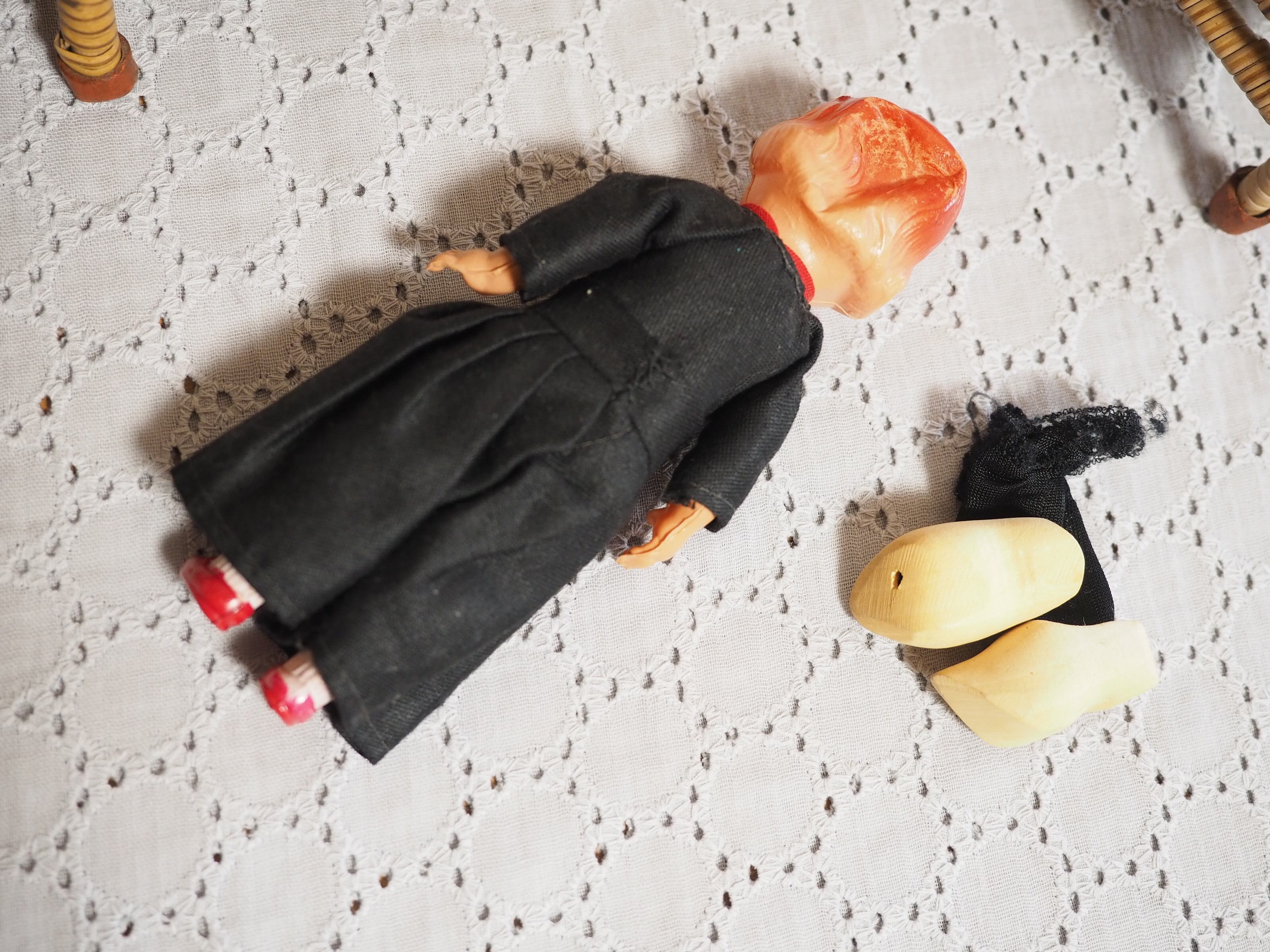 黒いパンツと赤い靴 セルロイドの男の子(木靴付き)