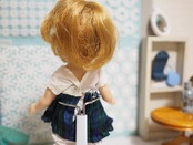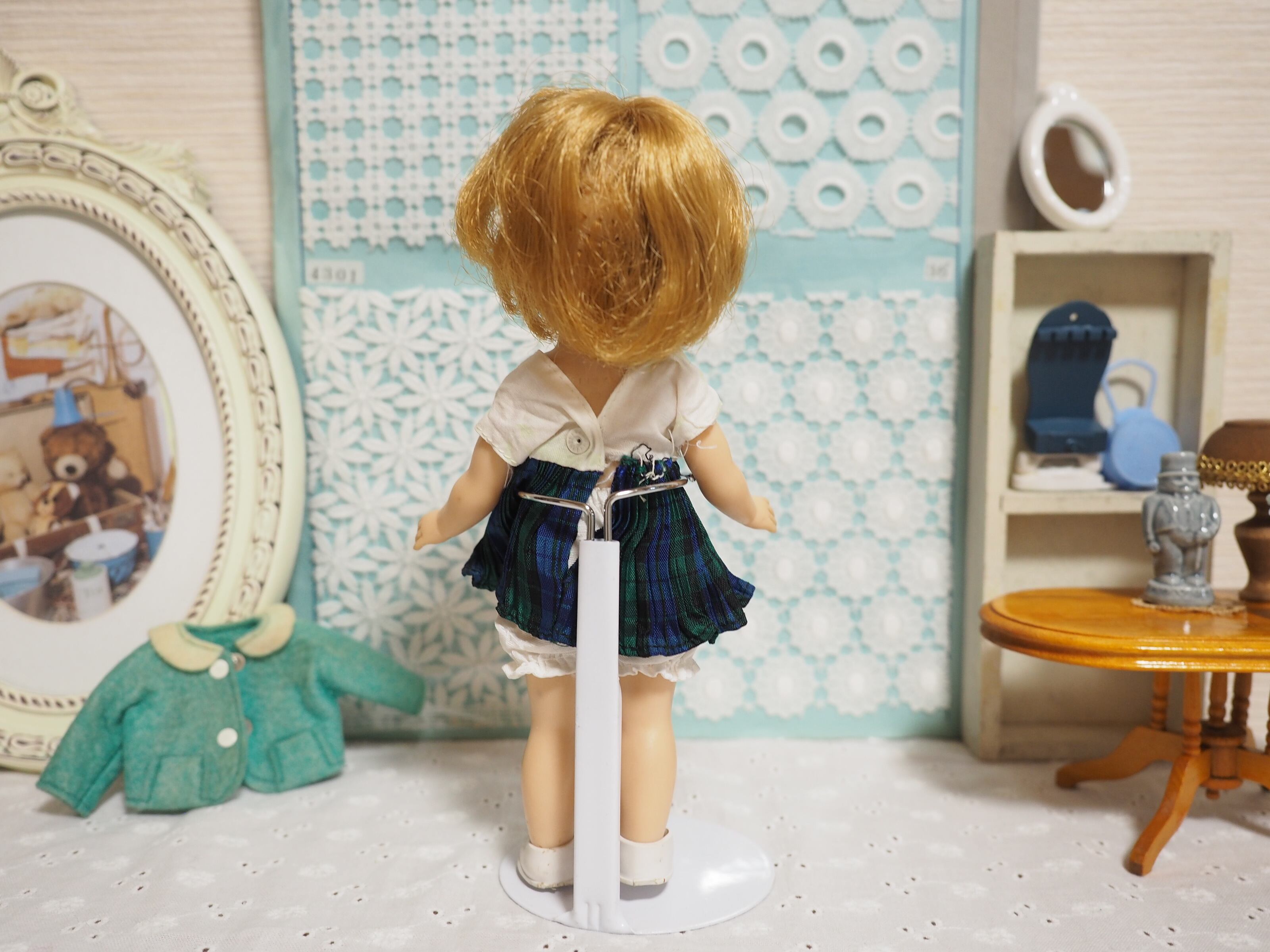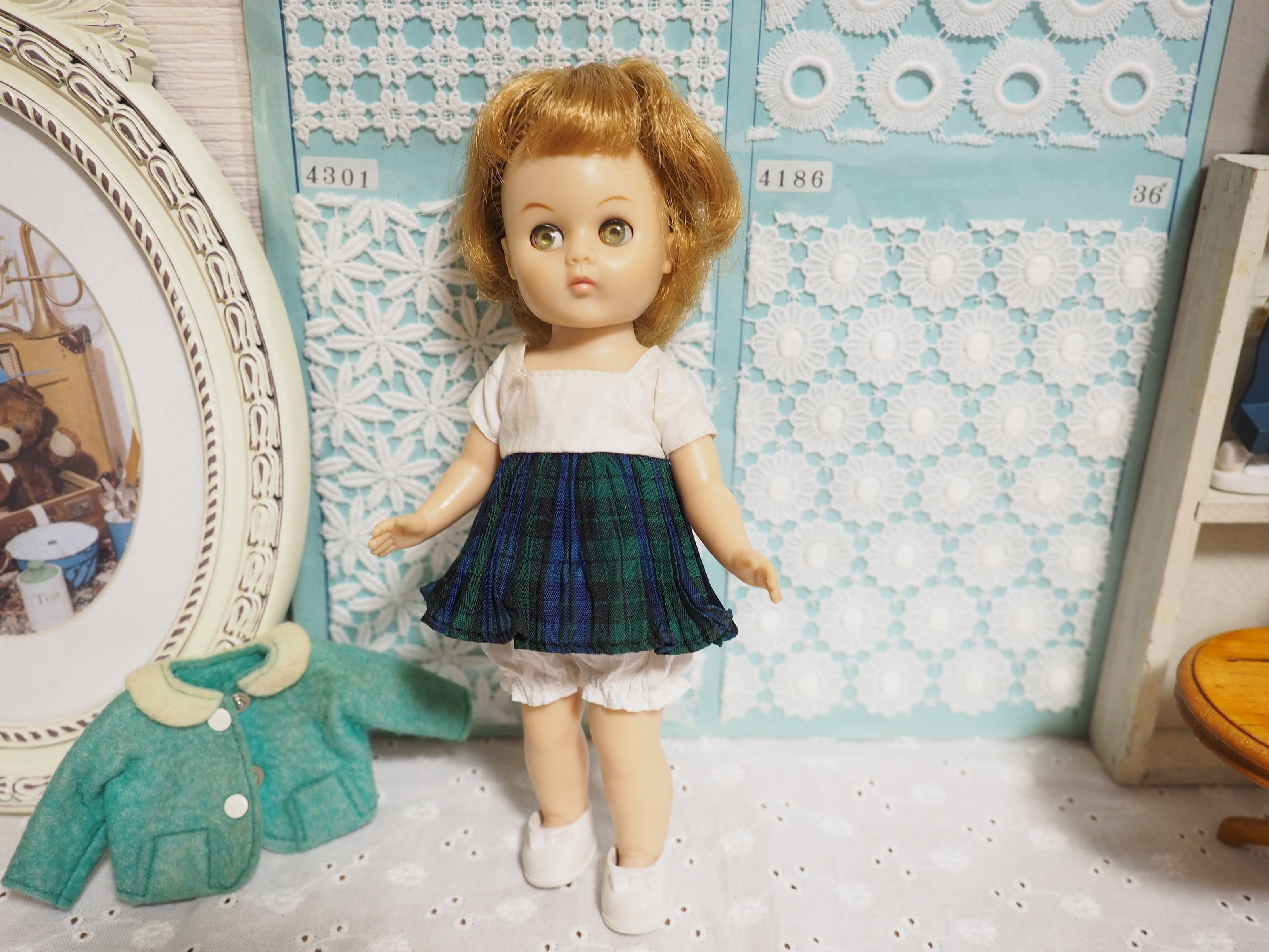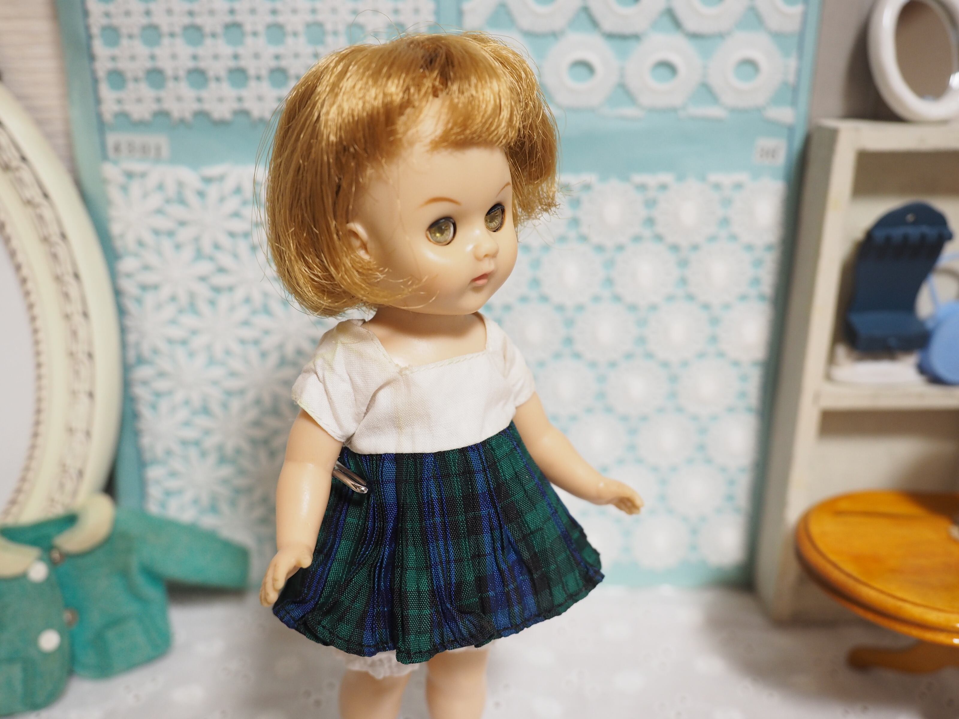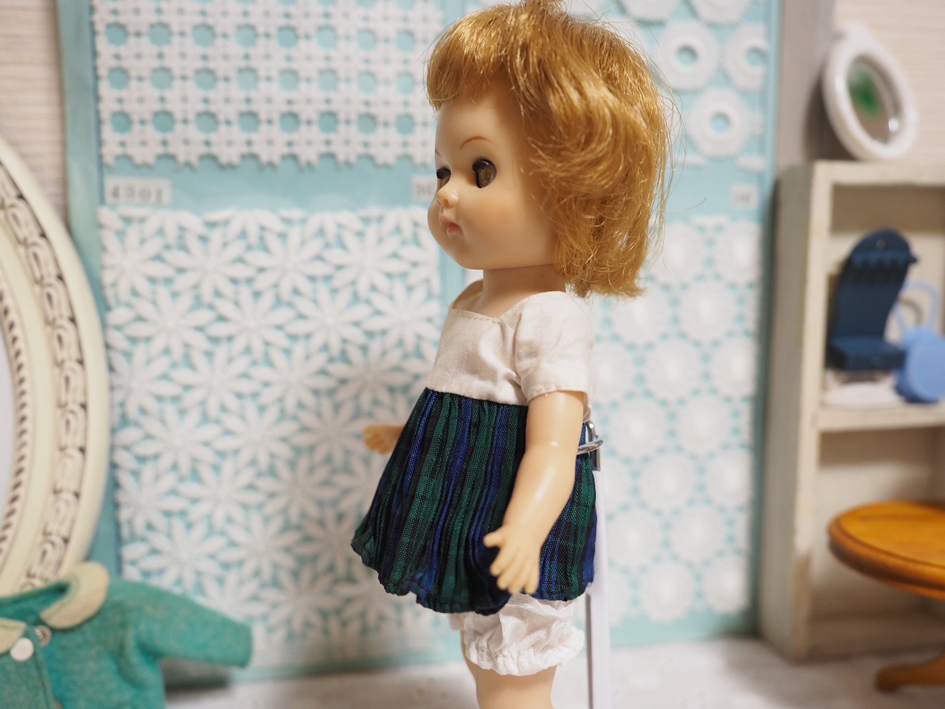 タータンチェックとプリーツがかわいいワンピースはVogue Dolls Incのタグ付き。後ろスナップ部分に破れ、縫い目取れがあります。