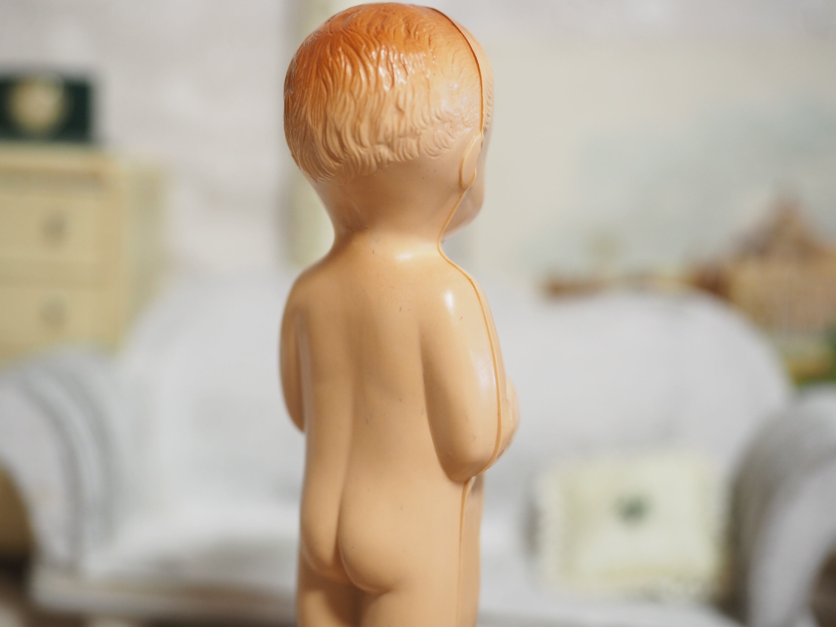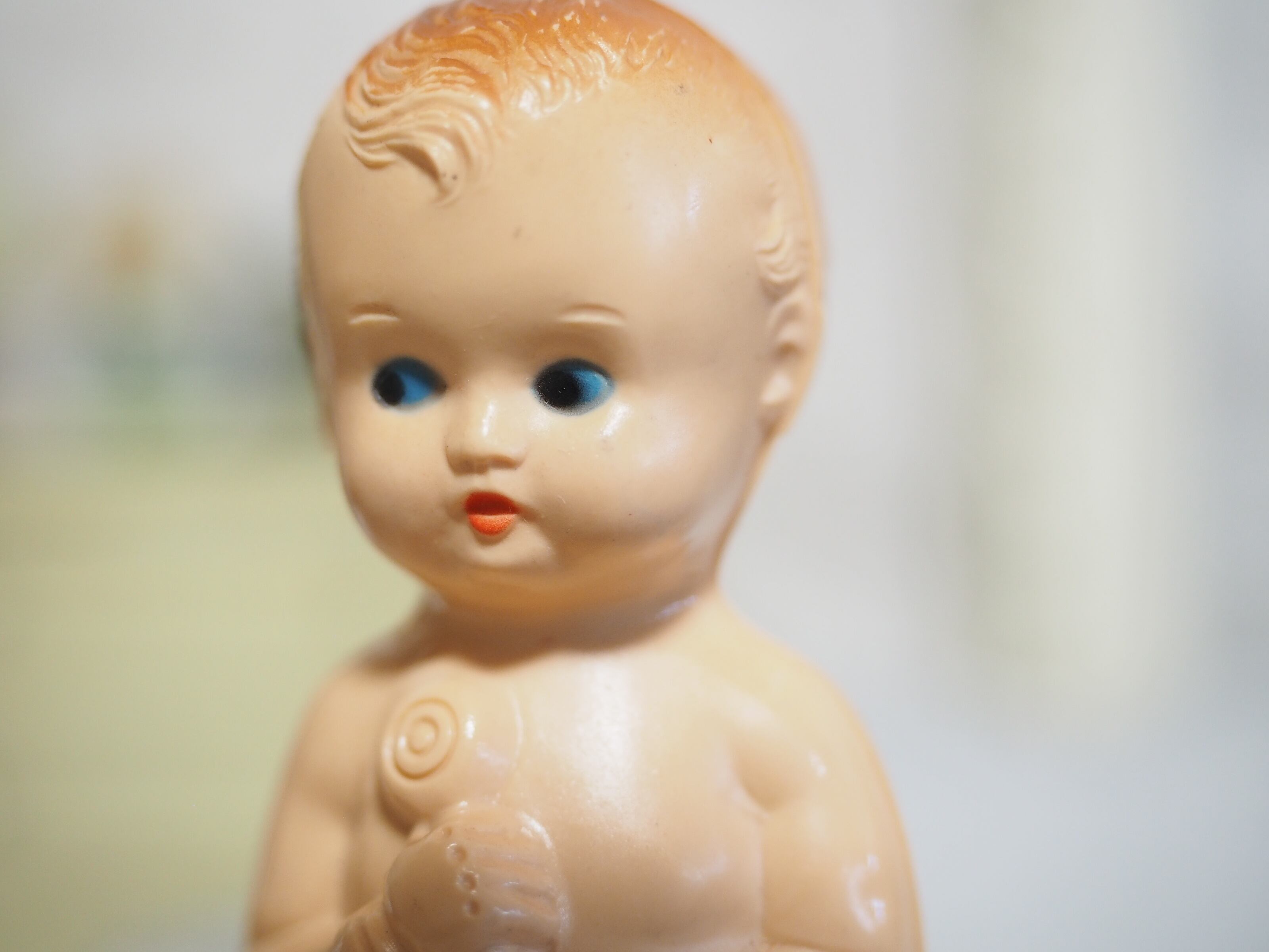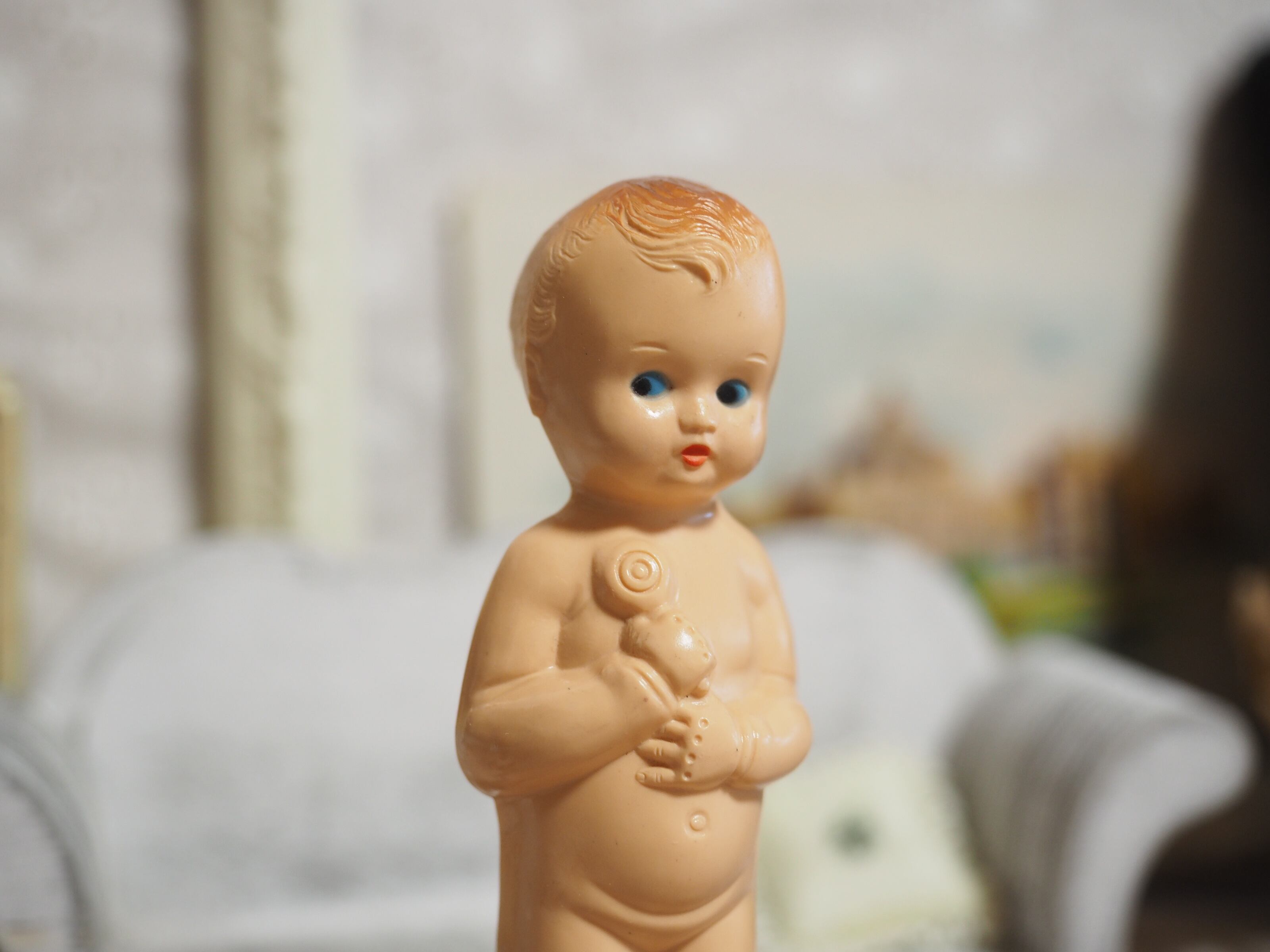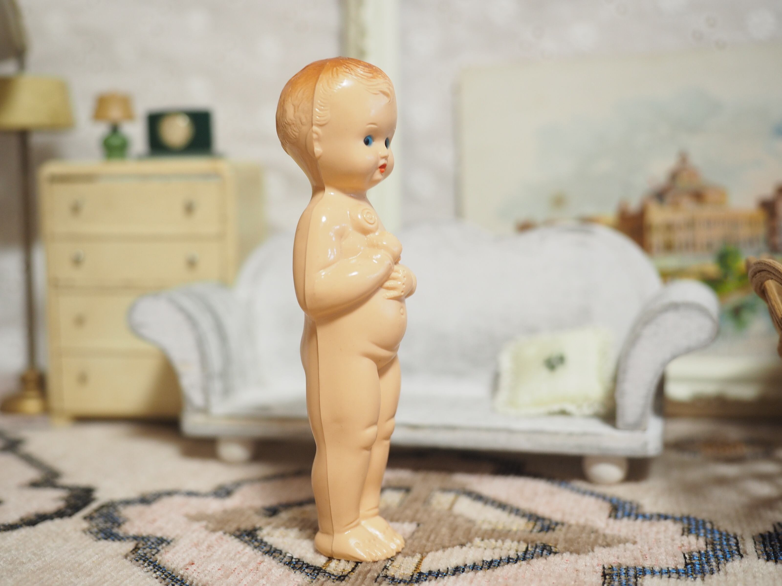 キャンディを持つ手やぽっこりしたお腹、丸いおへそがキュートです。