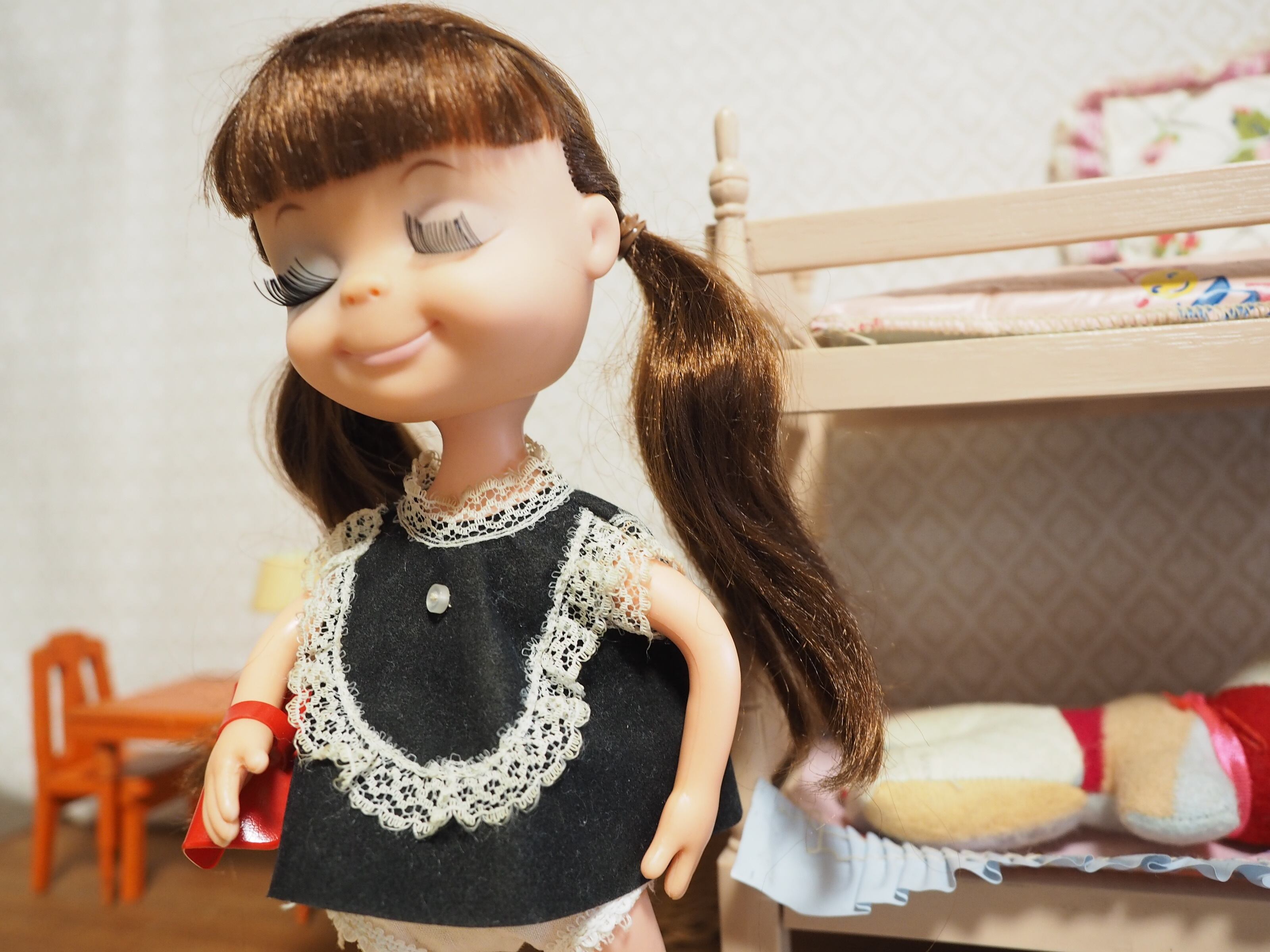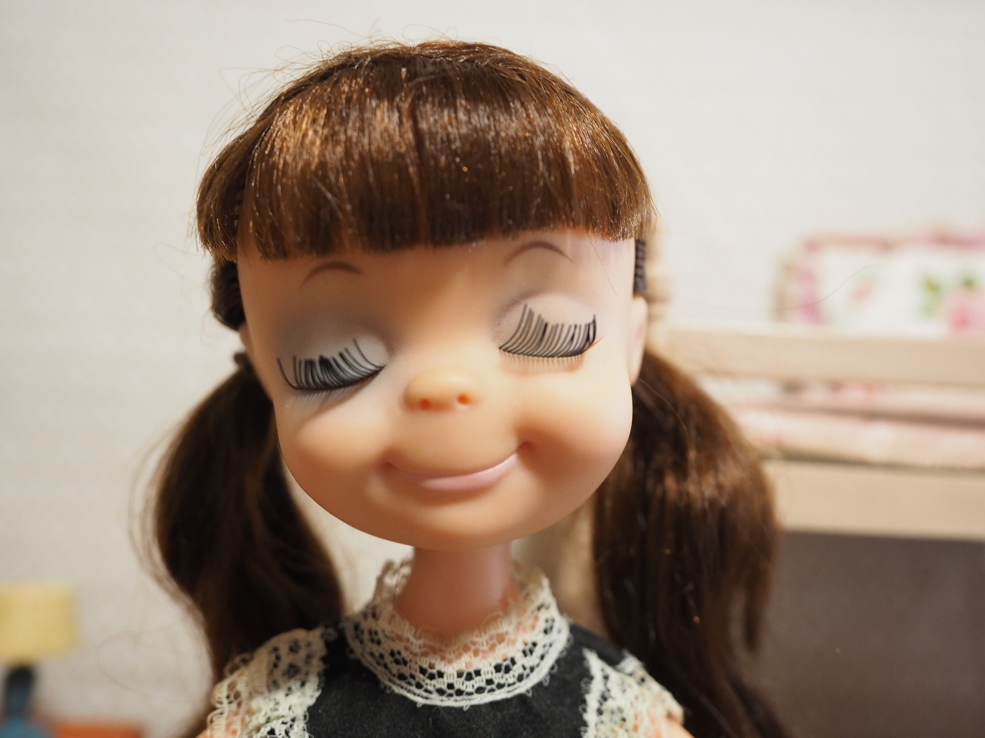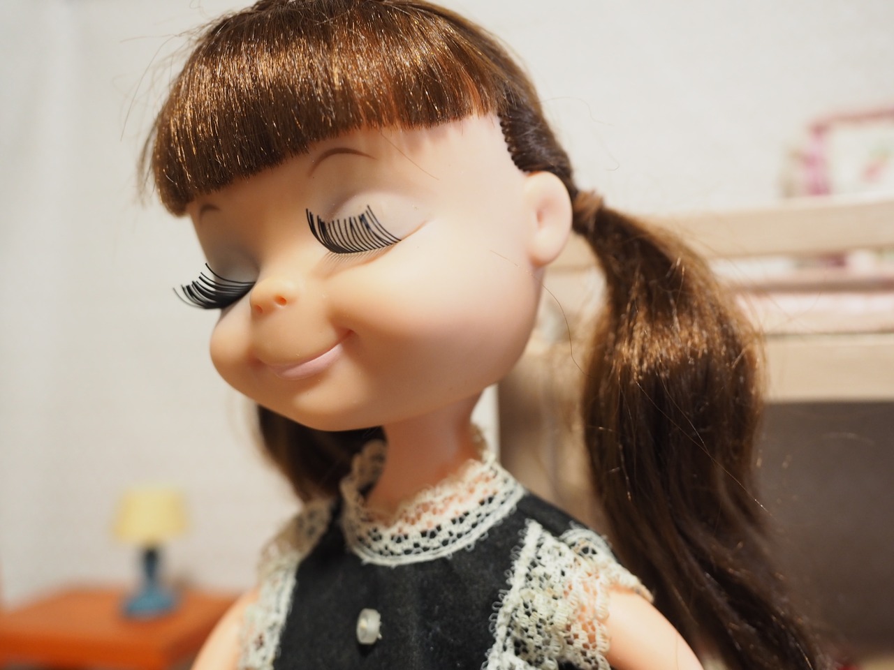 睫毛は細いワイヤーのような素材で、なかなか状態のよい子が見つかりませんがこちらはとてもきれいな長いまつ毛をしています。