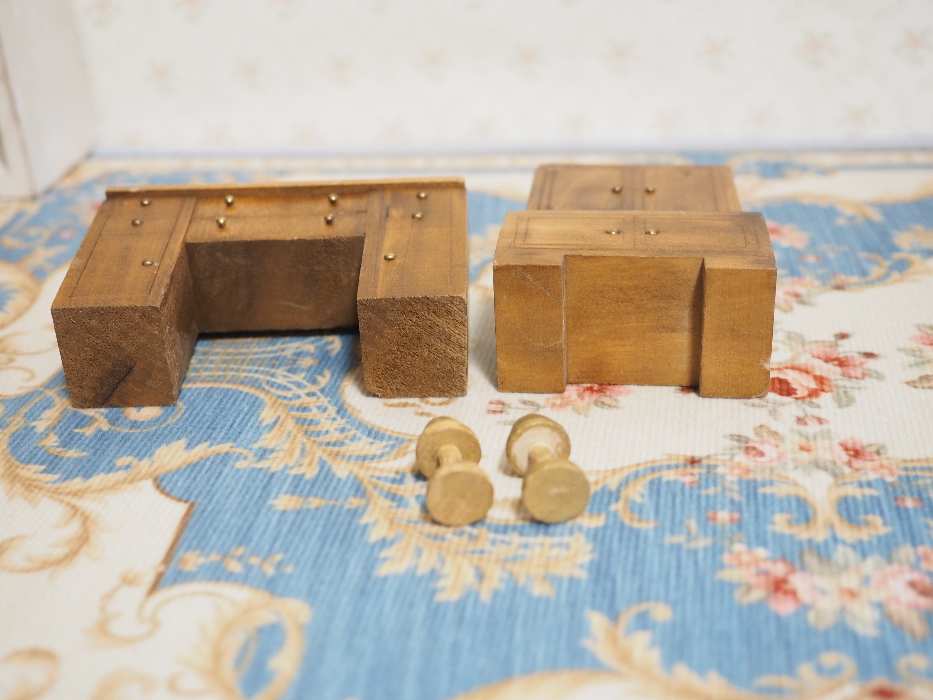 こっくりした深みのあるウォルナットカラー、ビンテージカラーの金具、丸みのあるデザインが素敵なドール家具です。