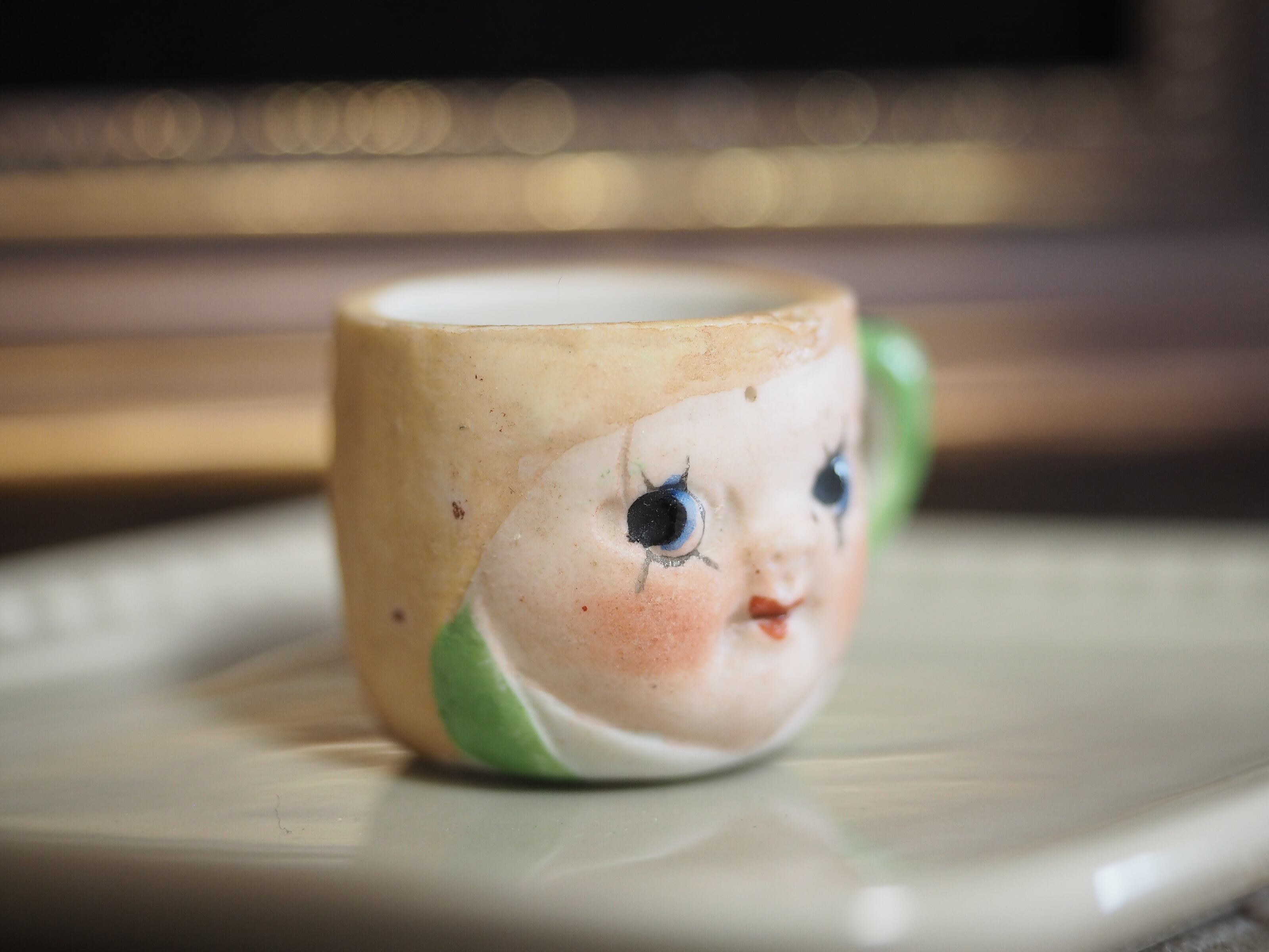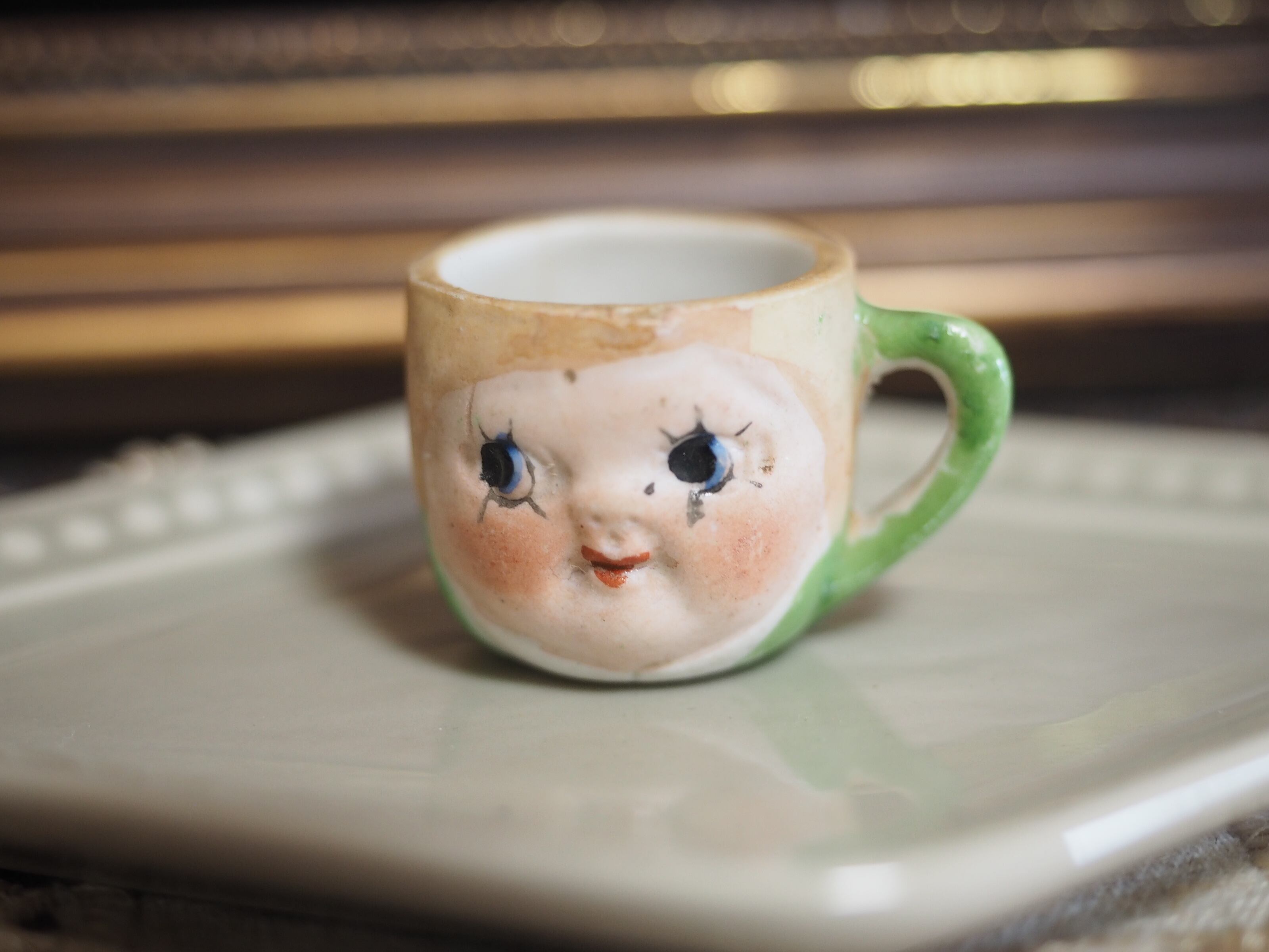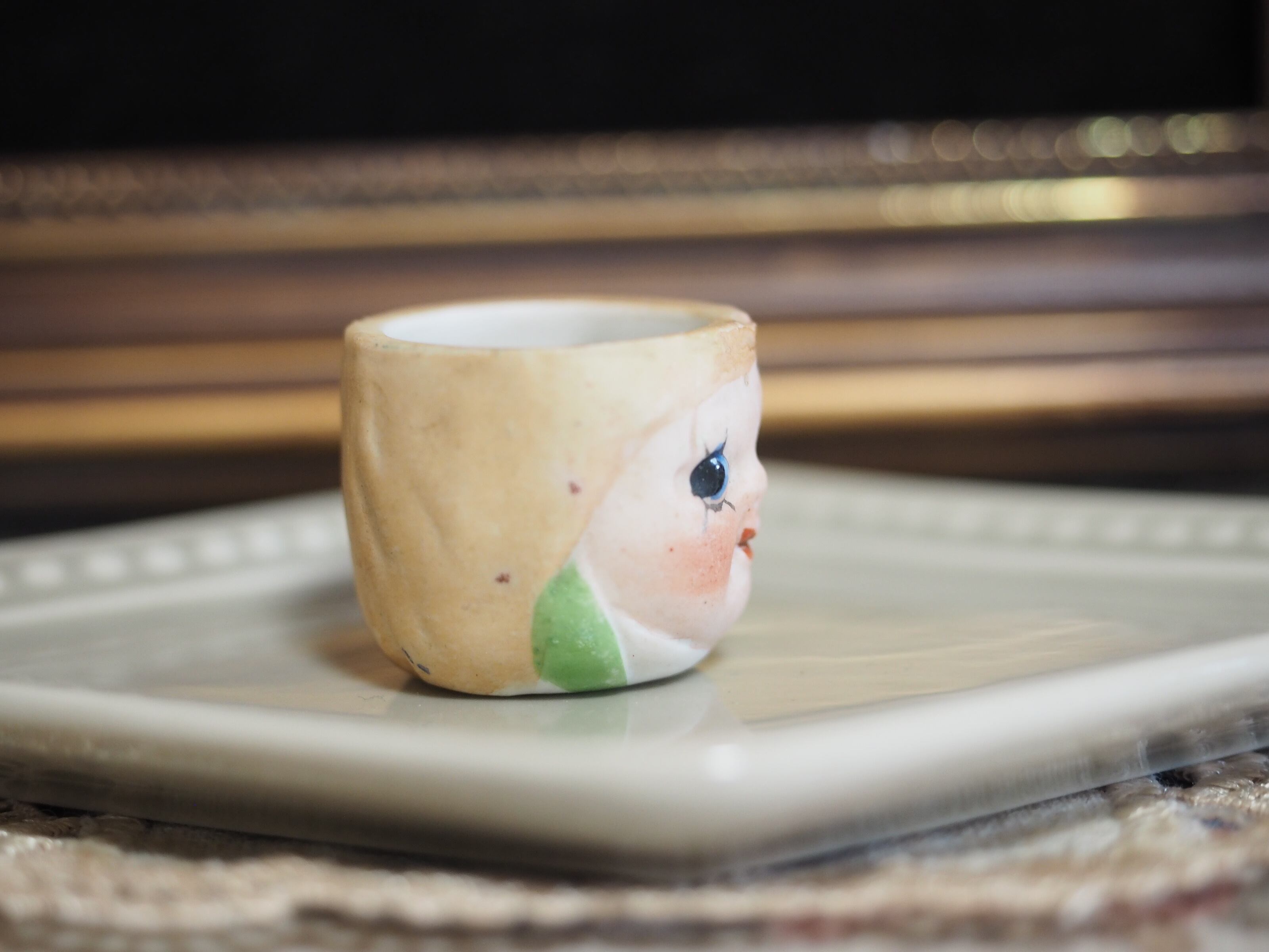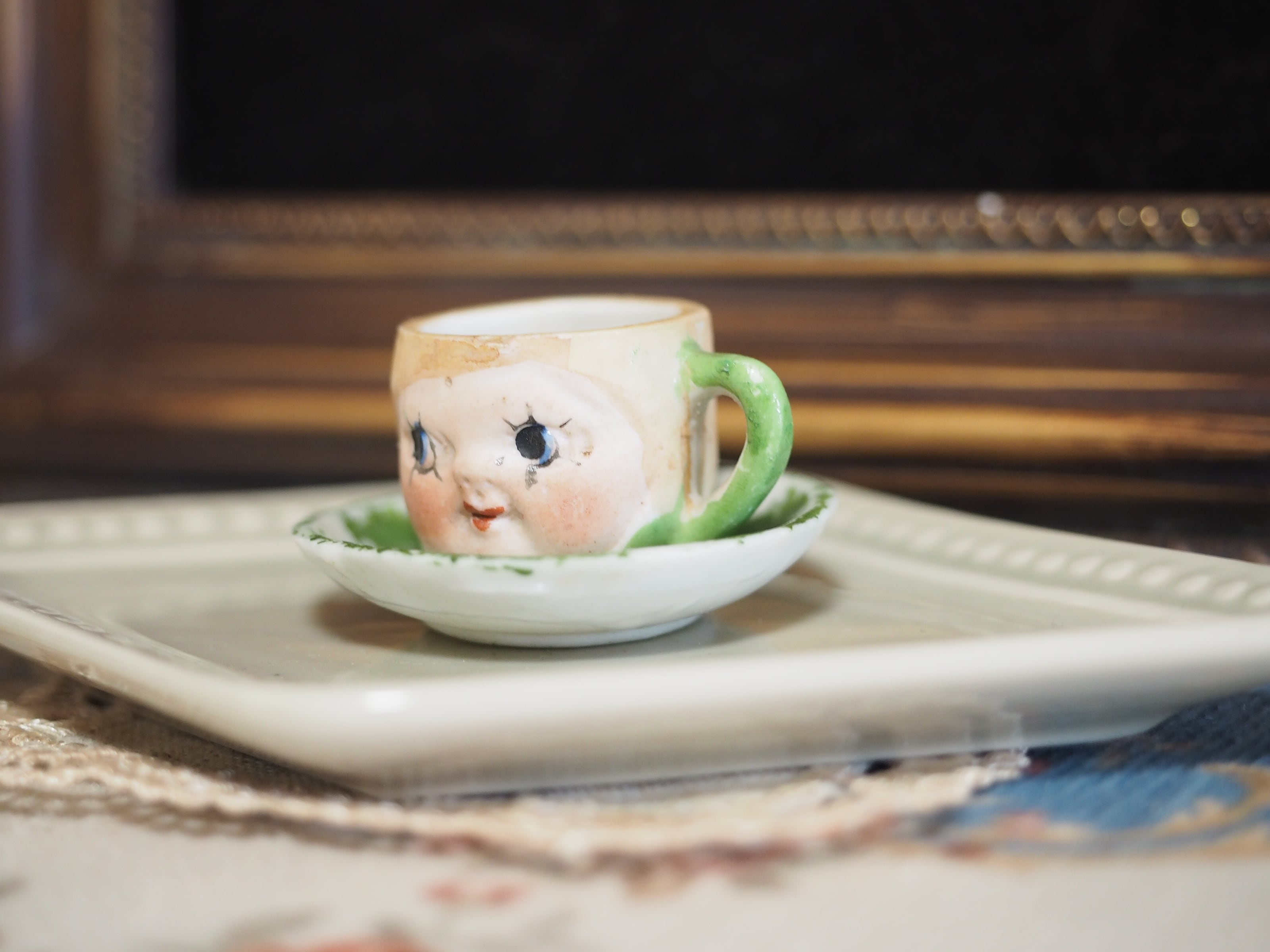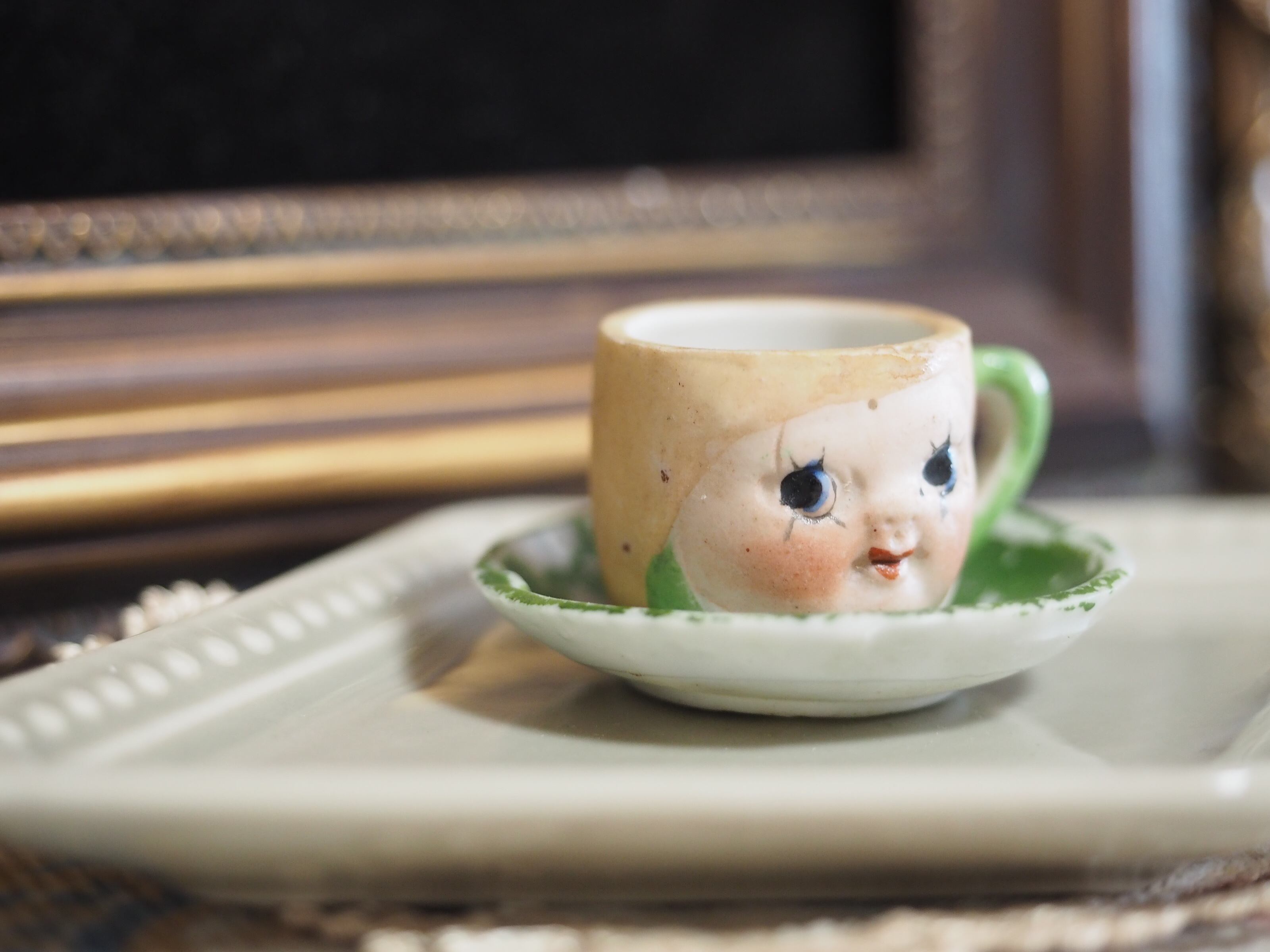 こちらはそっくりに作られたカップ&ソーサーのうち、左目下のまつ毛が太目、おでこに製造時の小さな穴があります。