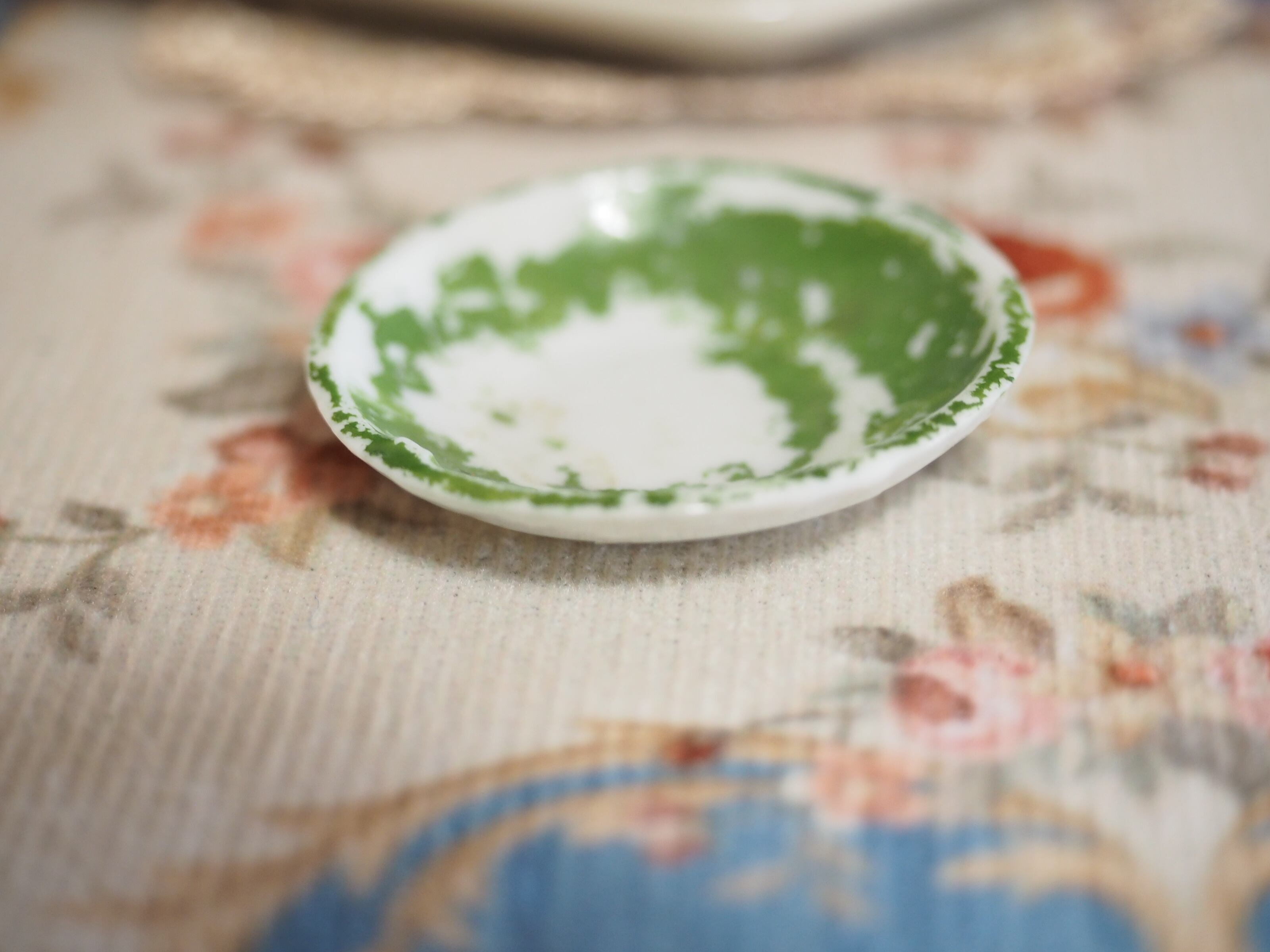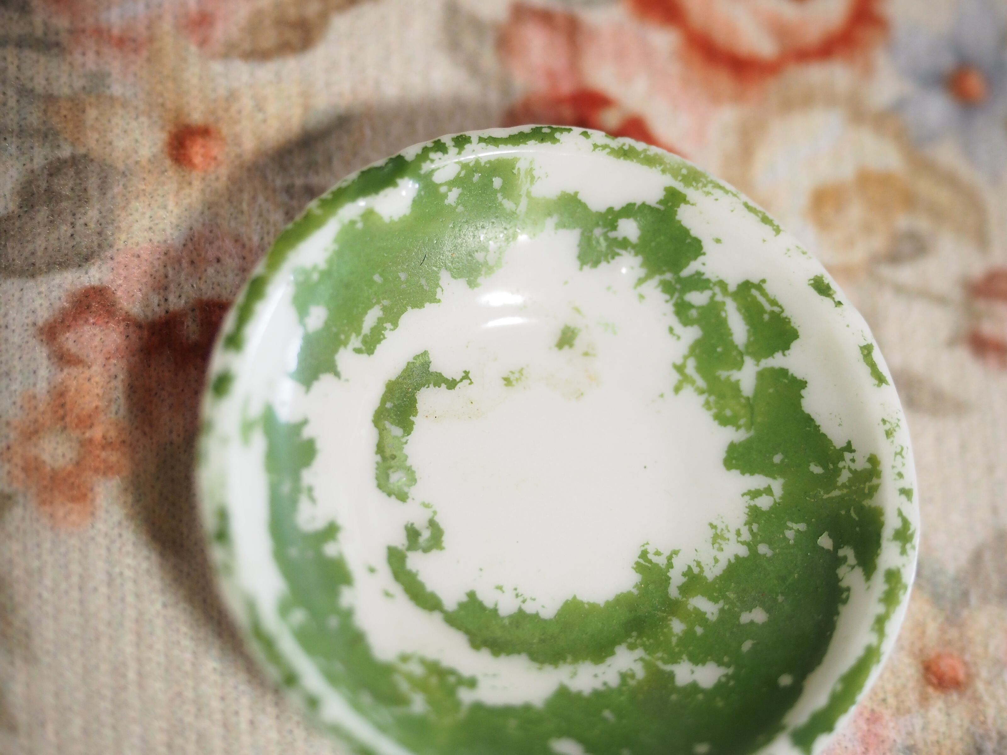 ソーサーはペイントがかなり剥げています。縁にガタガタとへこんだ部分がありますが、欠けはありません。白いあたりに薄く茶色くなった部分があります。
