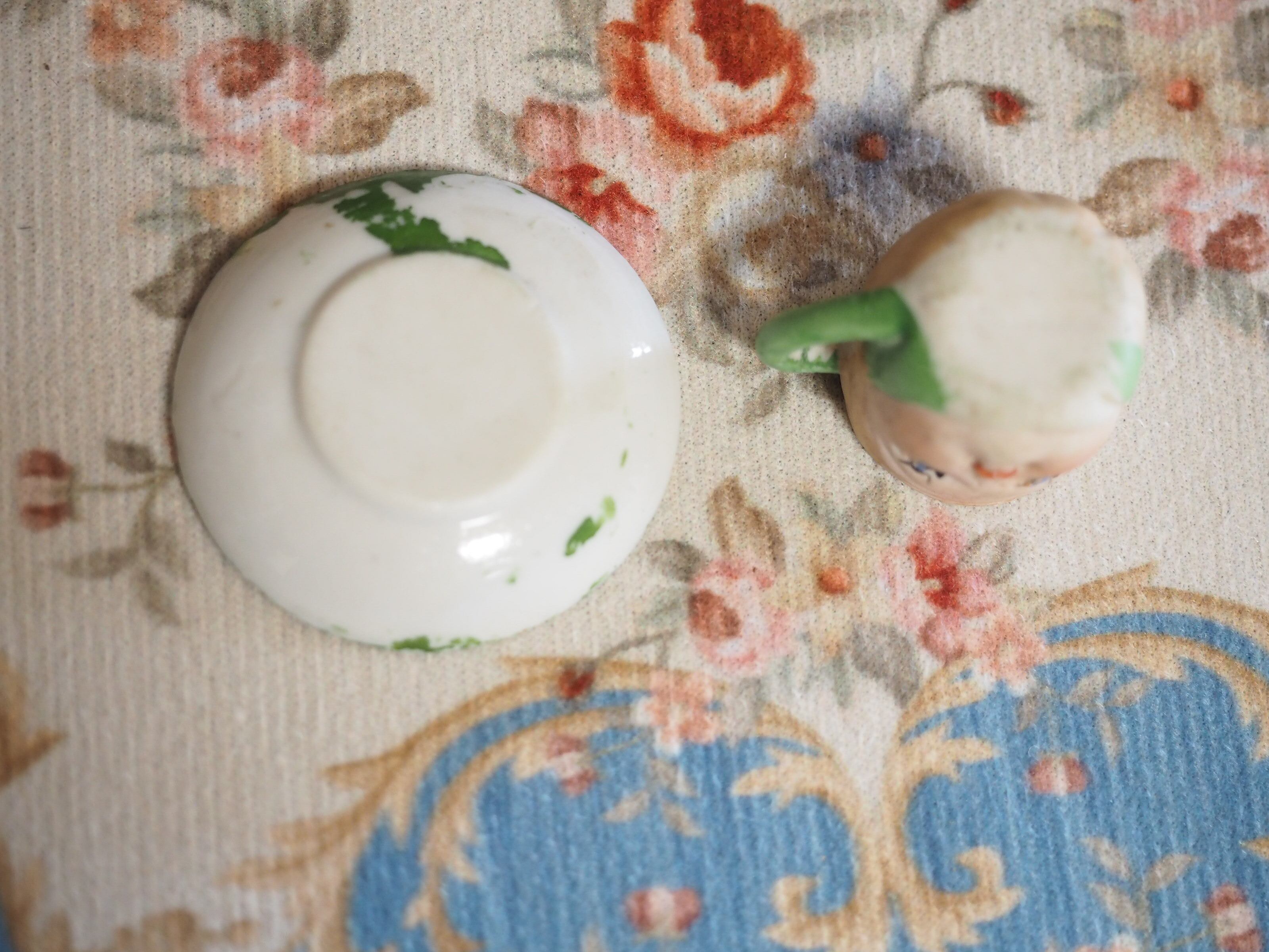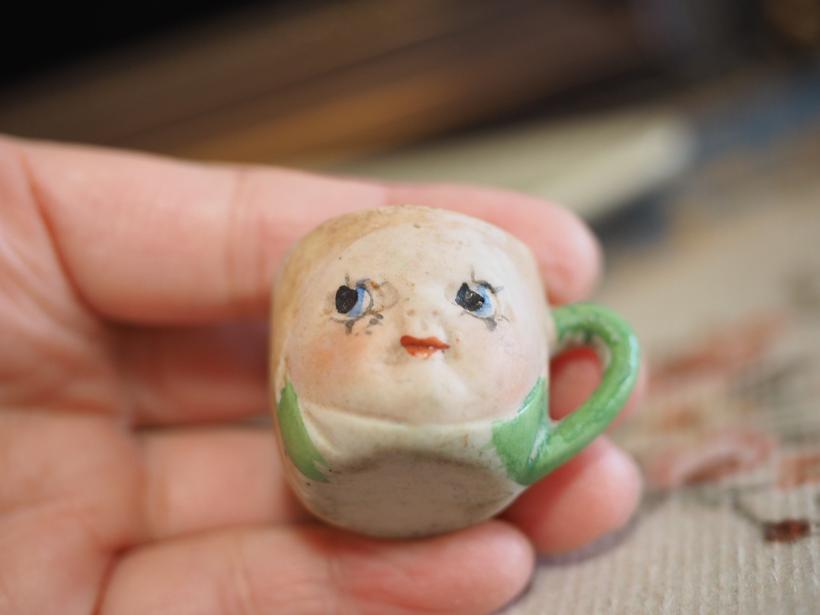 100年近くも前の陶器で、お顔の造形も素晴らしく、ミニチュアのサイズながら年月を経た存在感があります。