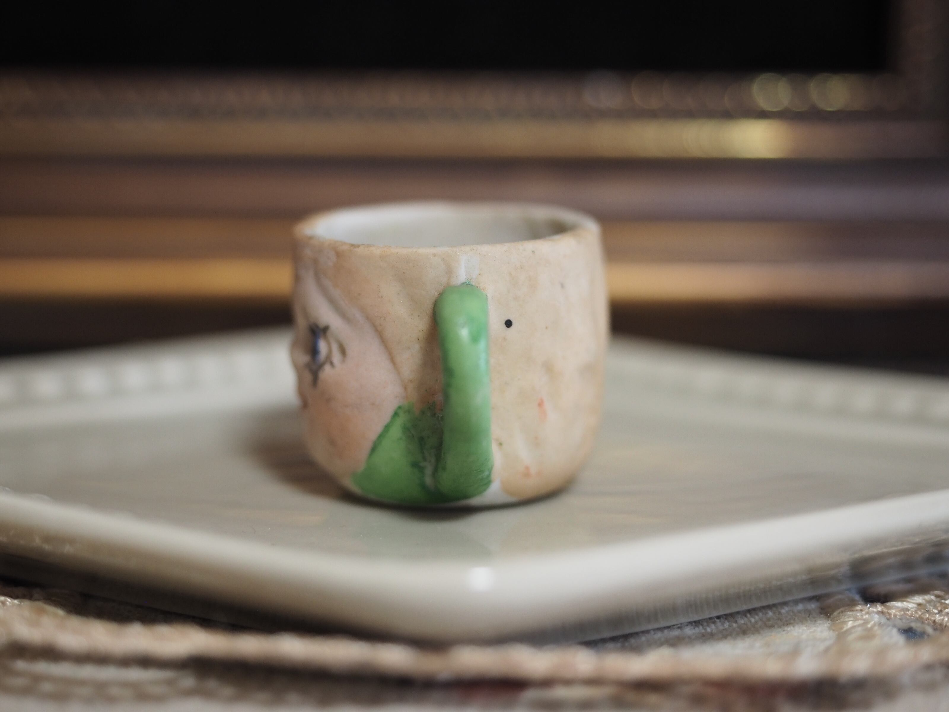 こちらはそっくりに作られたカップ&ソーサーのうち、右目の下にまつ毛の点が多くあります。ややお顔にくすみあり。