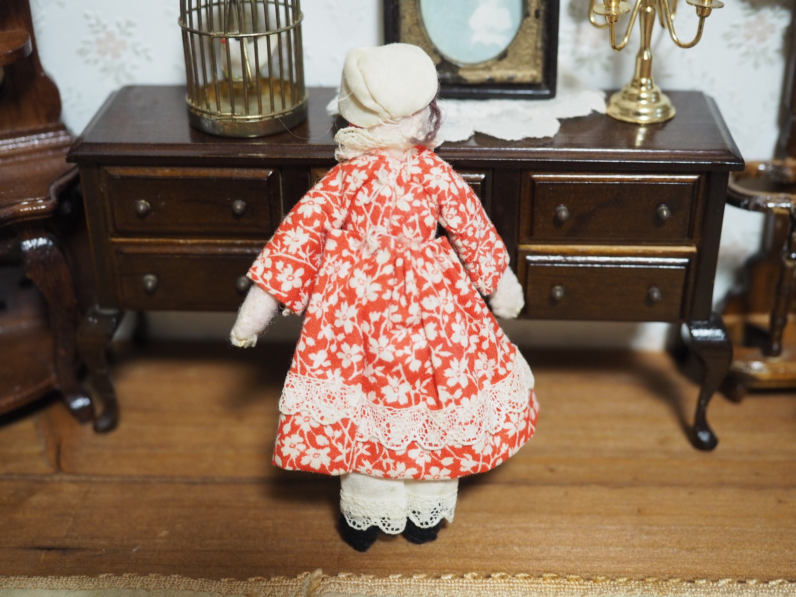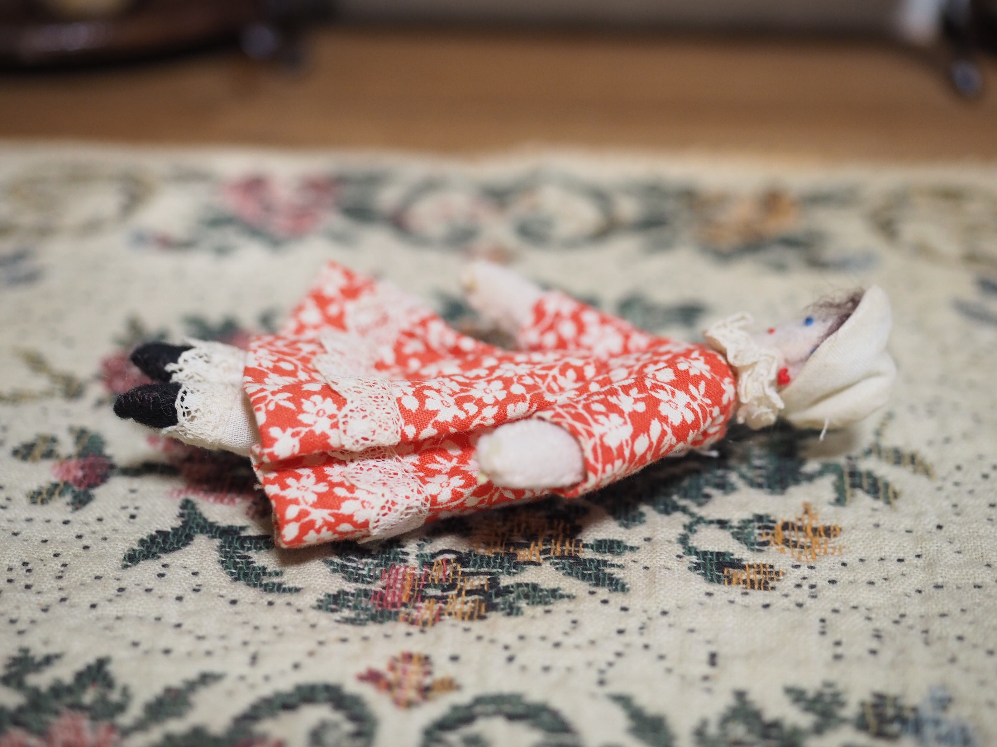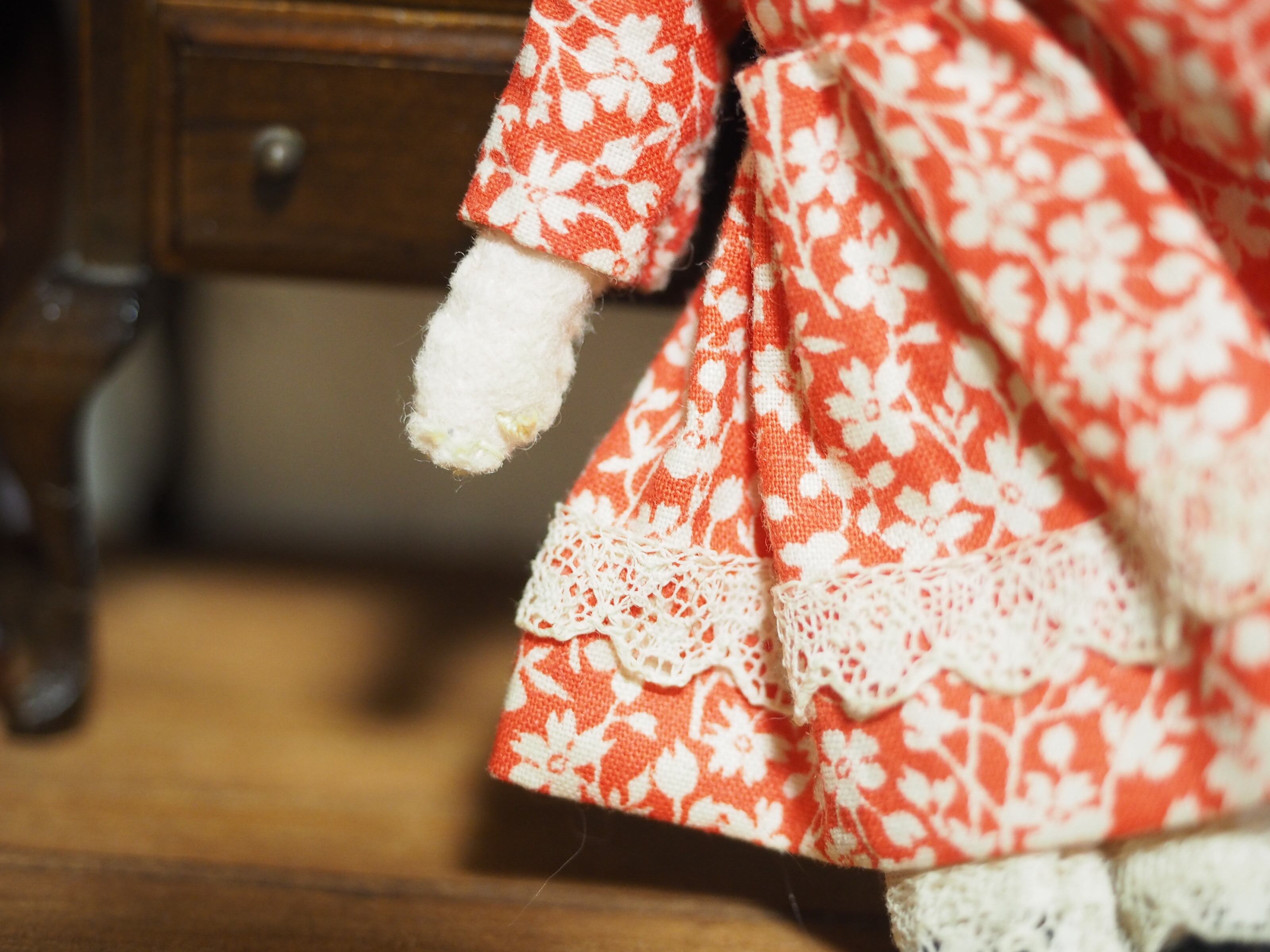 ハンドメイドで作られたかわいいワンピースの布製ドールです。