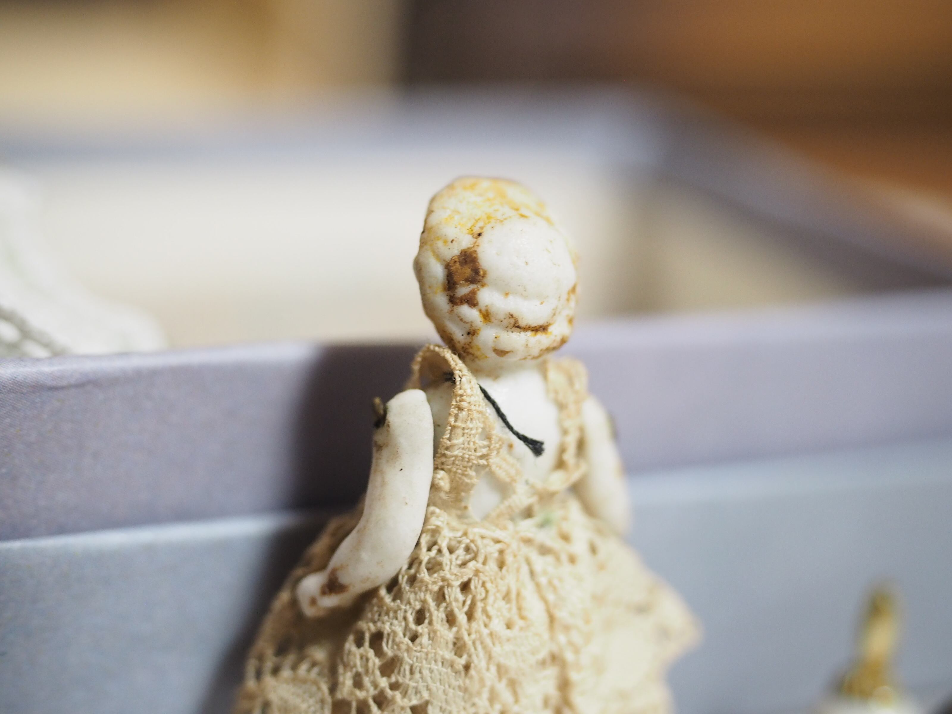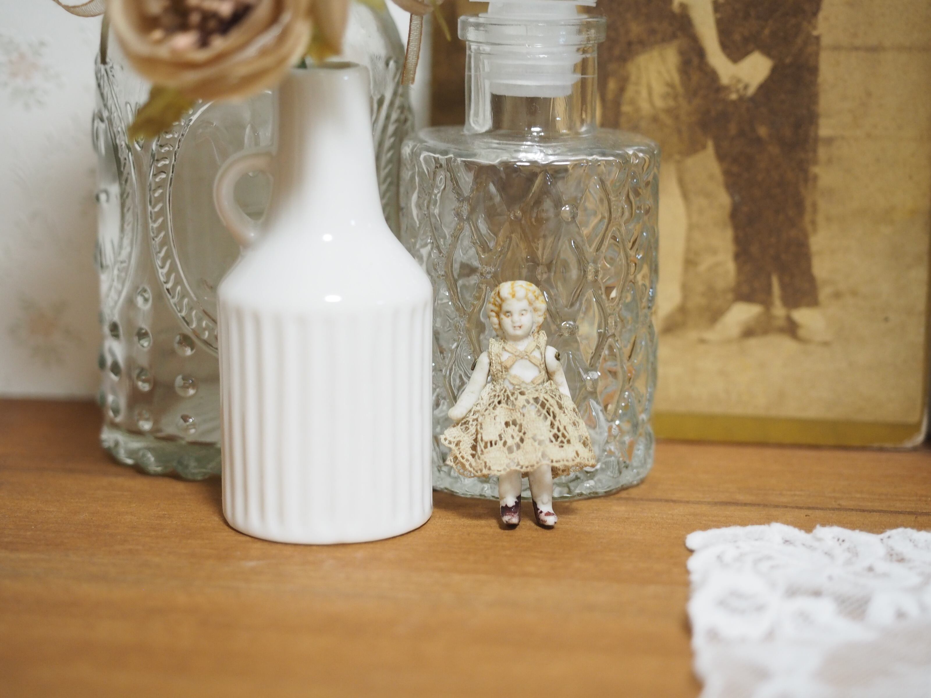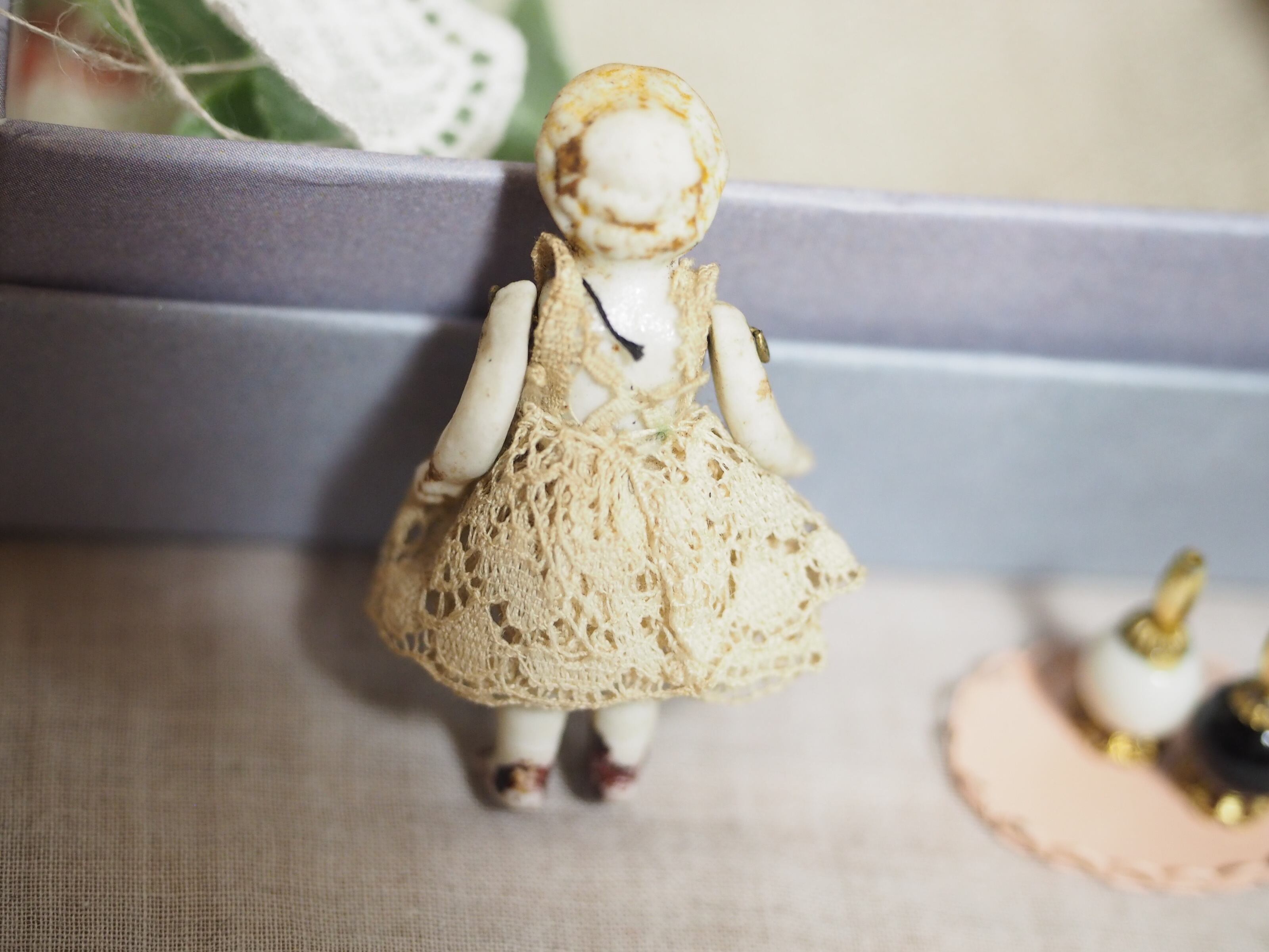 約4.6㎝の小さなサイズですが、ふんわりした素敵なレースワンピースを着ており、年月を経てレースも一緒にアンティークな風合いに変化したと思われるドールです。