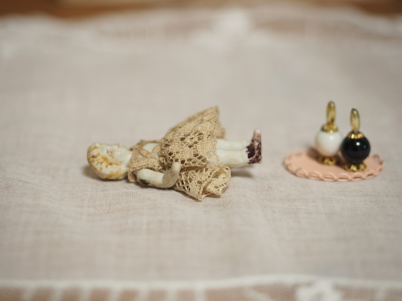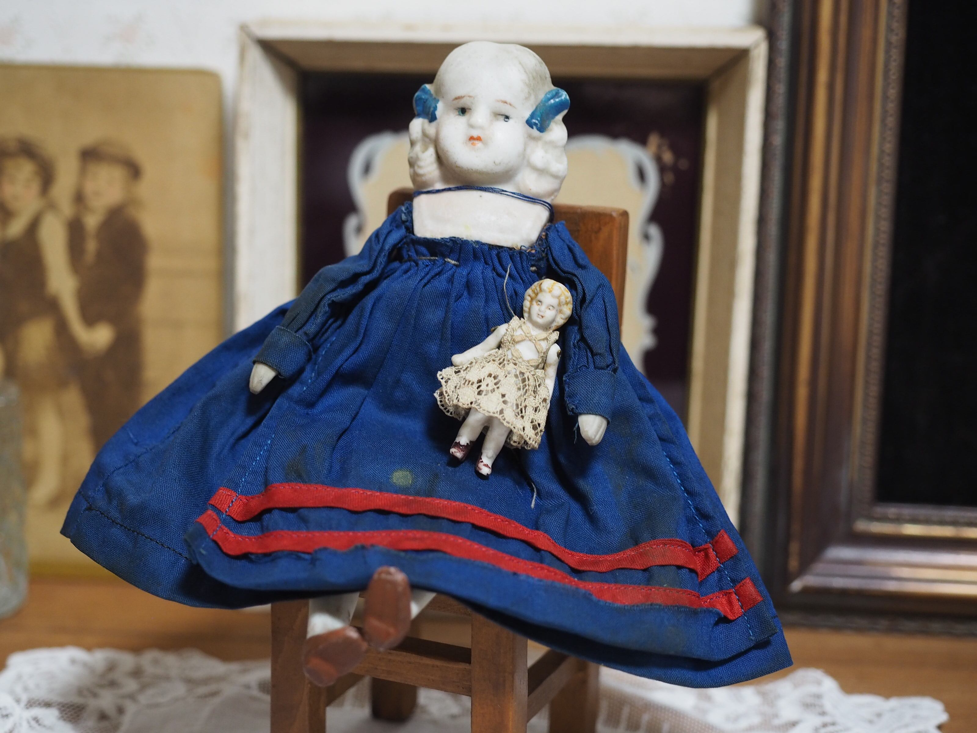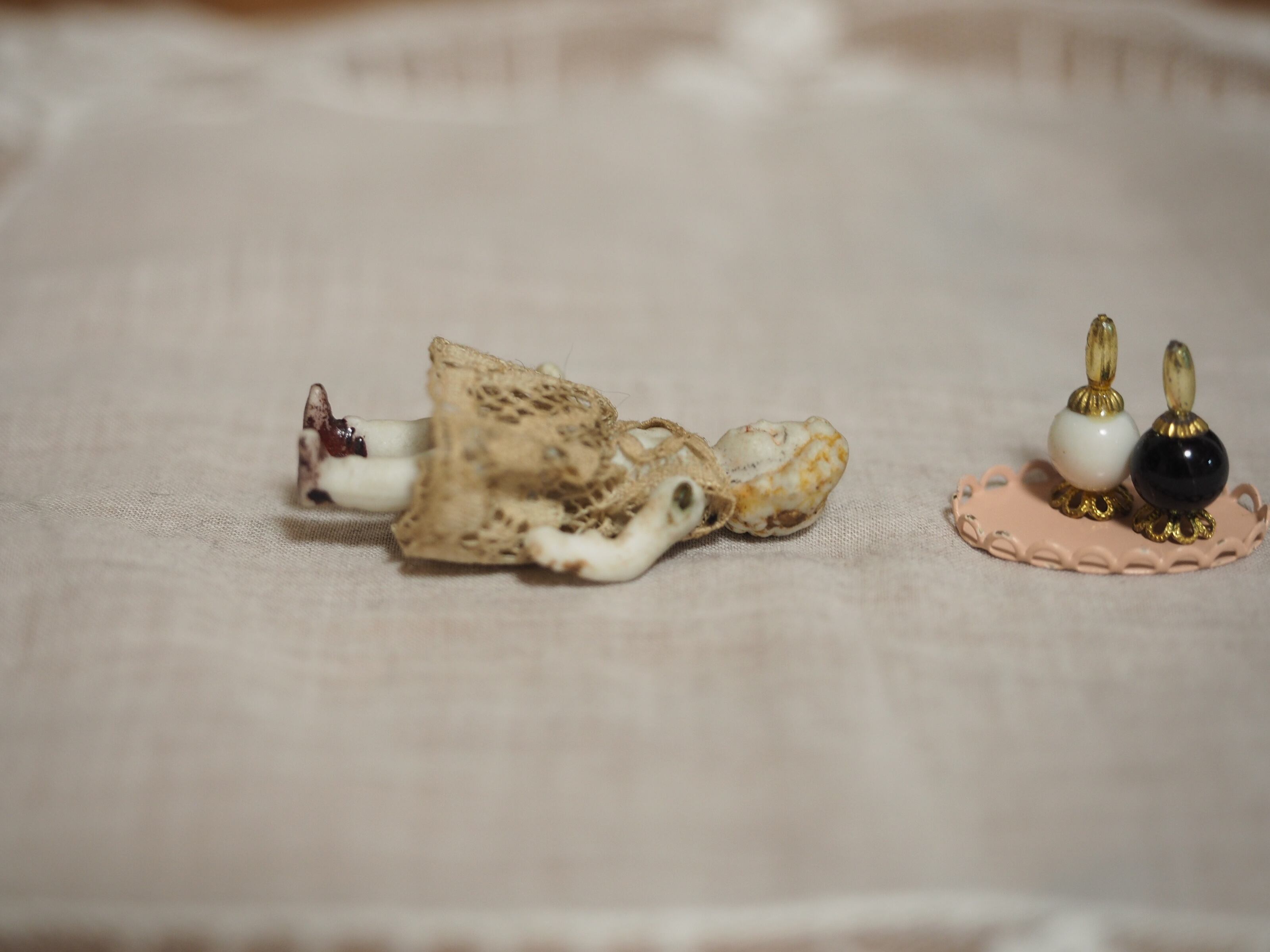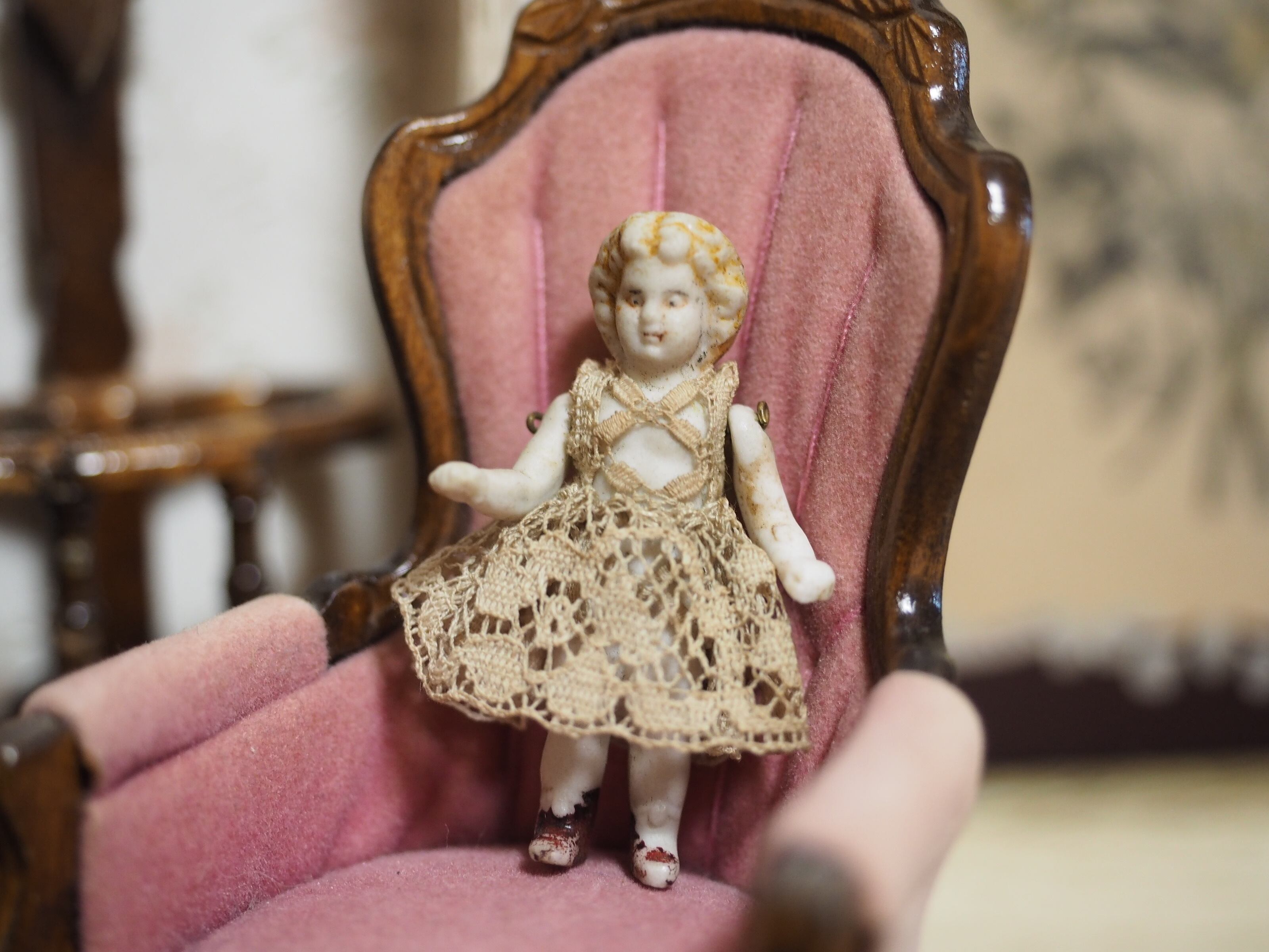 約4.6㎝の小さなサイズですが、ふんわりした素敵なレースワンピースを着ており、年月を経てレースも一緒にアンティークな風合いに変化したと思われるドールです。