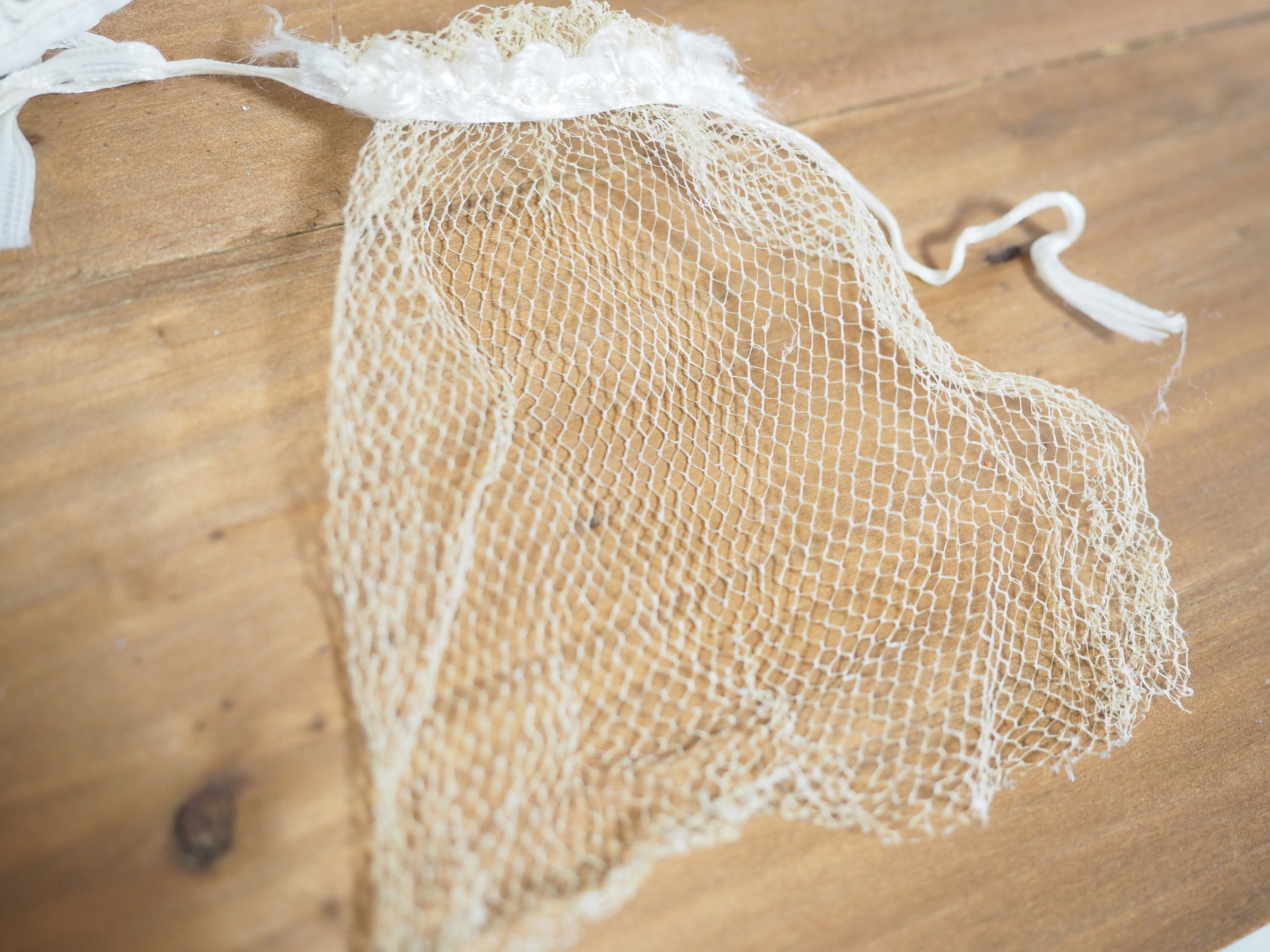 ドレスとお揃いのベールはチュールに穴が空いた部分があります。ドレスのチュールと共にアンティークな色合いになっています。