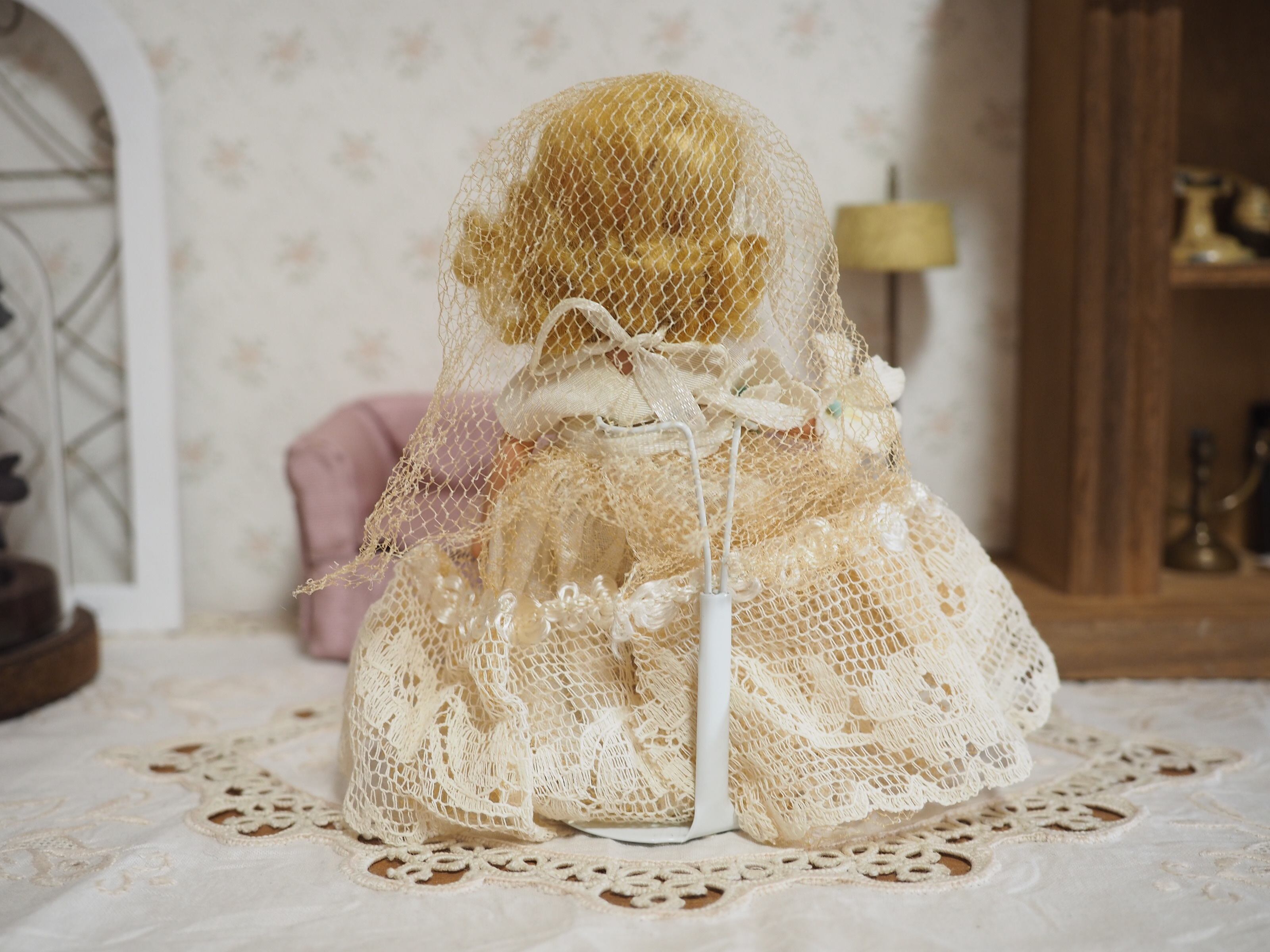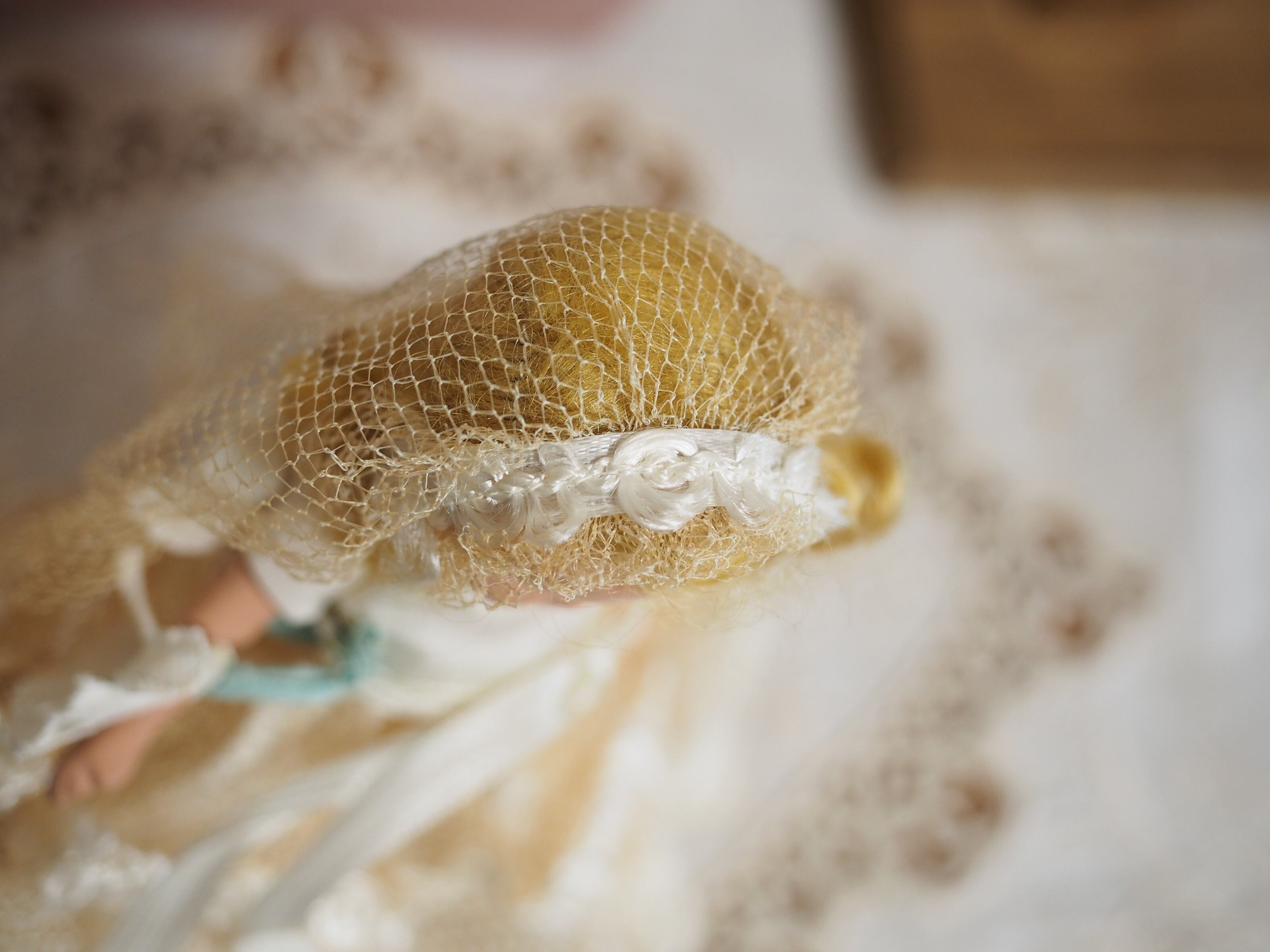 髪はモヘアウィッグで接着されており、ふわふわと少し乱れがありますが、きれいなウェーブにくるりと巻いたスタイルがチャーミング。