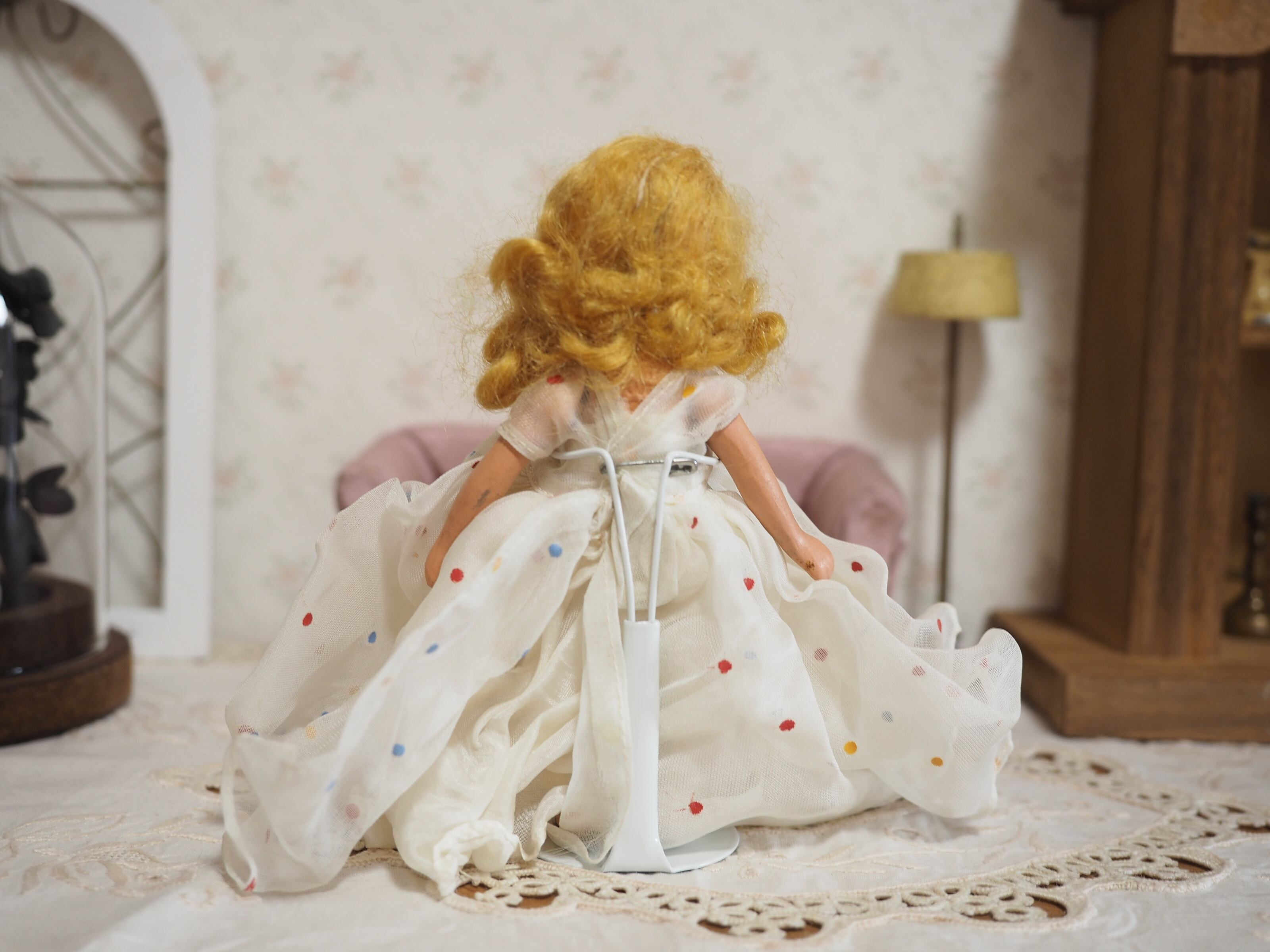 髪はモヘアウィッグで接着されており、ふわふわと少し乱れがありますが、きれいなウェーブにくるりと巻いたスタイルがチャーミング。