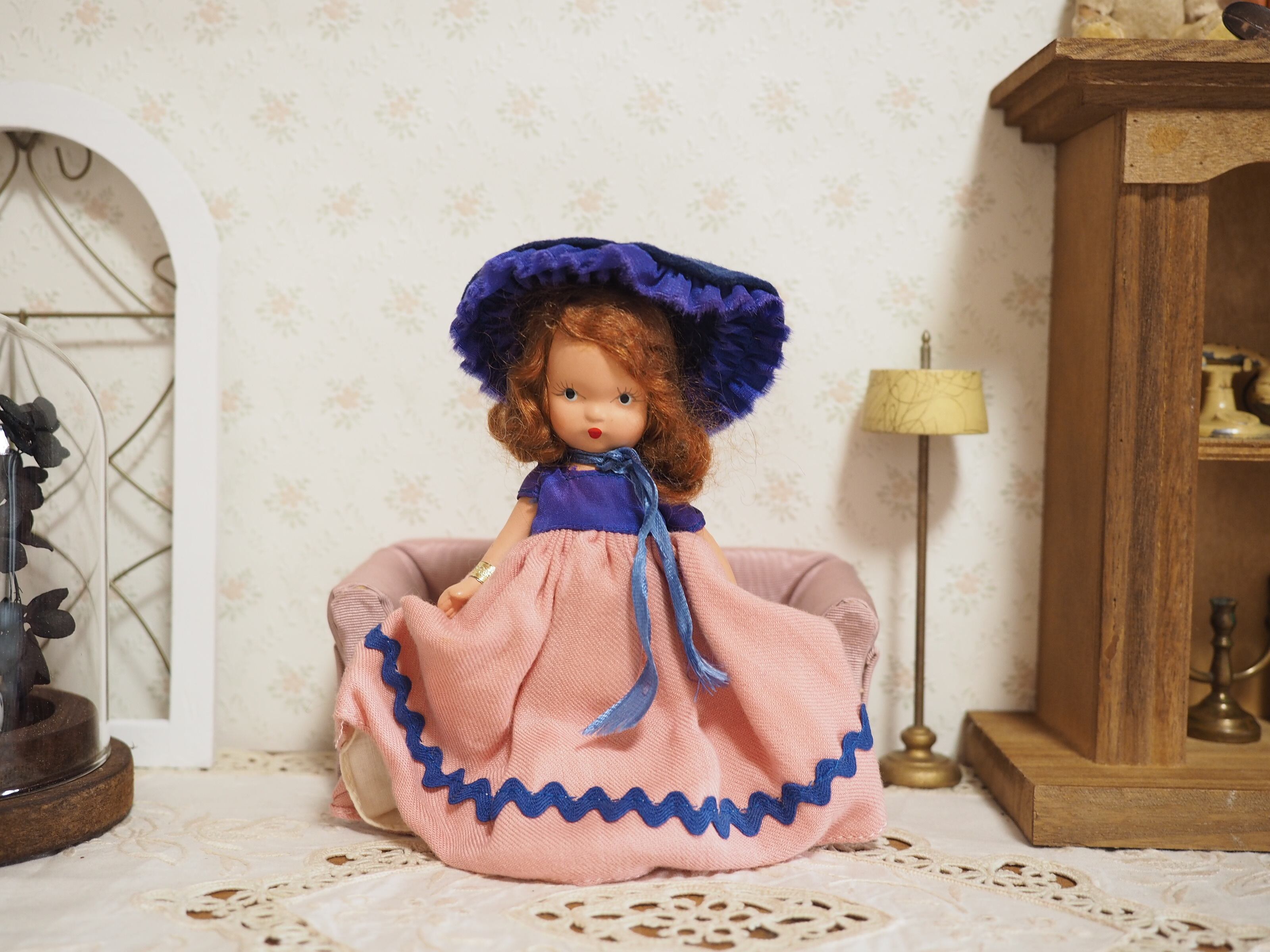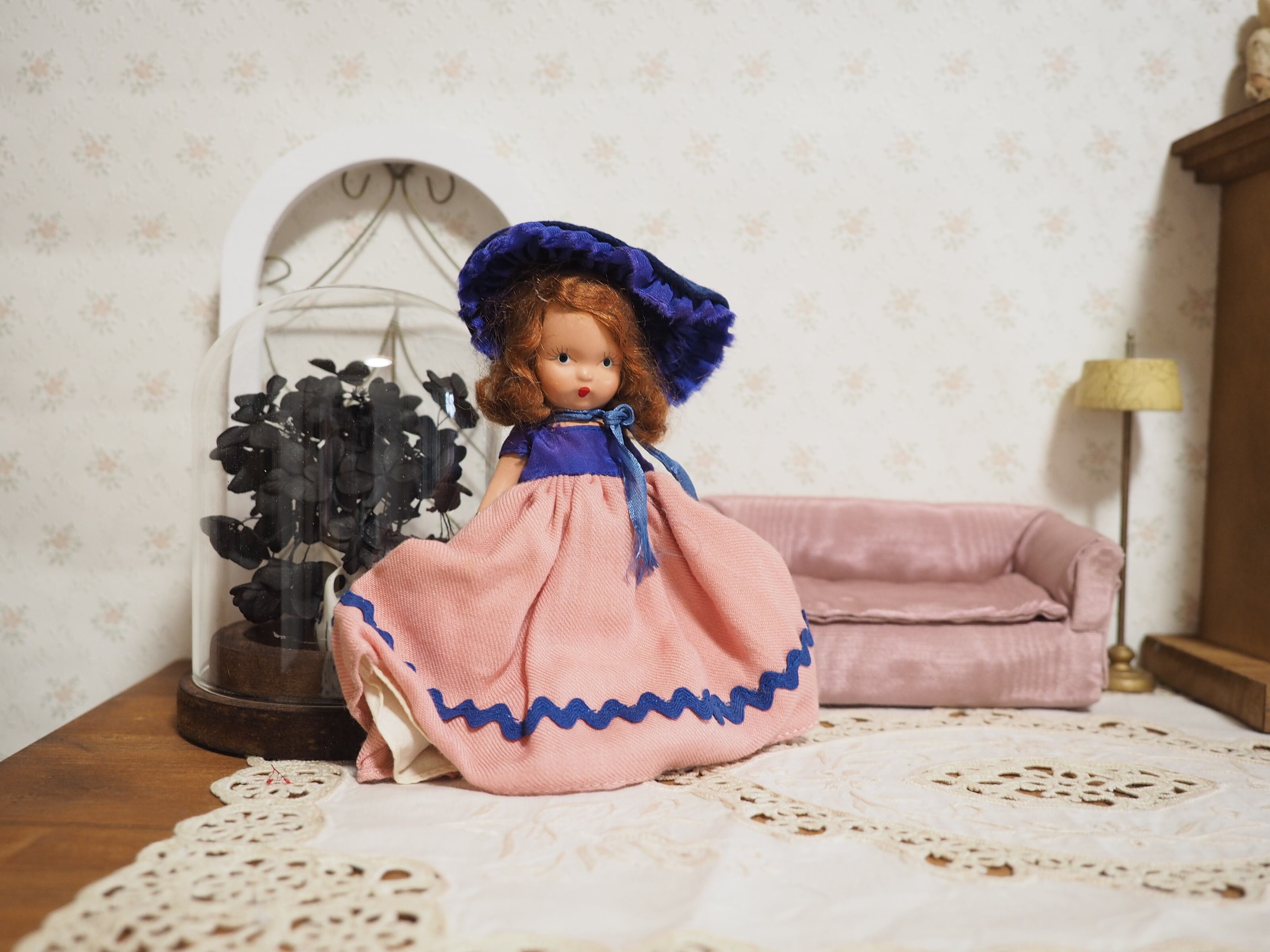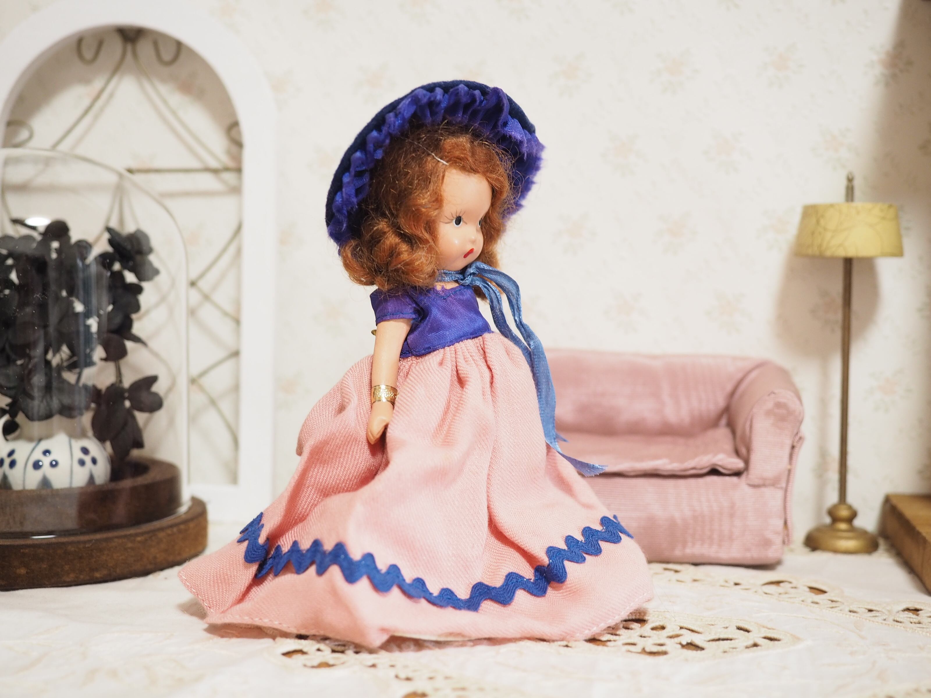 ブラウンカラーのヘアとボネとドレスのロイヤルブルー、優しいピンクカラーがとてもお似合いなナンシー・アンです。
