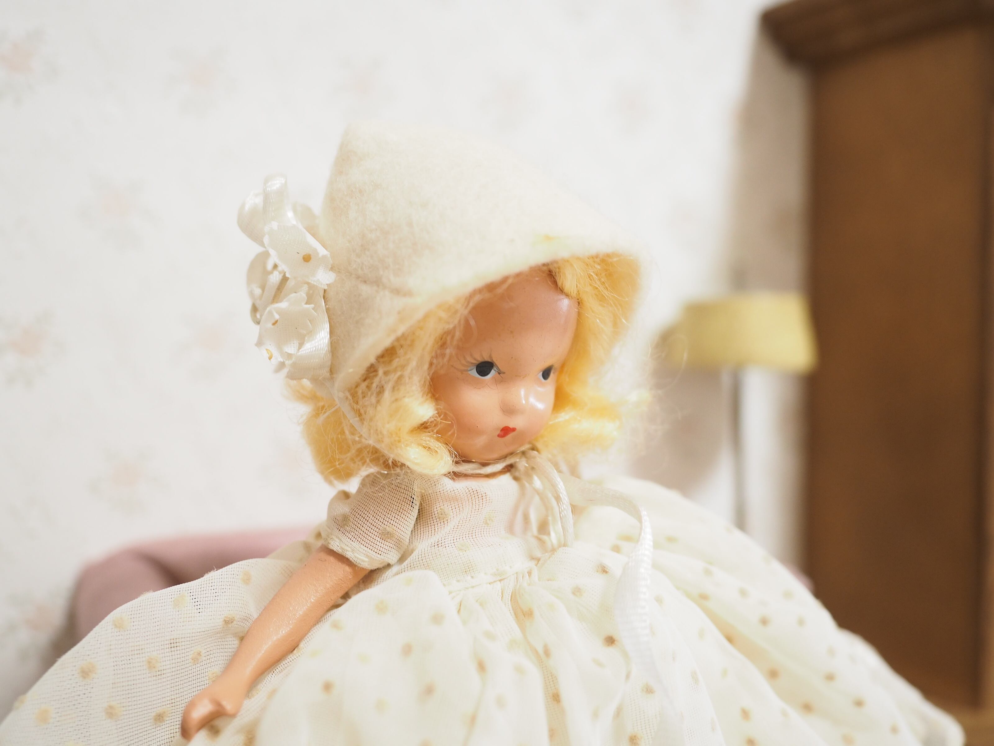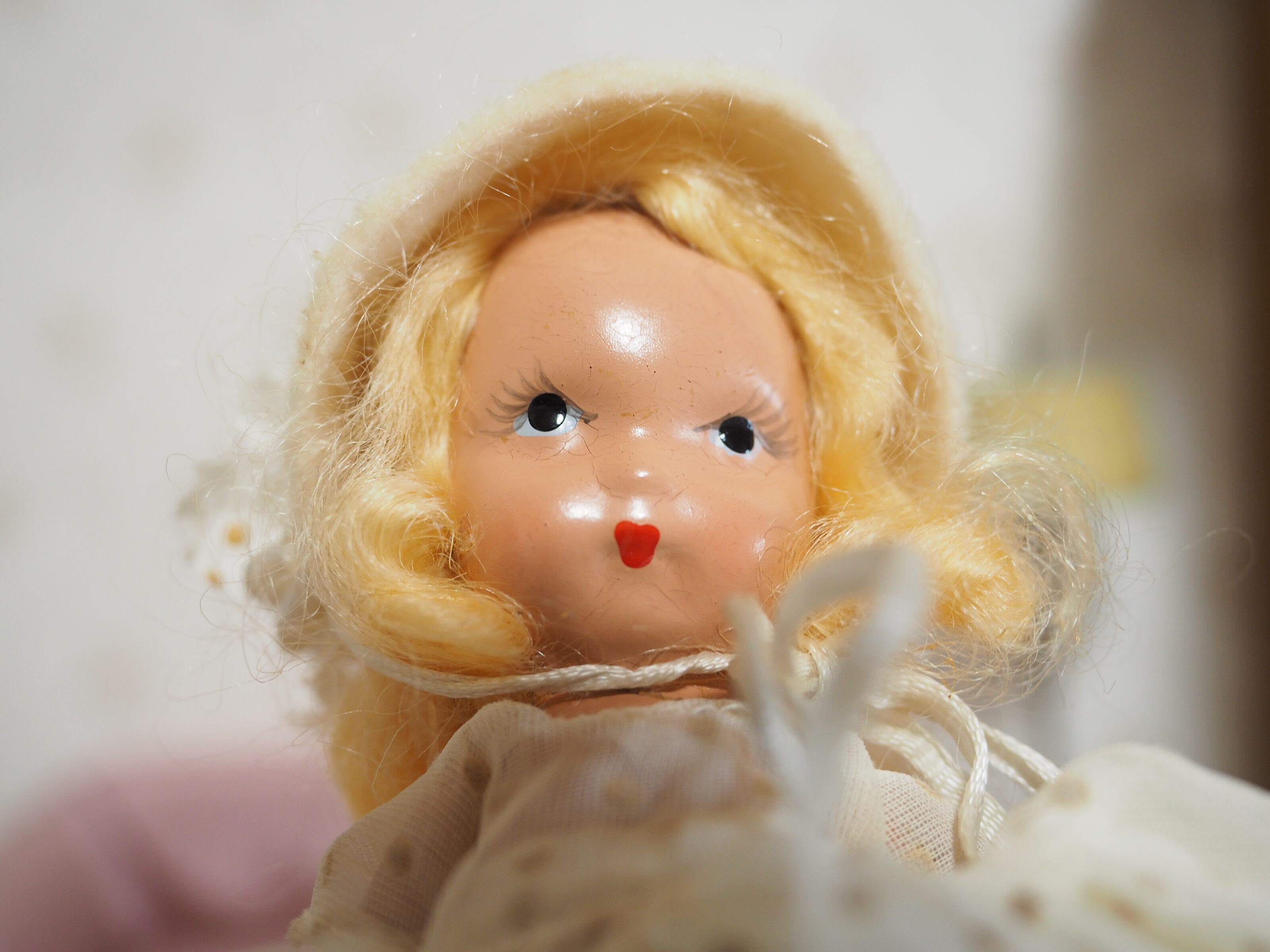 うつむき加減なお顔と、白無垢の花嫁さんのようなボネが奥ゆかしい雰囲気のナンシー・アンです。