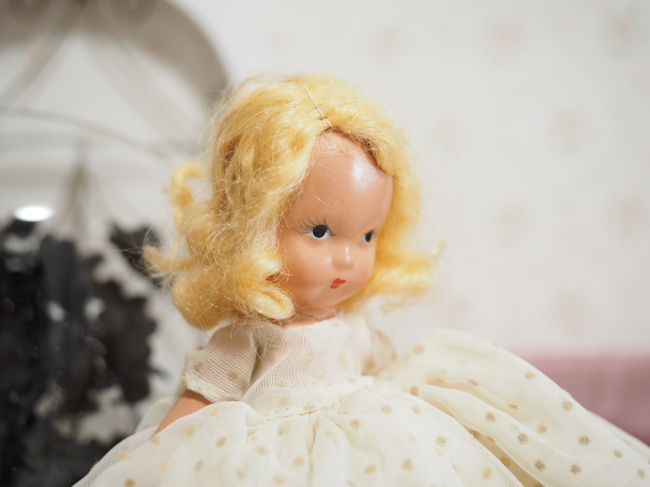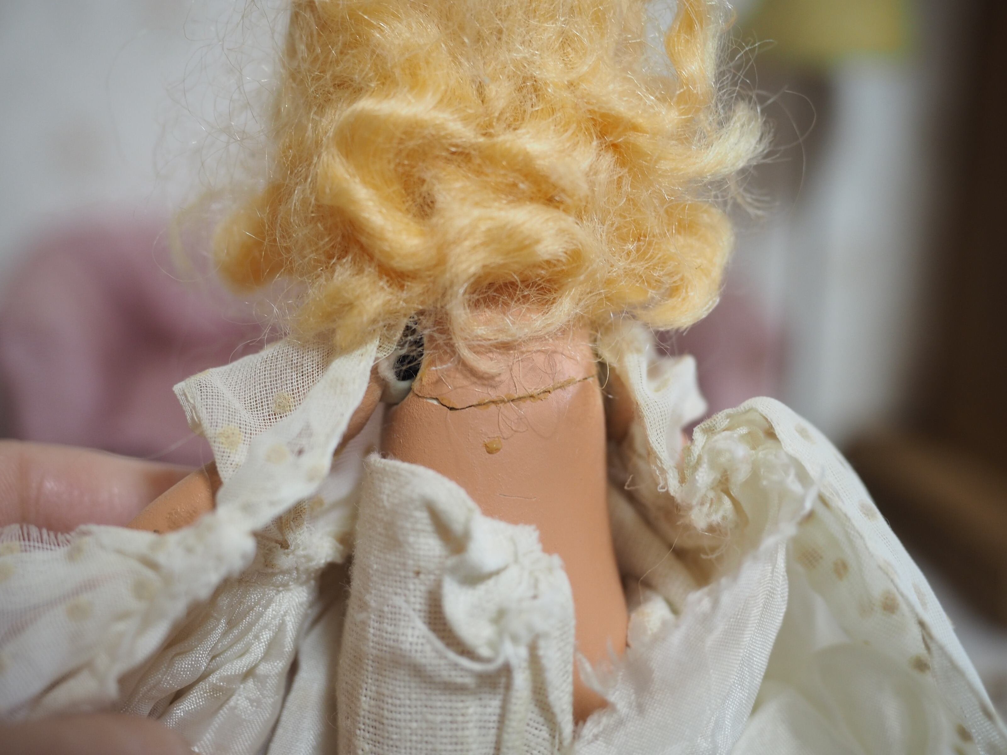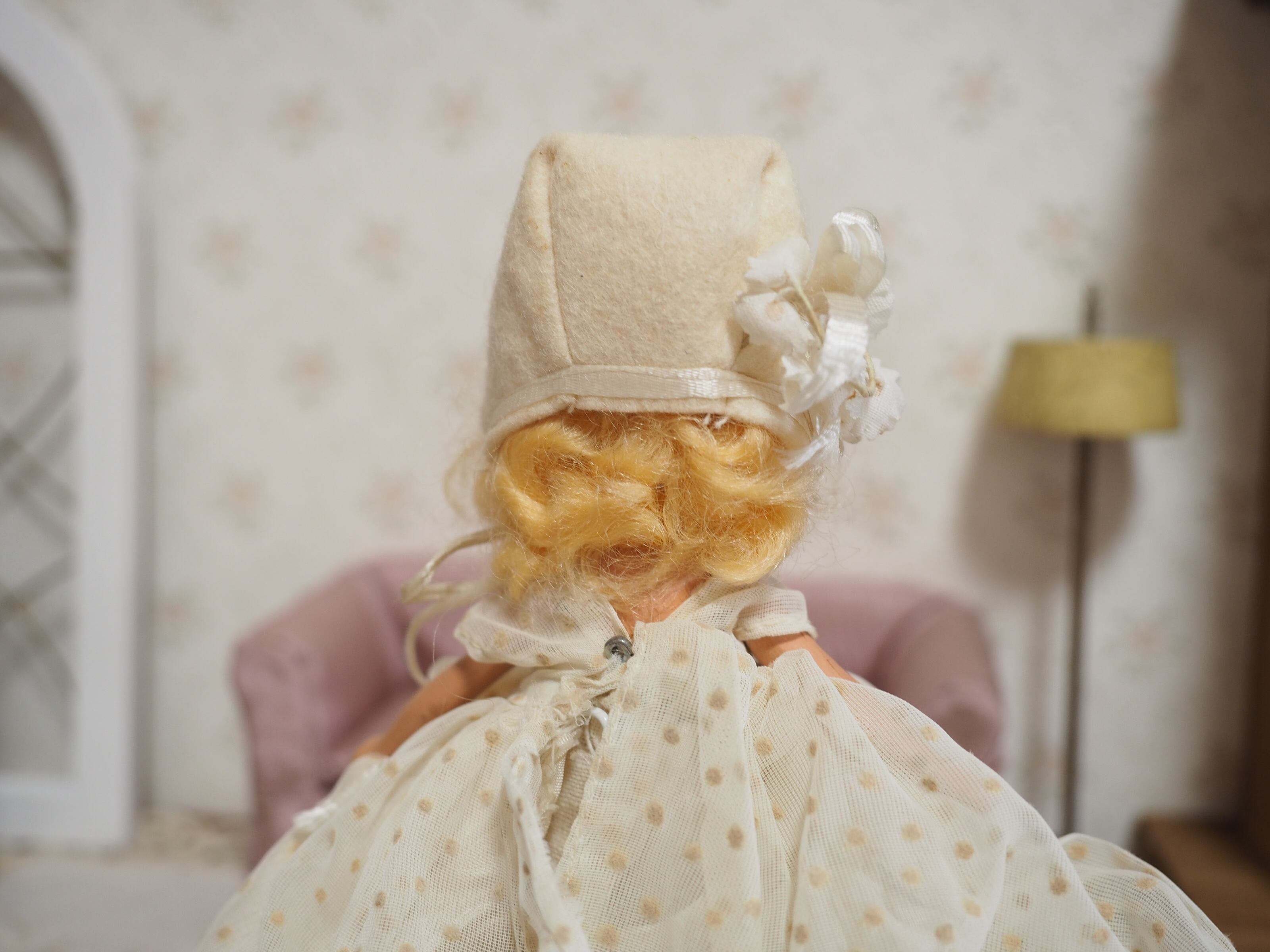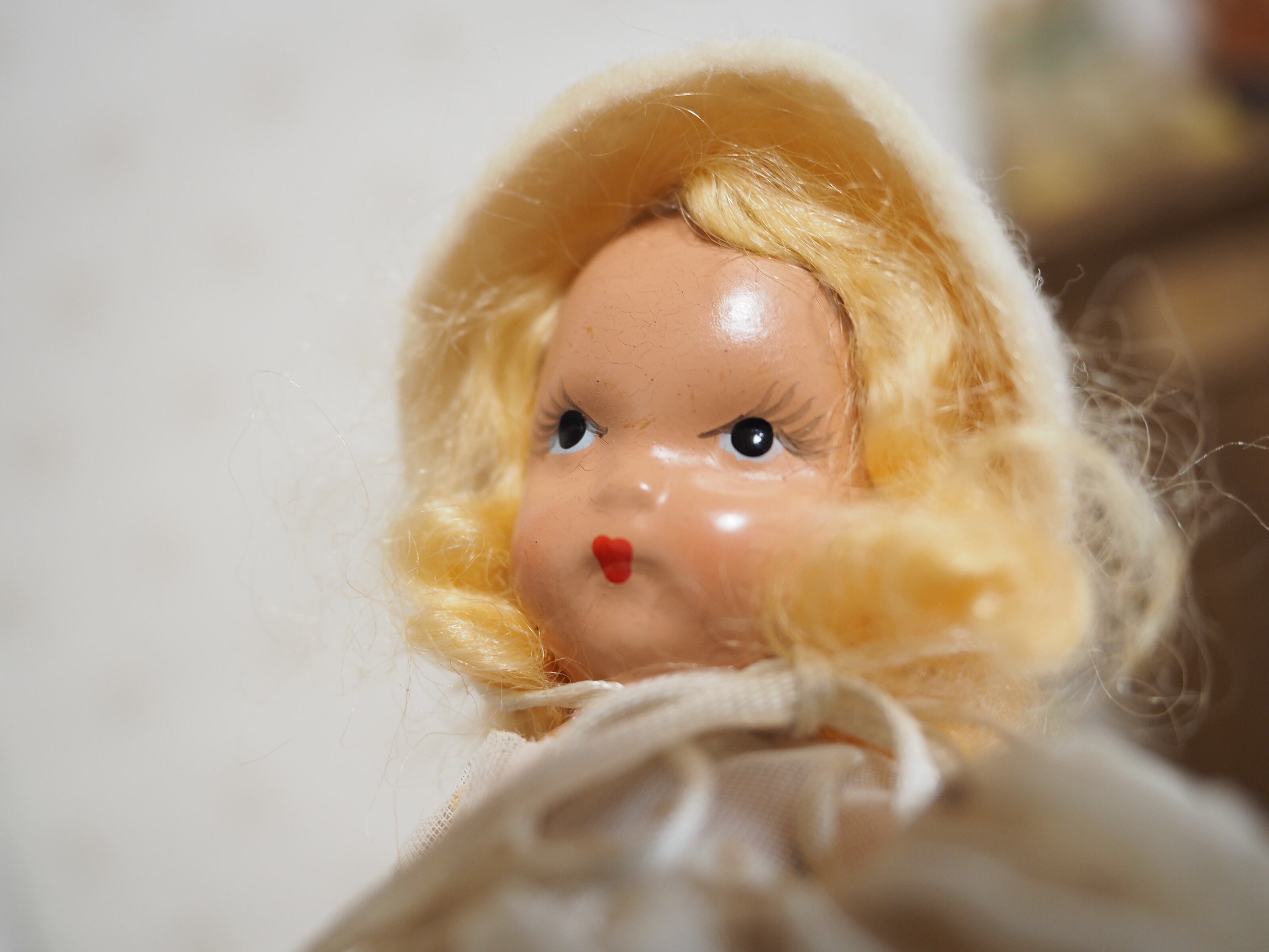 髪はモヘアウィッグで接着されており、ふわふわと少し乱れがありますが、きれいなウェーブにくるりと巻いたスタイルがチャーミング。