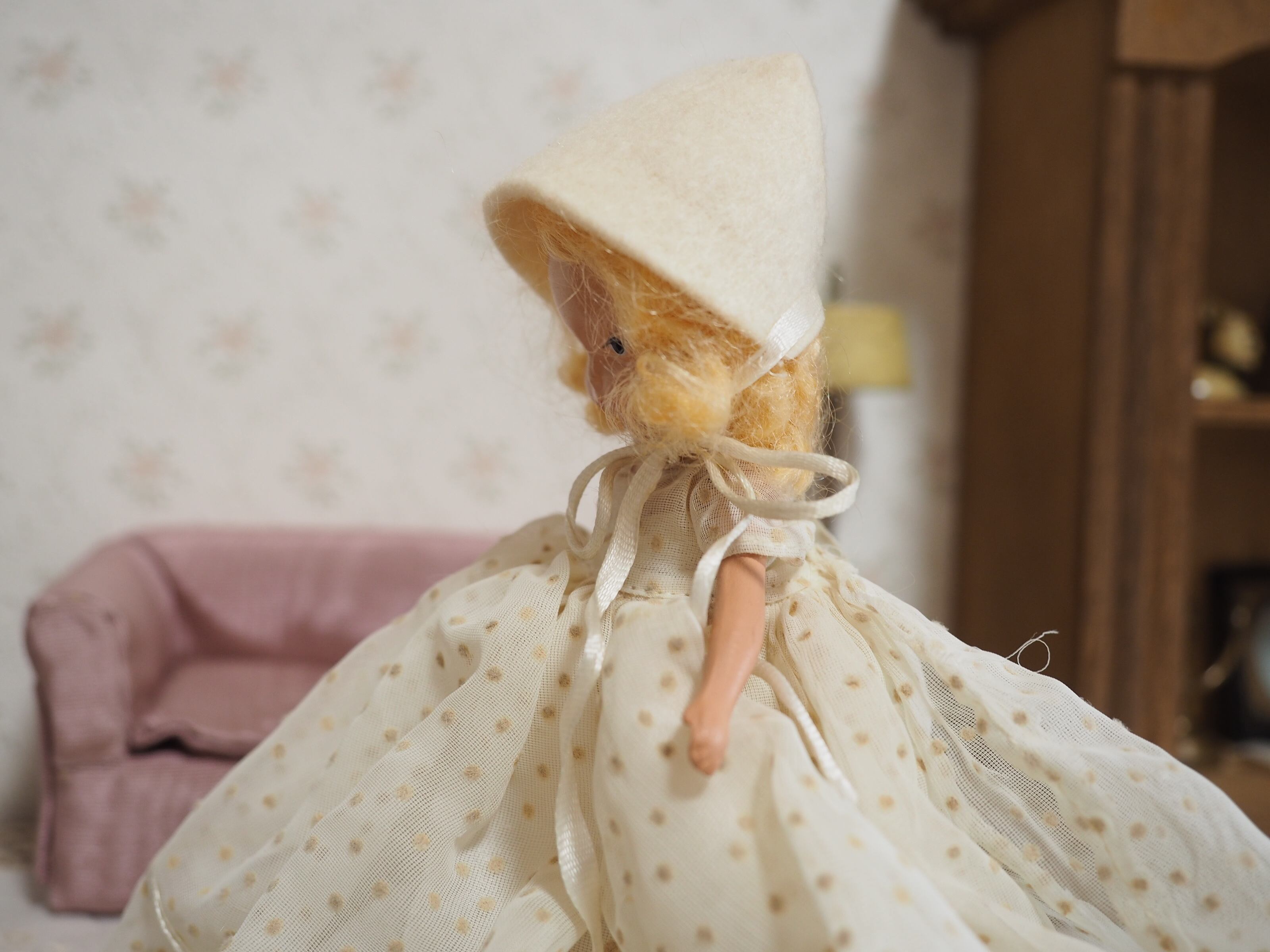白いフェルトのボネは後ろに角があり、花嫁さんの綿帽子のような雰囲気が素敵です。繊細な白い布花とリボンがあしらわれています。