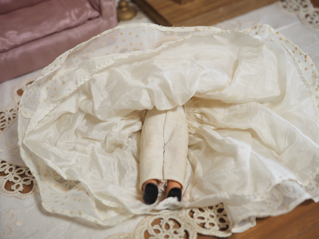 ドレスはふんわりしたサテンの裏地に水玉フロッキーの透けるスカート、裾リボンとボネが相まってなんともふんわりしたかわいらしさです。