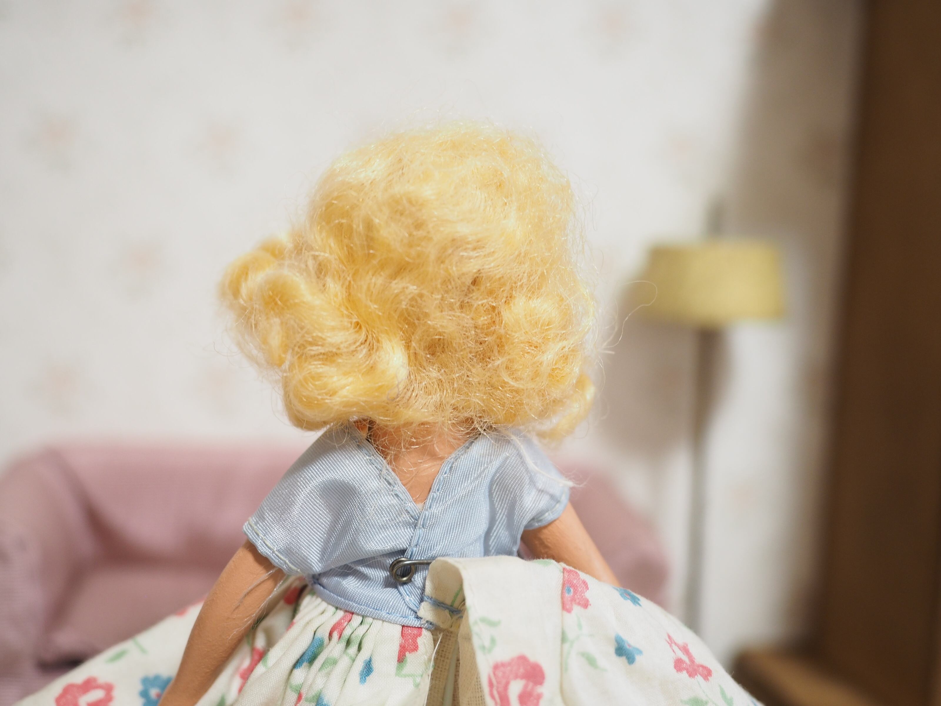 髪はモヘアウィッグで接着されており、ふわふわと少し乱れがありますが、きれいなウェーブにくるりと巻いたスタイルがチャーミング。