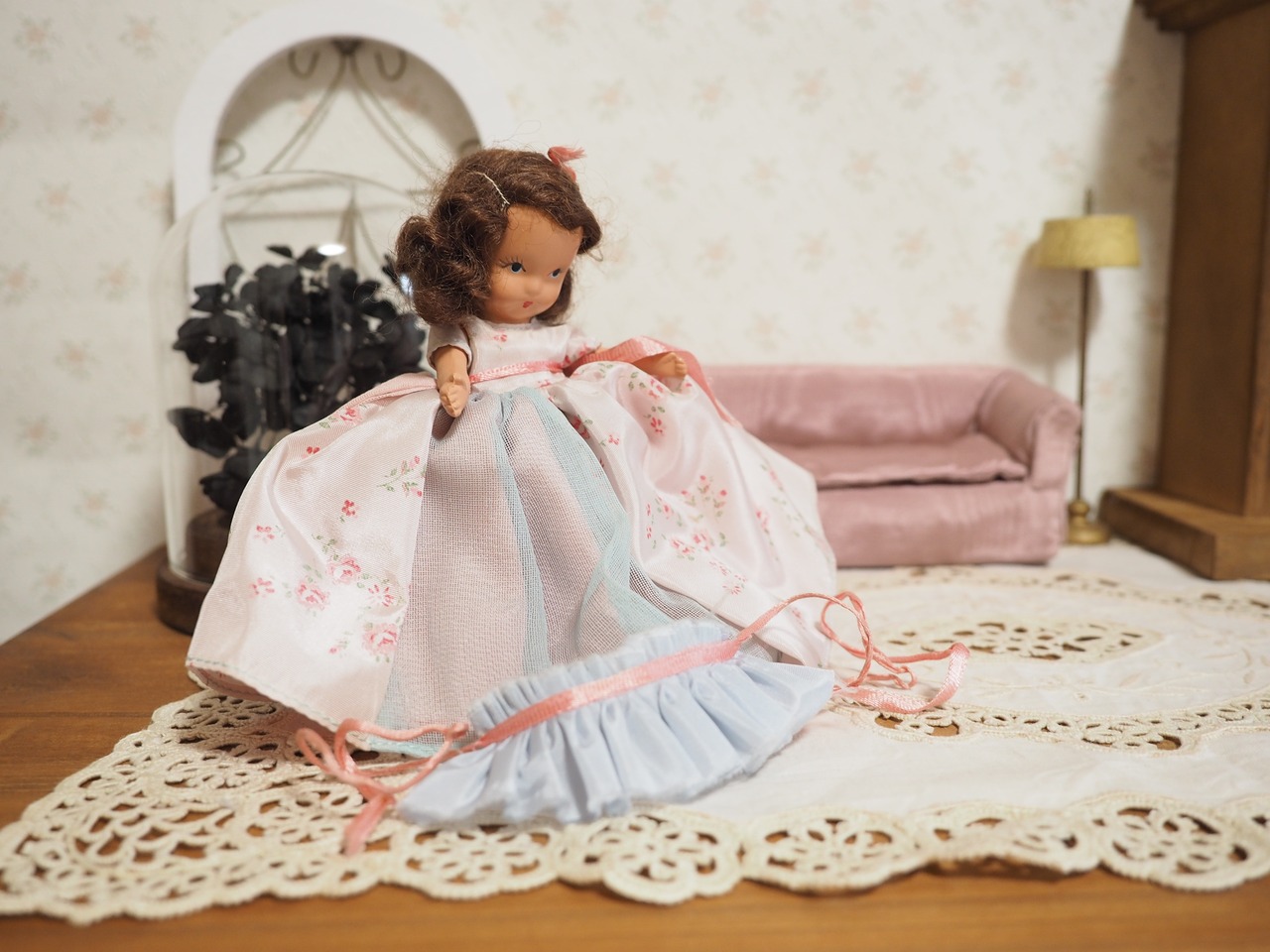 上品な薄いブルーのフリルに、ピンクリボンの頭飾りがロマンチックです。