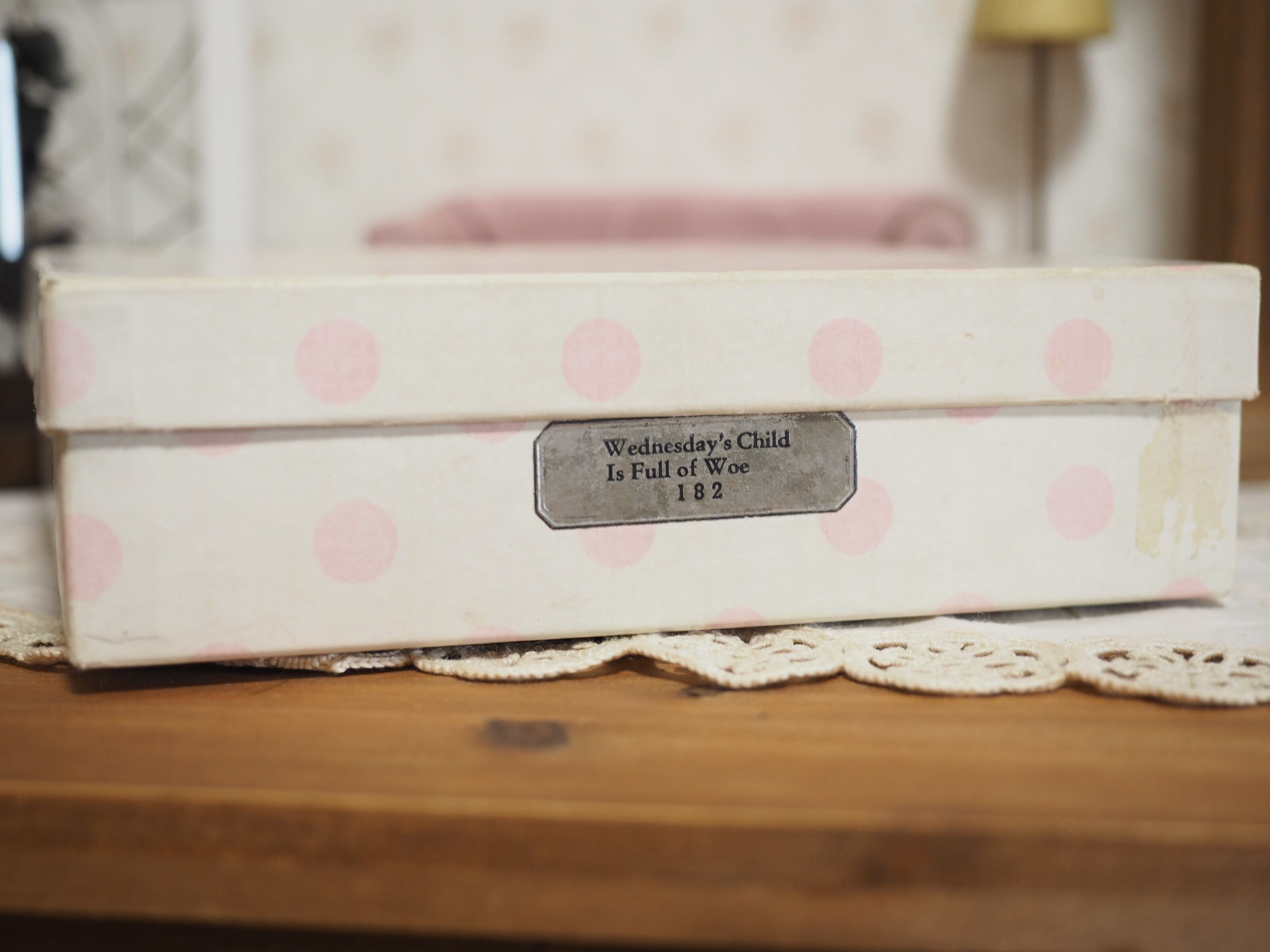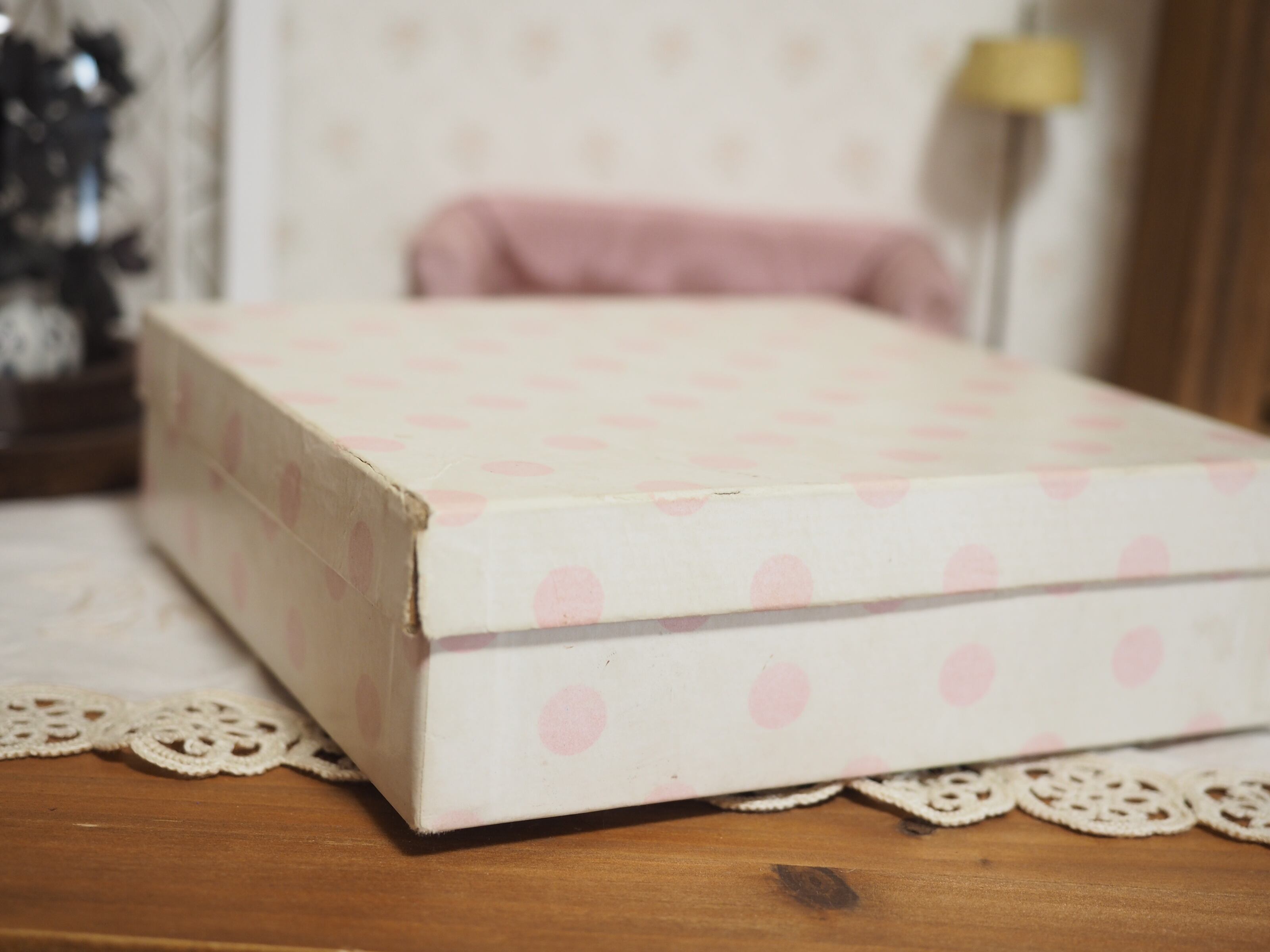 淡い水玉模様が素敵なオリジナルの箱付きです。箱も70年以上前のもので傷み、変色がございます。