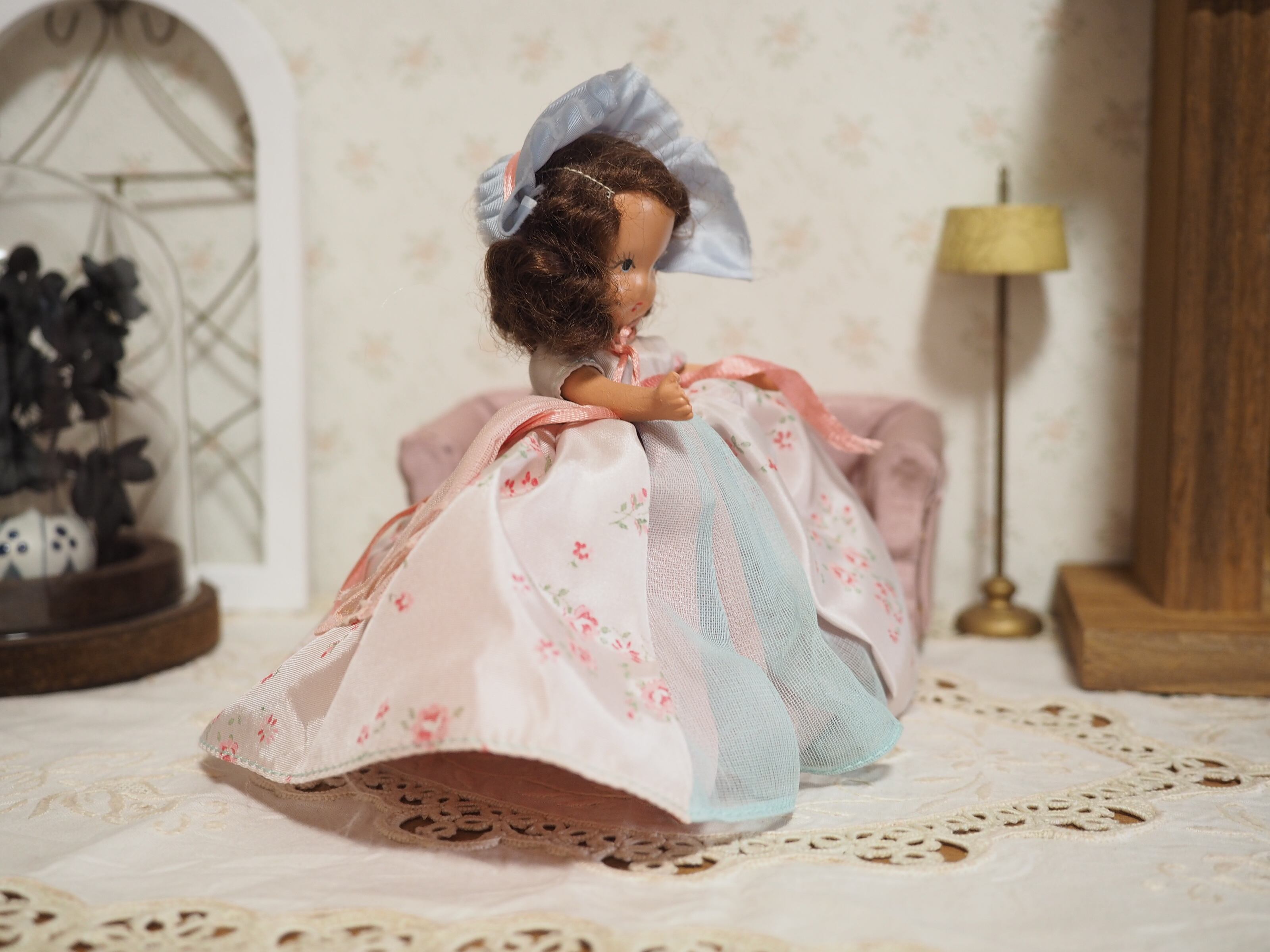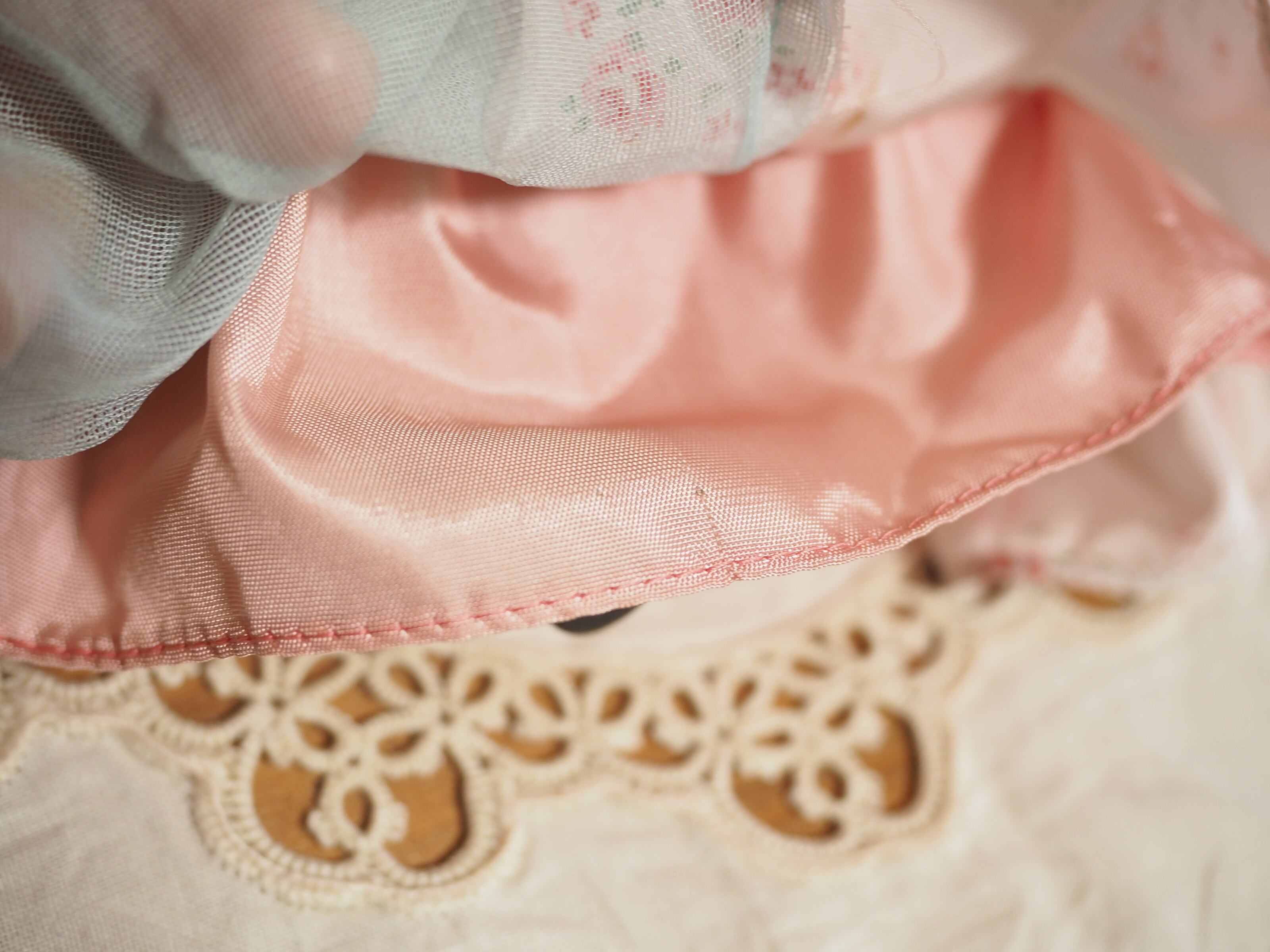 ドレスはごく薄い水色のサテンにバラや小花が淡くプリントされ、裏地はピンクのサテン、真ん中ややサイドのつなぎ目は淡いグリーンがかった透ける素材があしらわれ、なんとも美しい色の重なりとなっています。ドレス右手に薄ピンクのウエスト飾りがございます。とても素敵なデザインです。