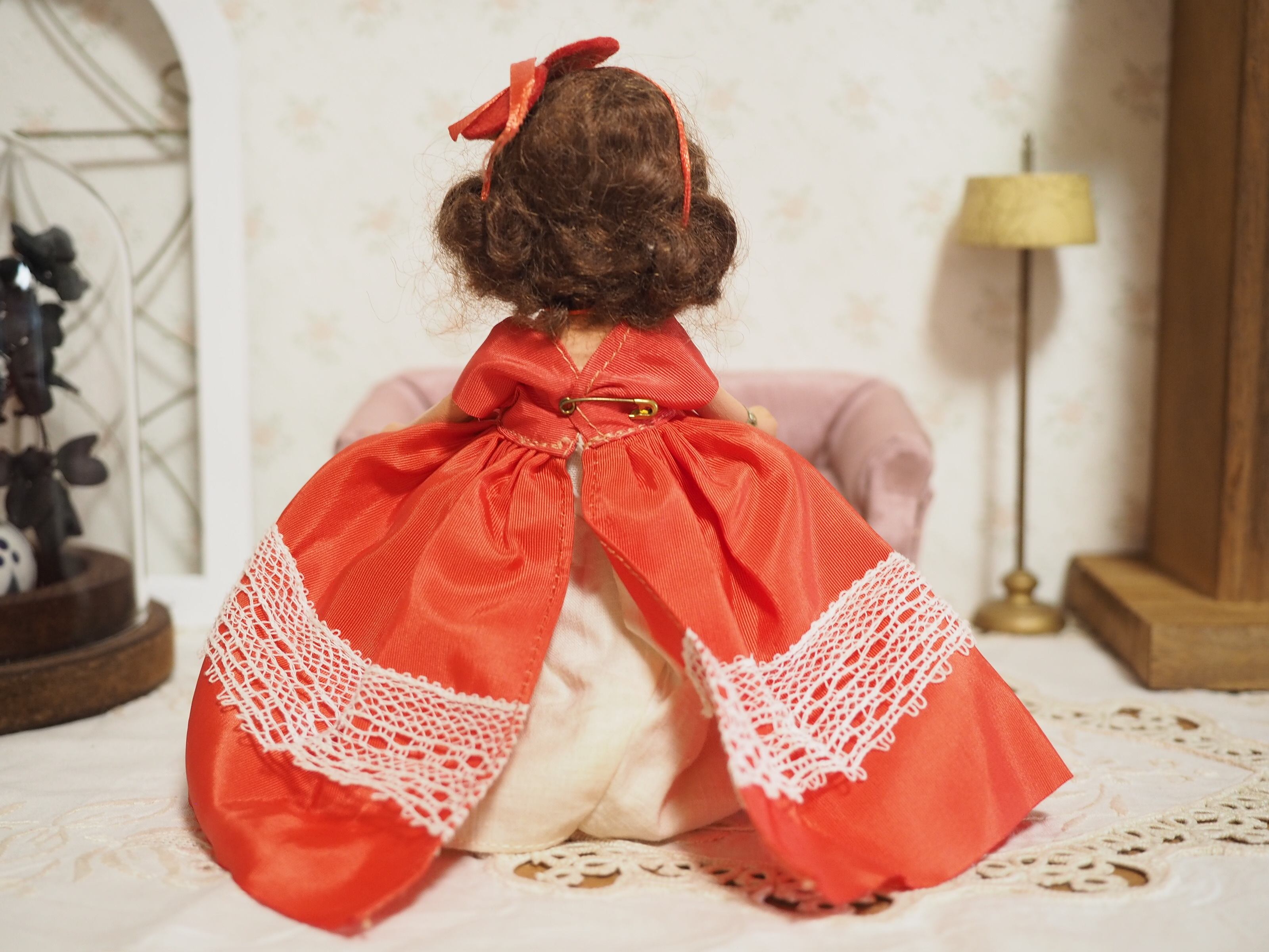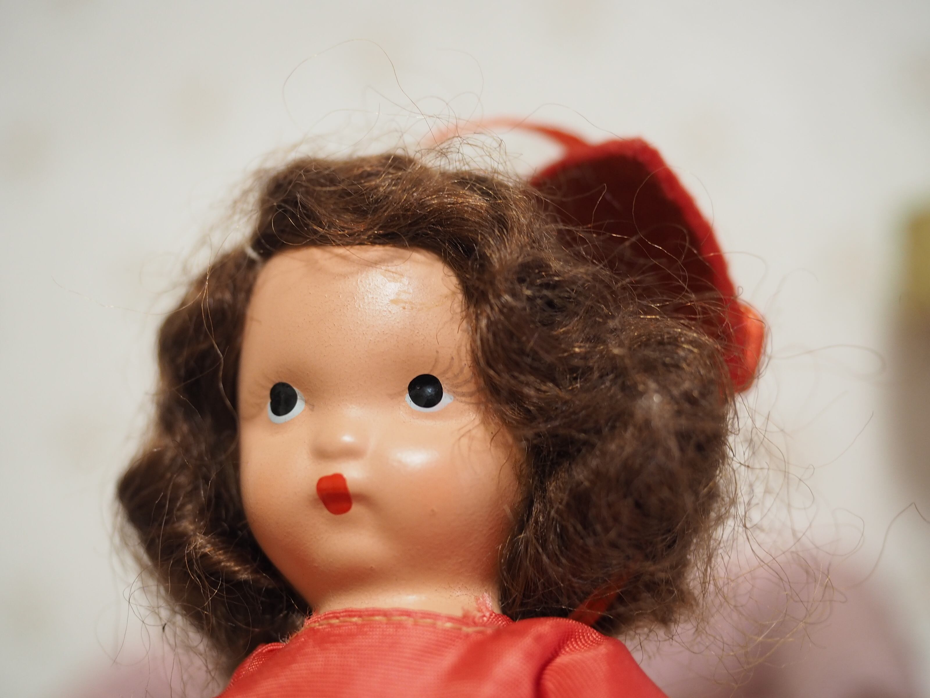 髪はモヘアウィッグで接着されており、ふわふわと少し乱れがありますが、きれいなウェーブにくるりと巻いたスタイルがチャーミング。