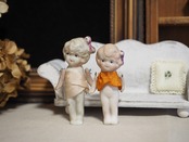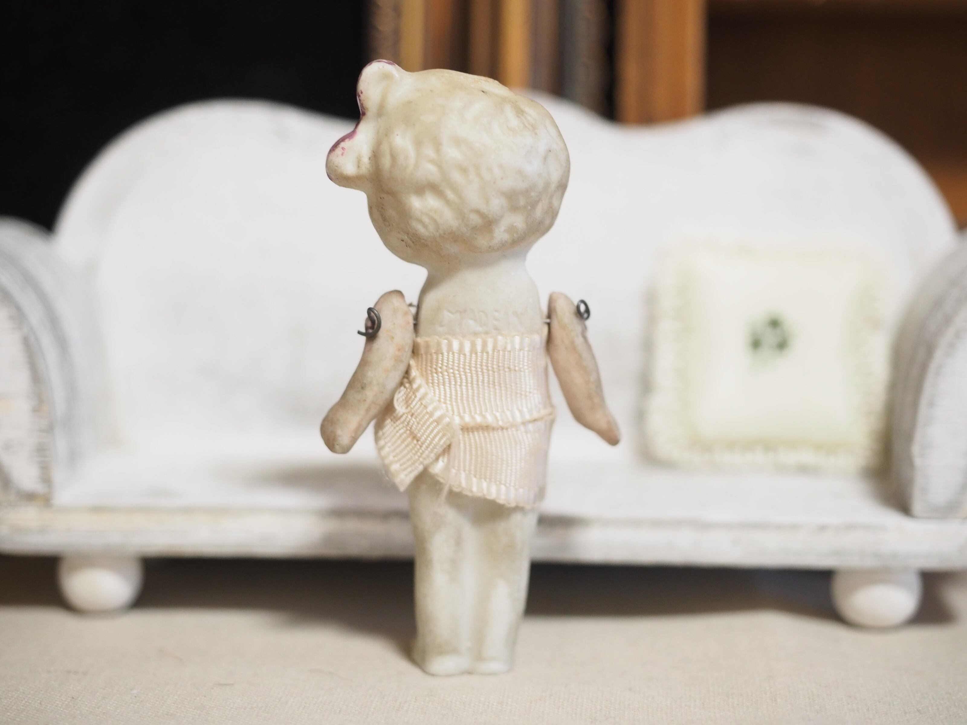 小さいですがふんわりした髪の成形、髪やお顔もきれいにペイントされ、鮮やかなオレンジのお洋服を着たビスクドールです。
