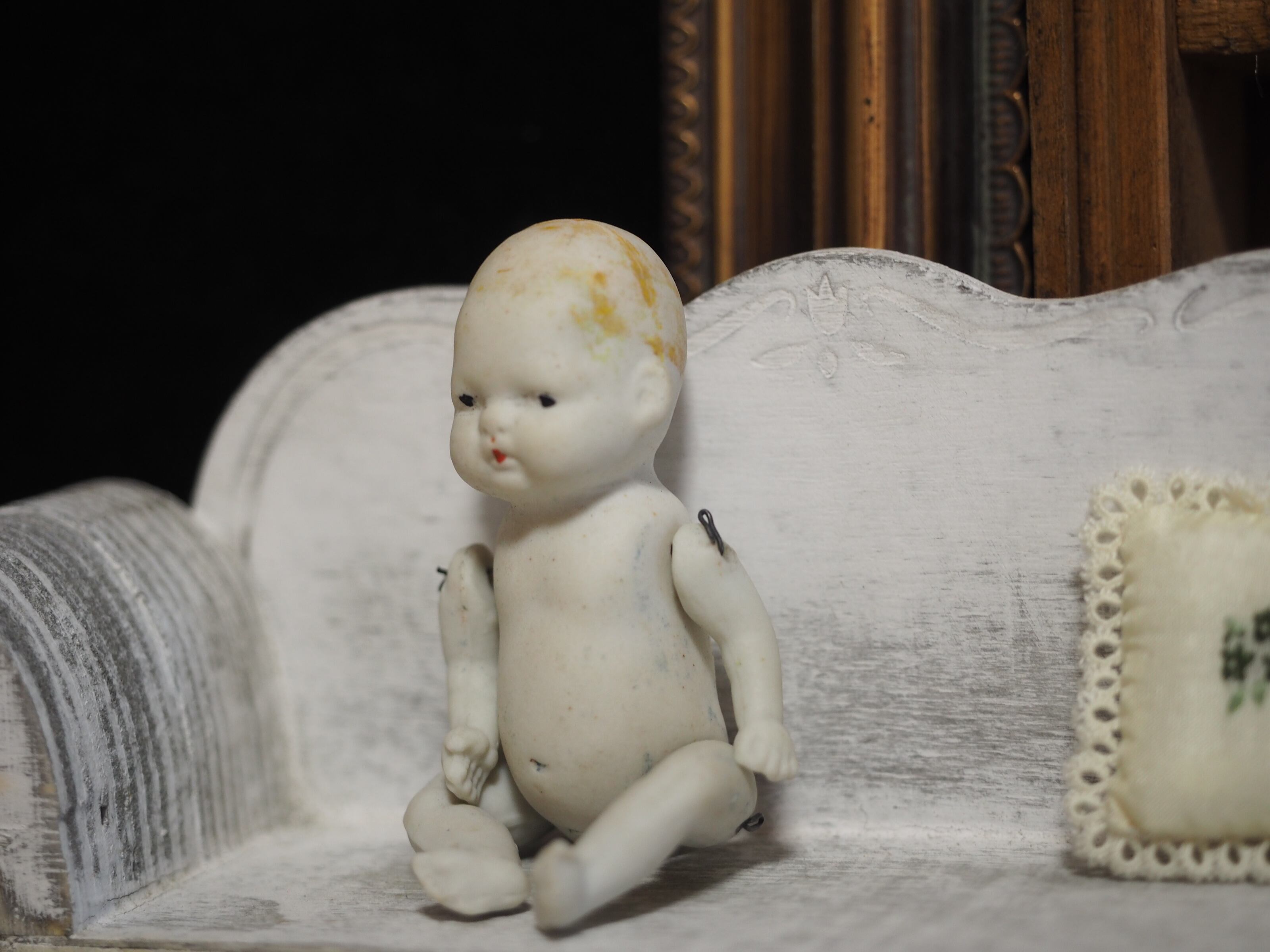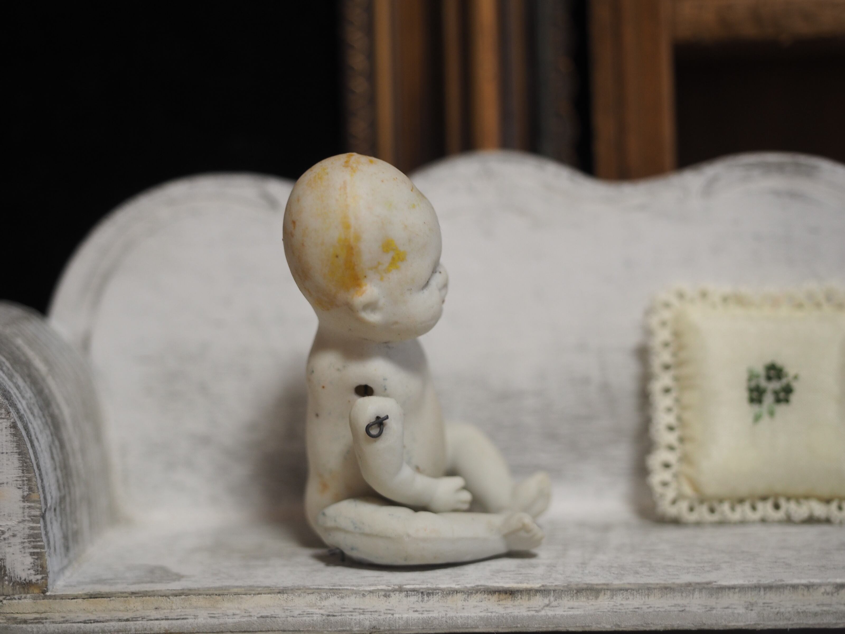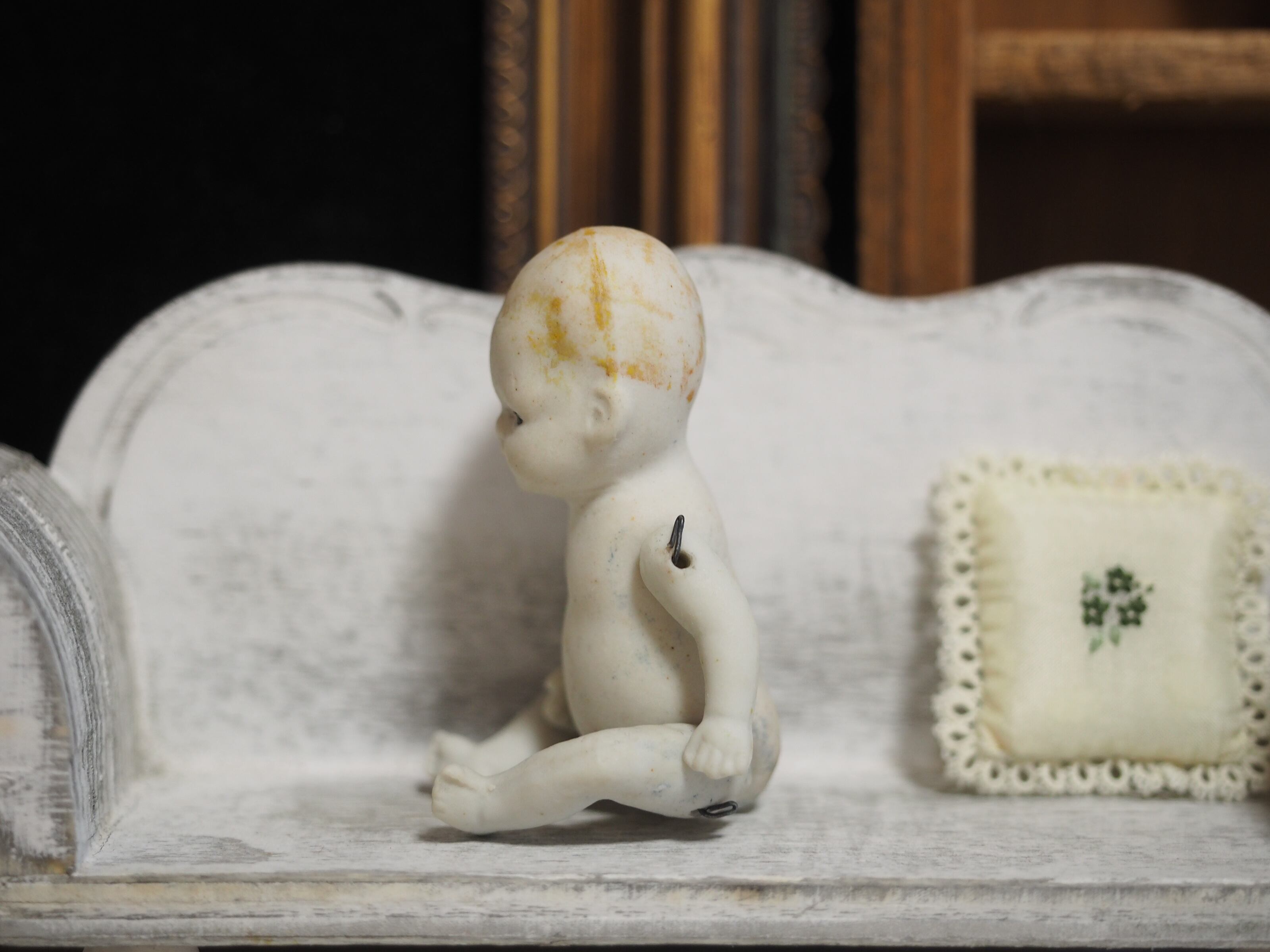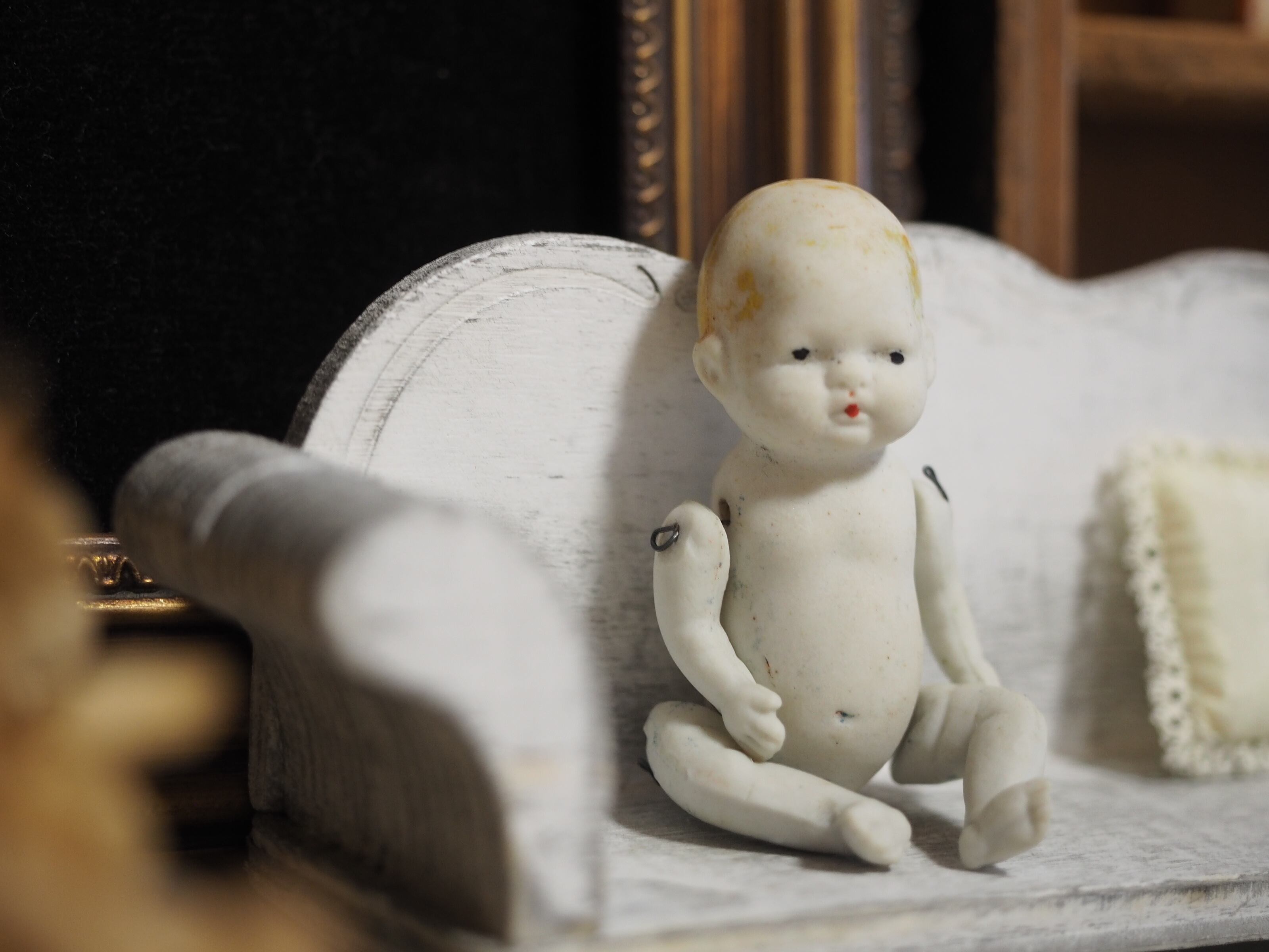 小さく白いボディに力の抜けたような座り姿が魅力的なビスクドールです。