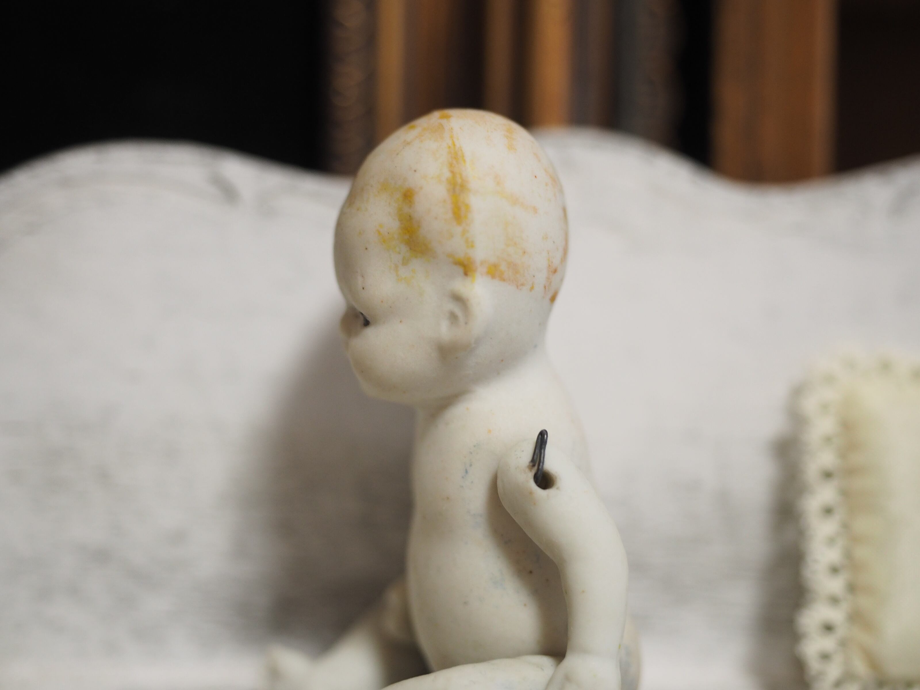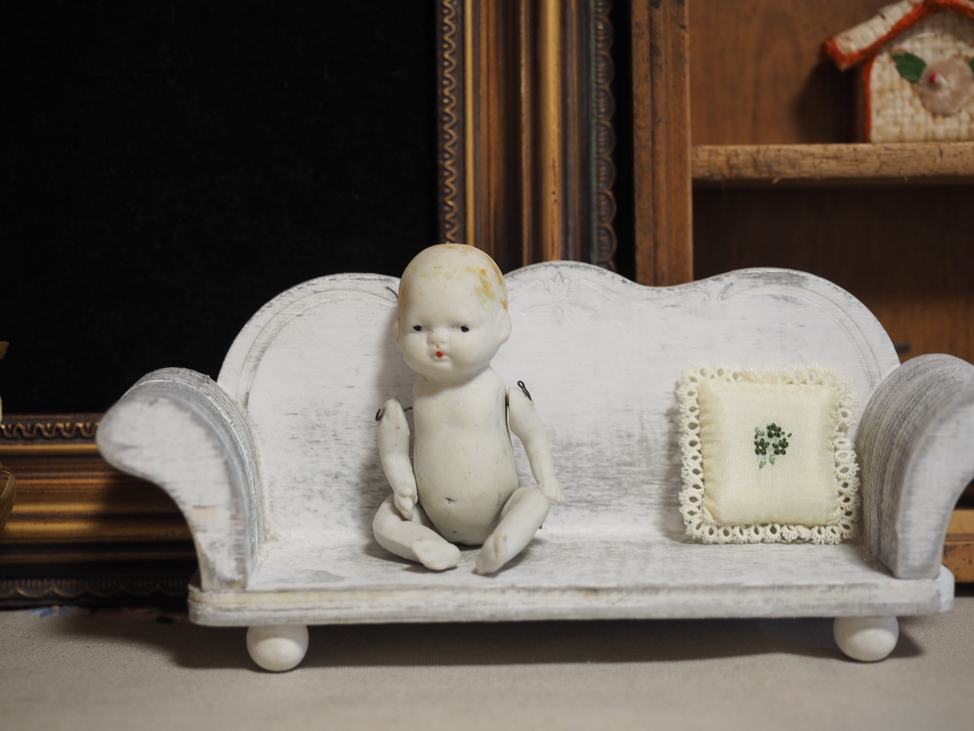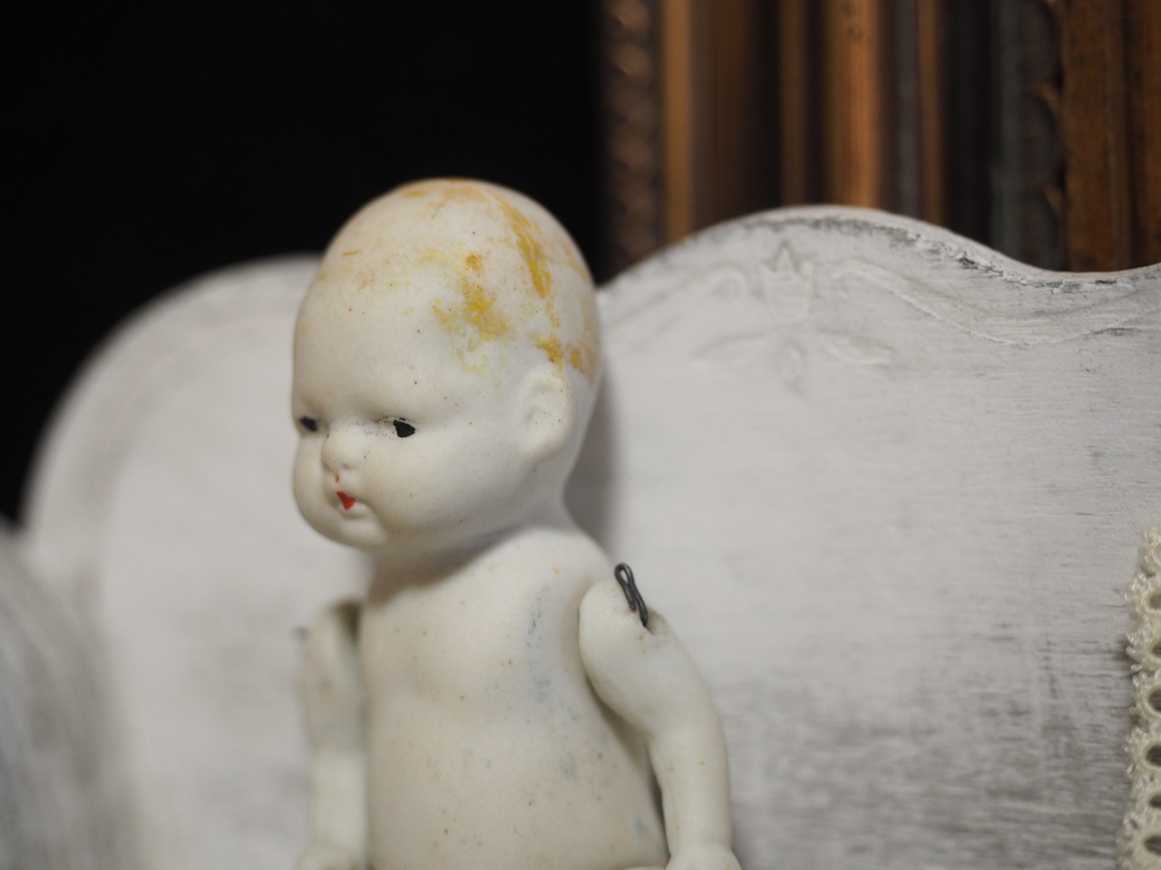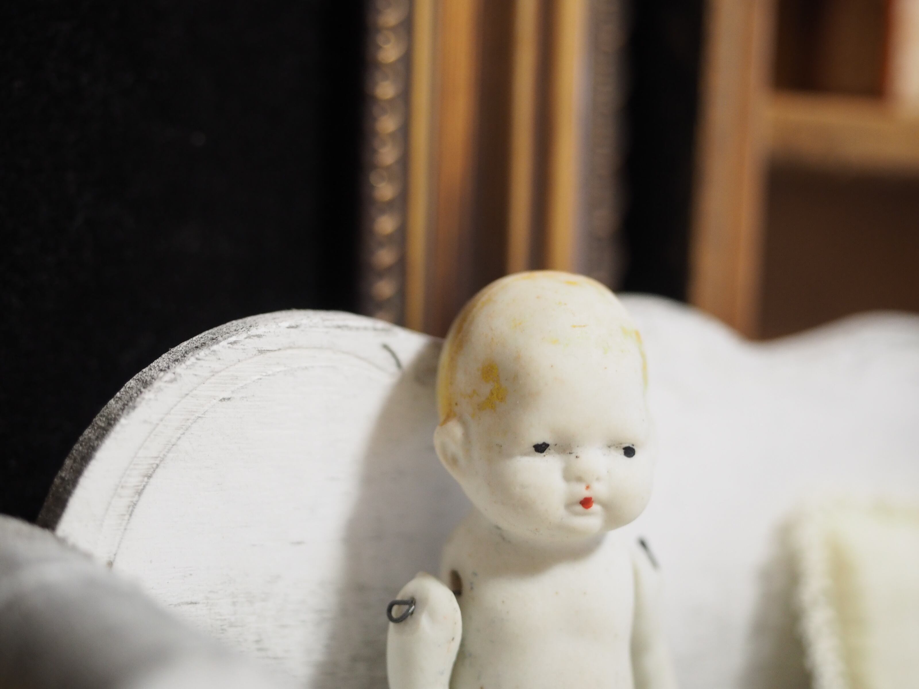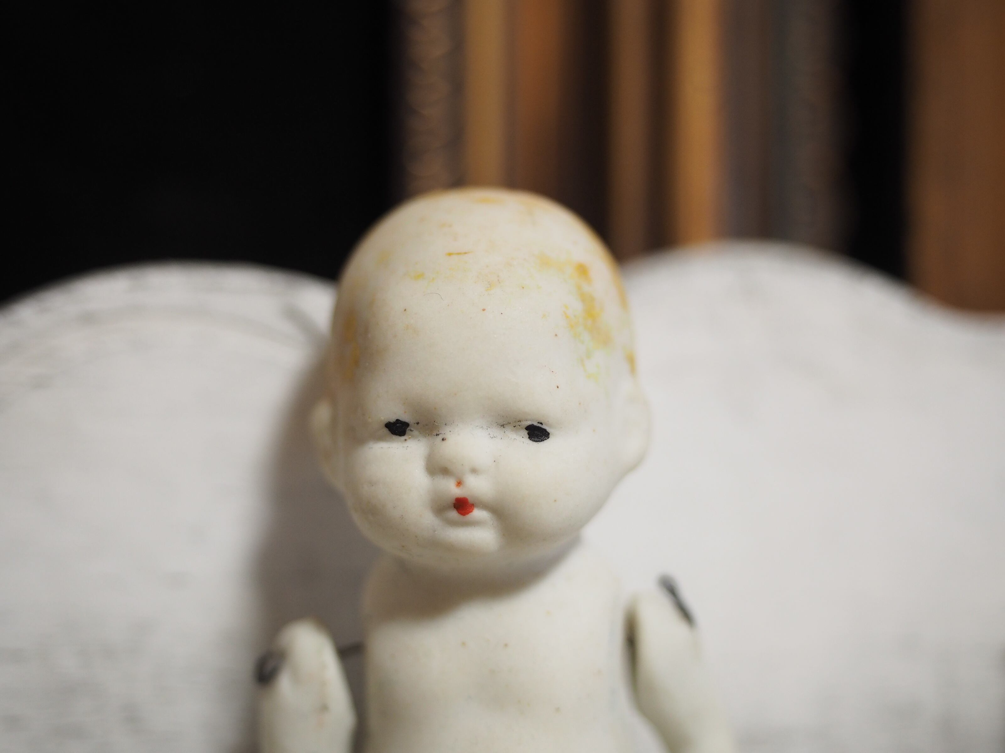 小さく白いボディに力の抜けたような座り姿が魅力的なビスクドールです。
