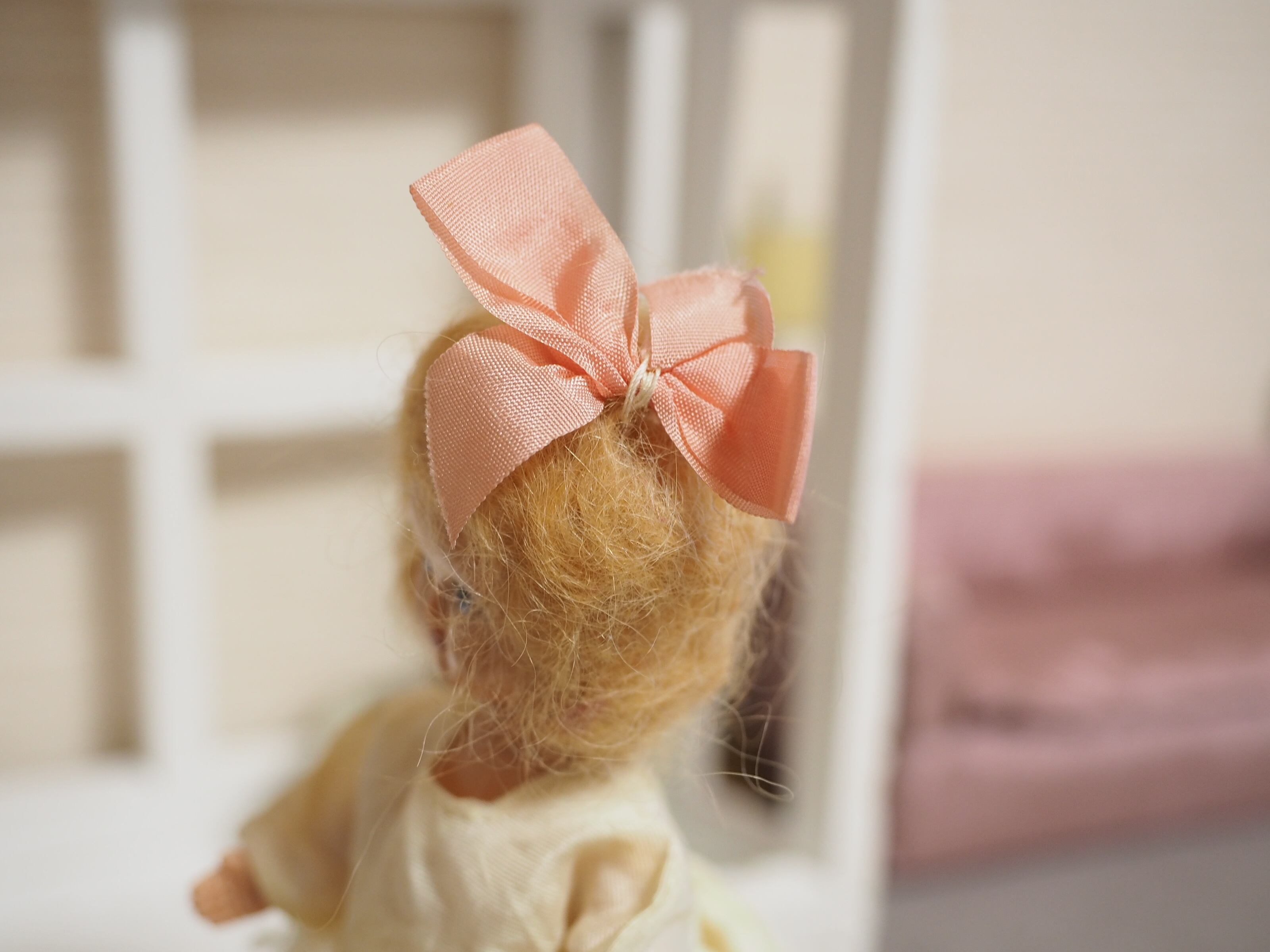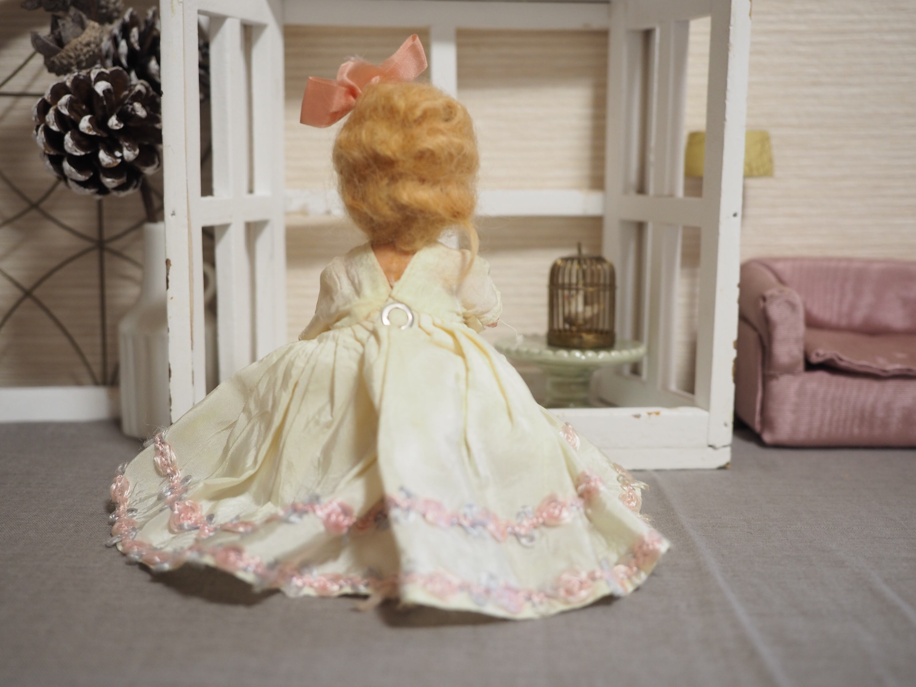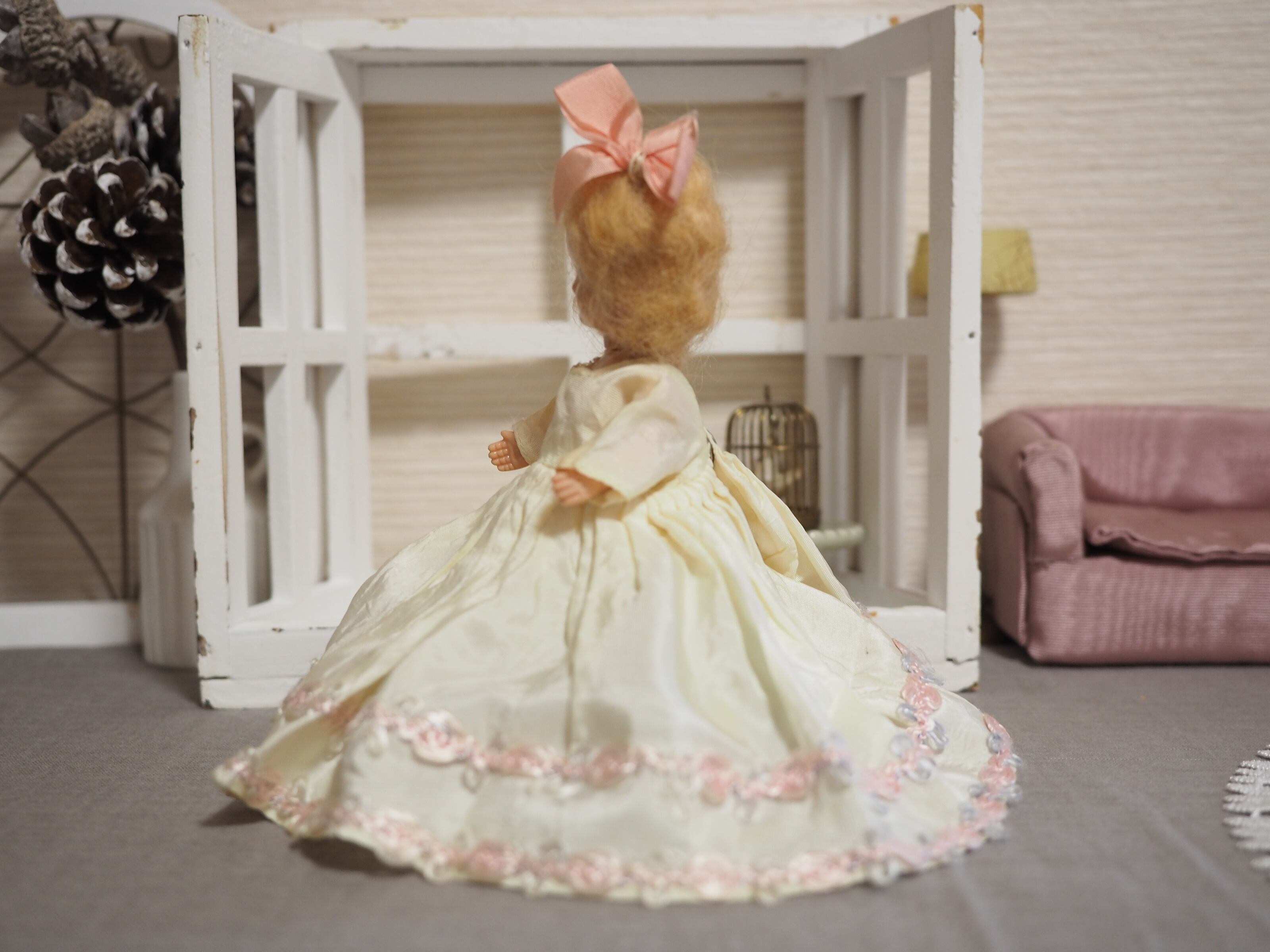 クリーム色のドレスは裾のリボンが素敵です。前側は色あせていますが、後ろ側は色が残っていてピンクとブルーの素敵な色合いのリボンです。