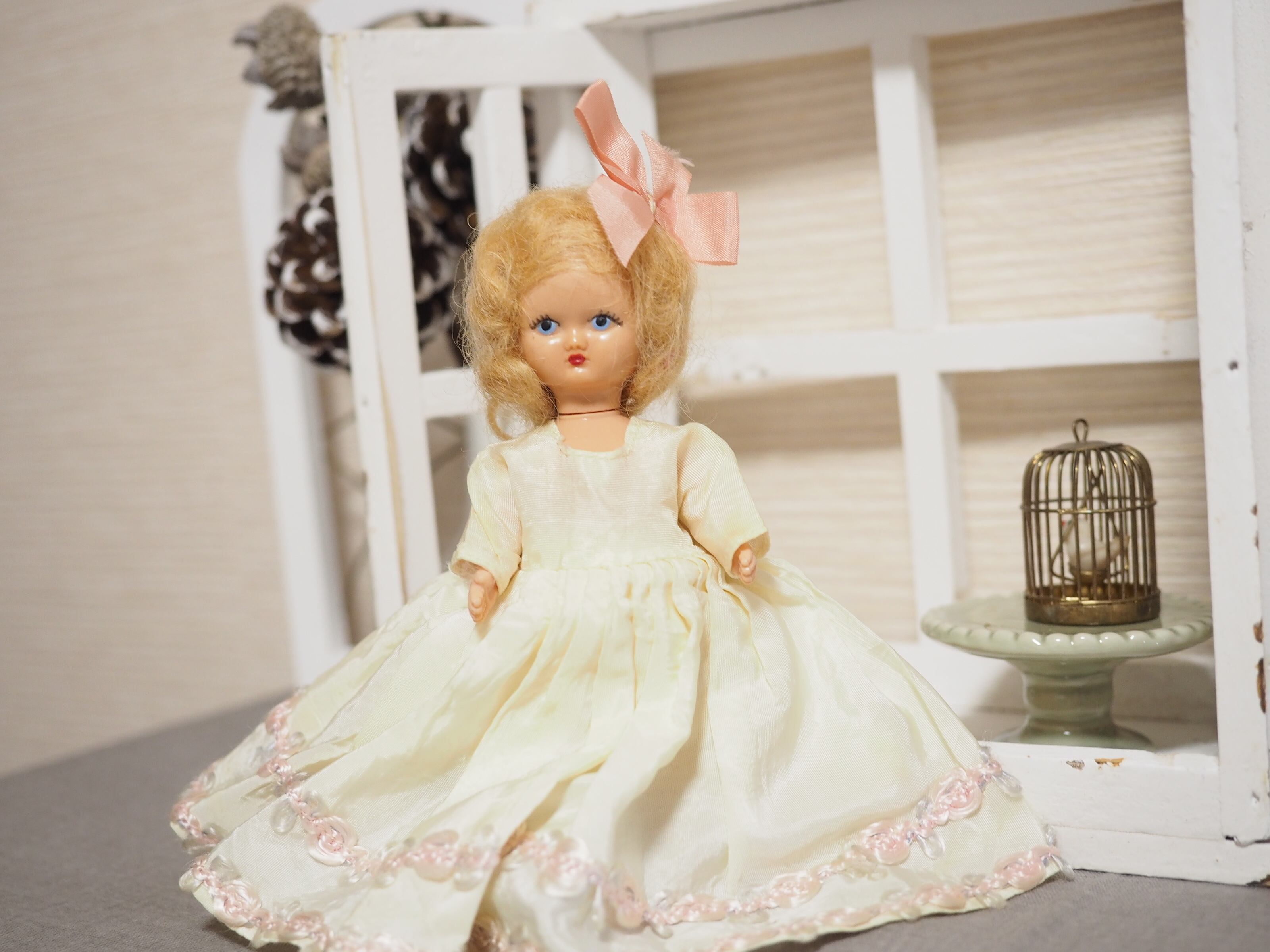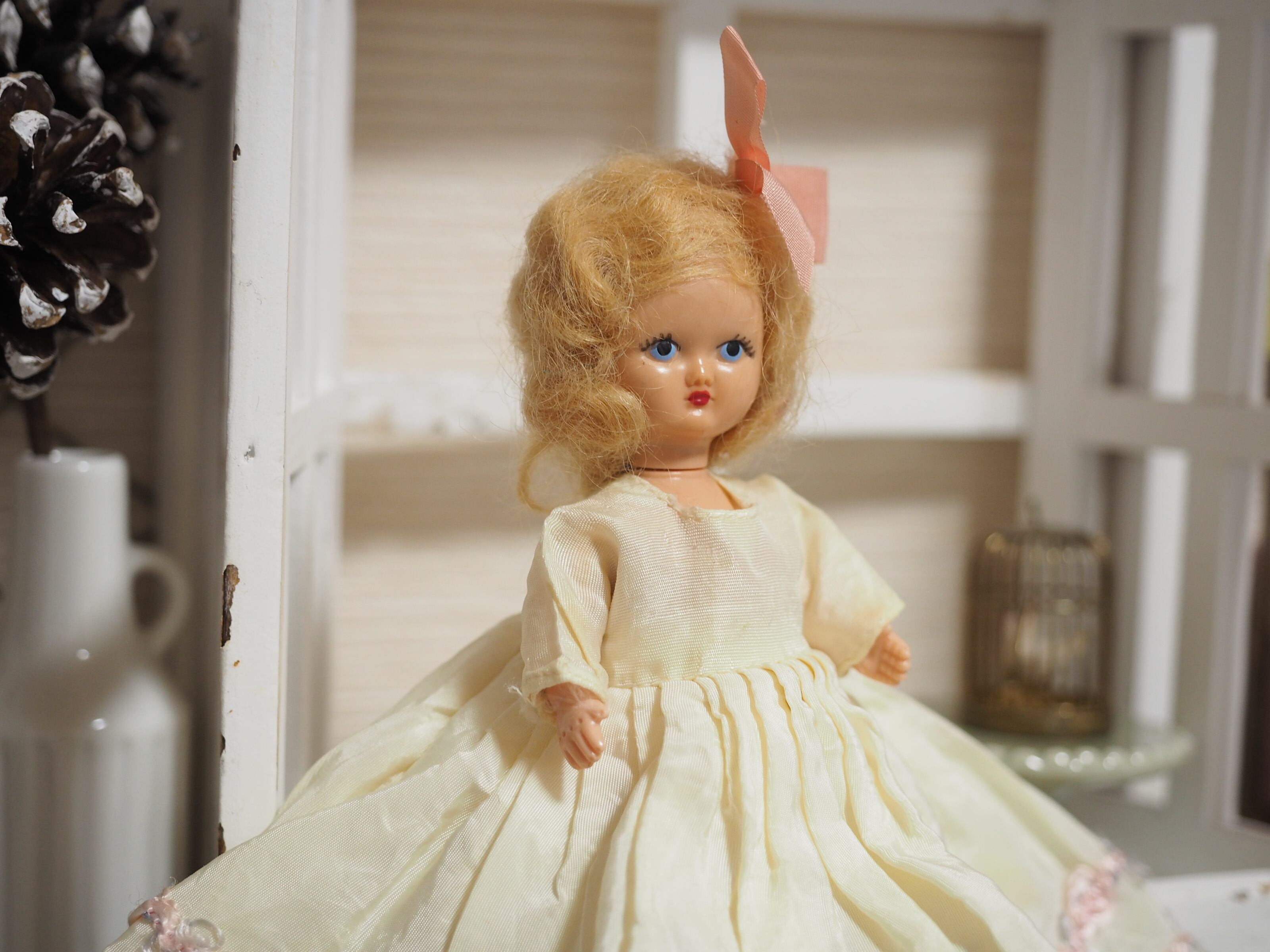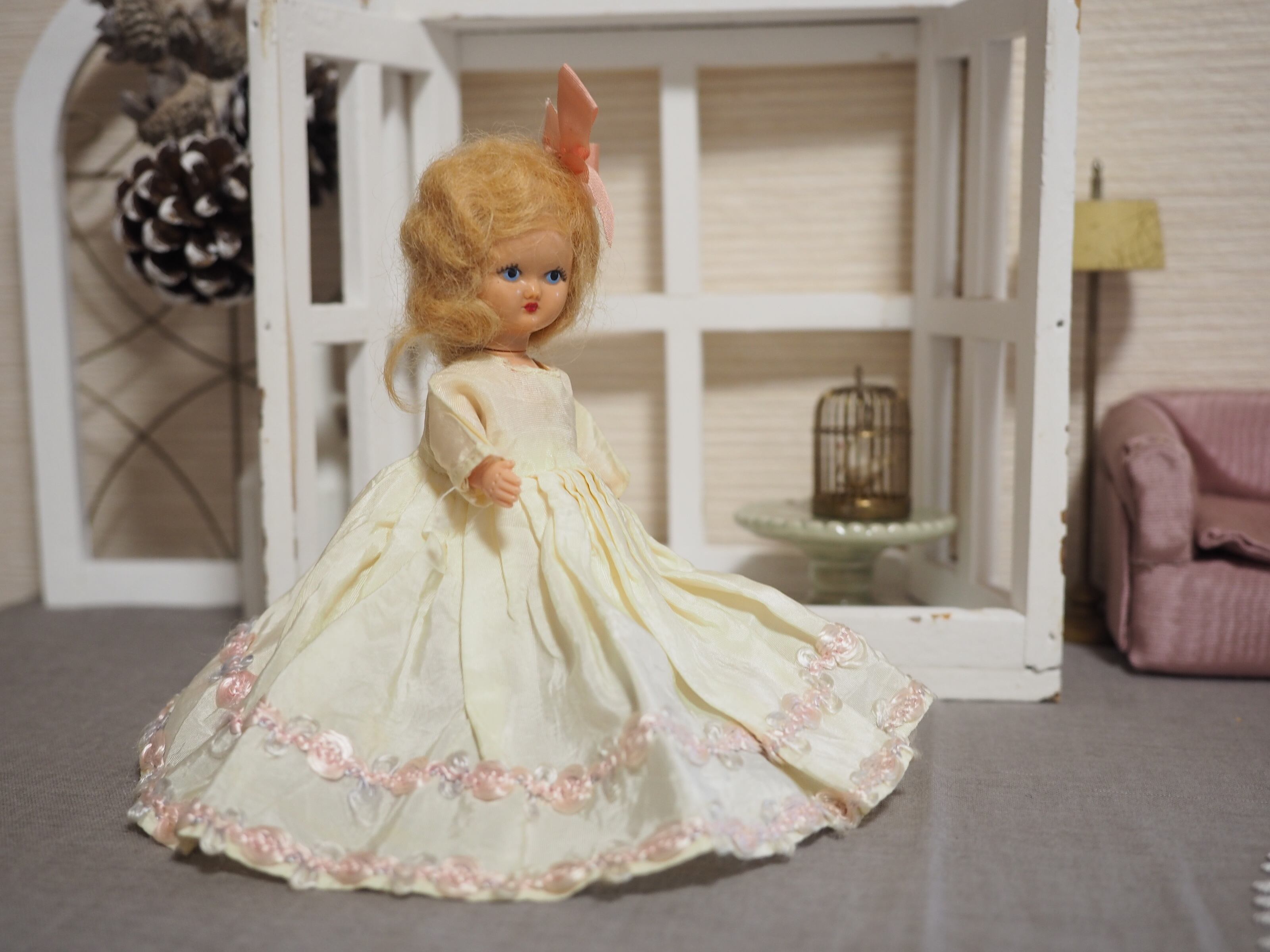 白いドレスとピンクリボンのプラスチックドール Hollywood Doll Mfg Co.