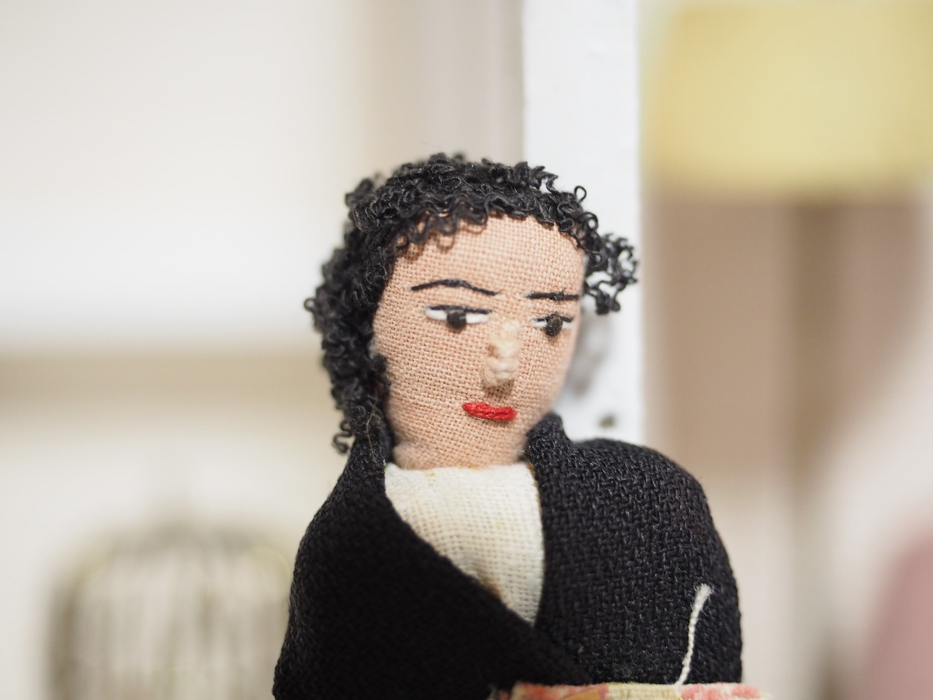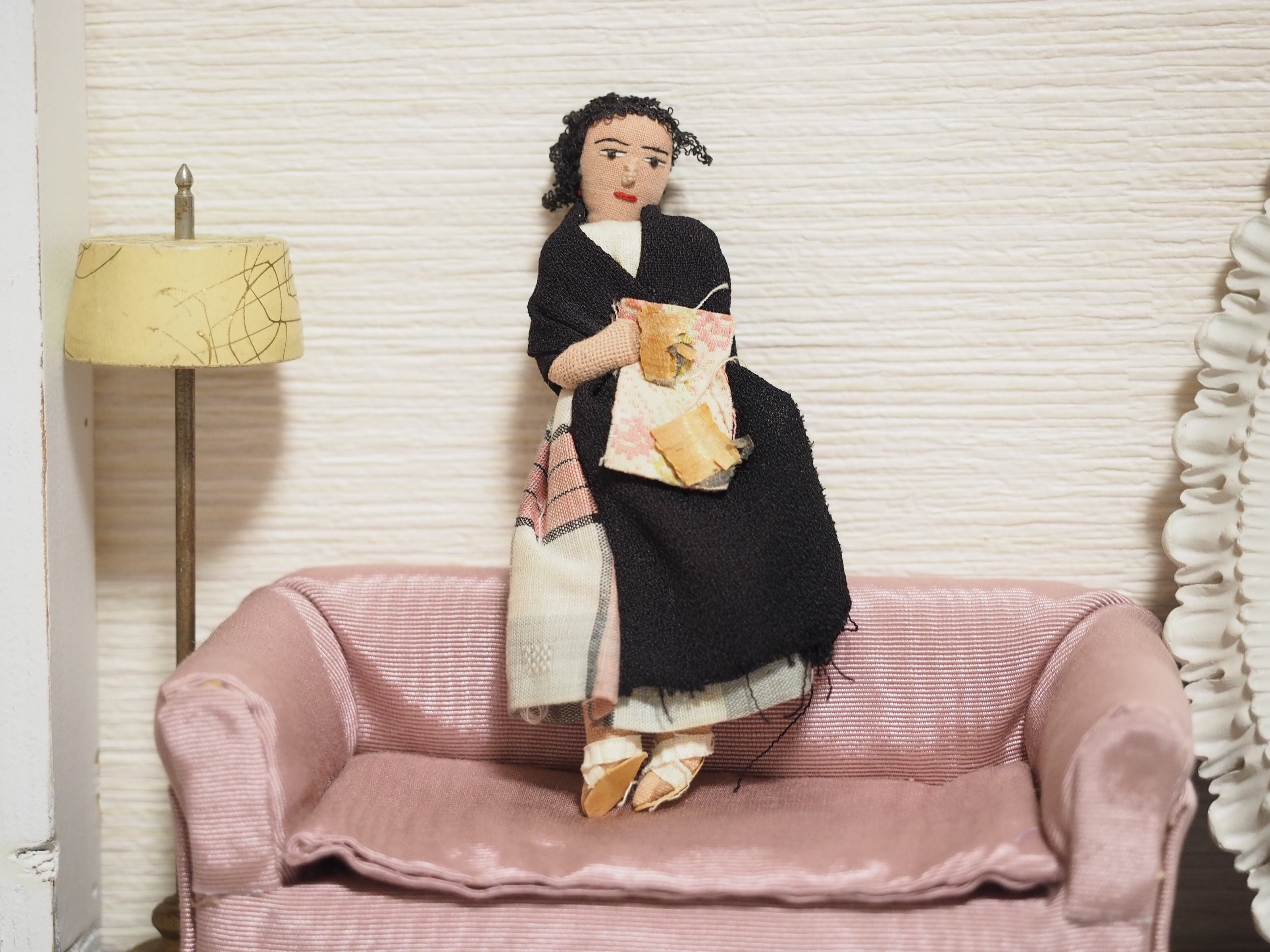 黒いショールと黒髪の布製ドール ドールハウスドール