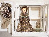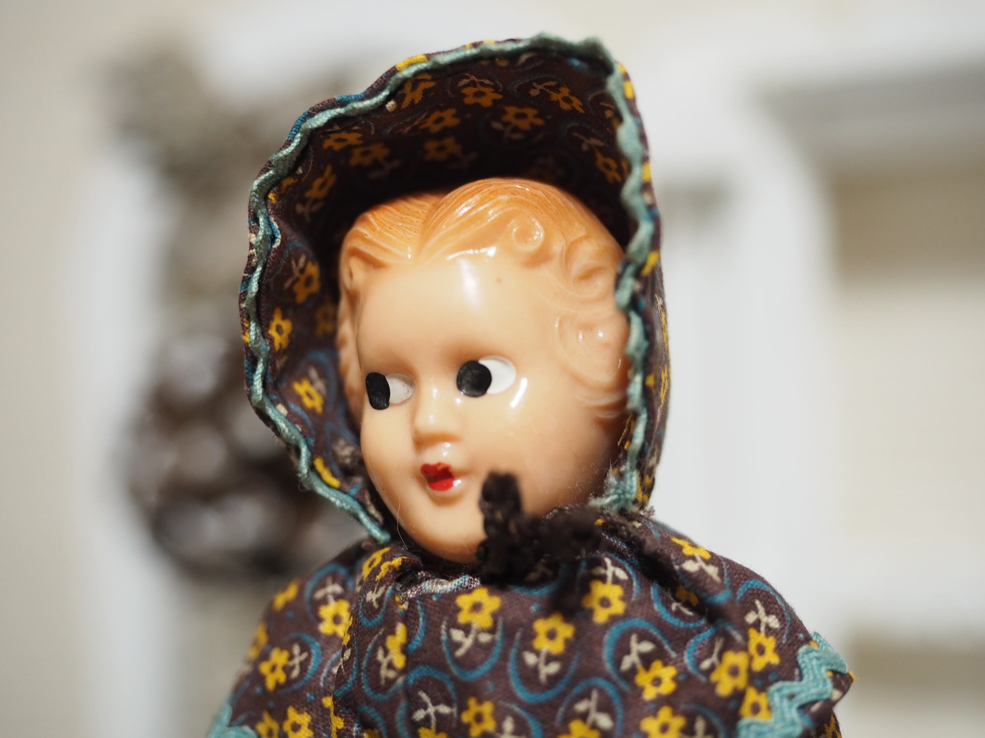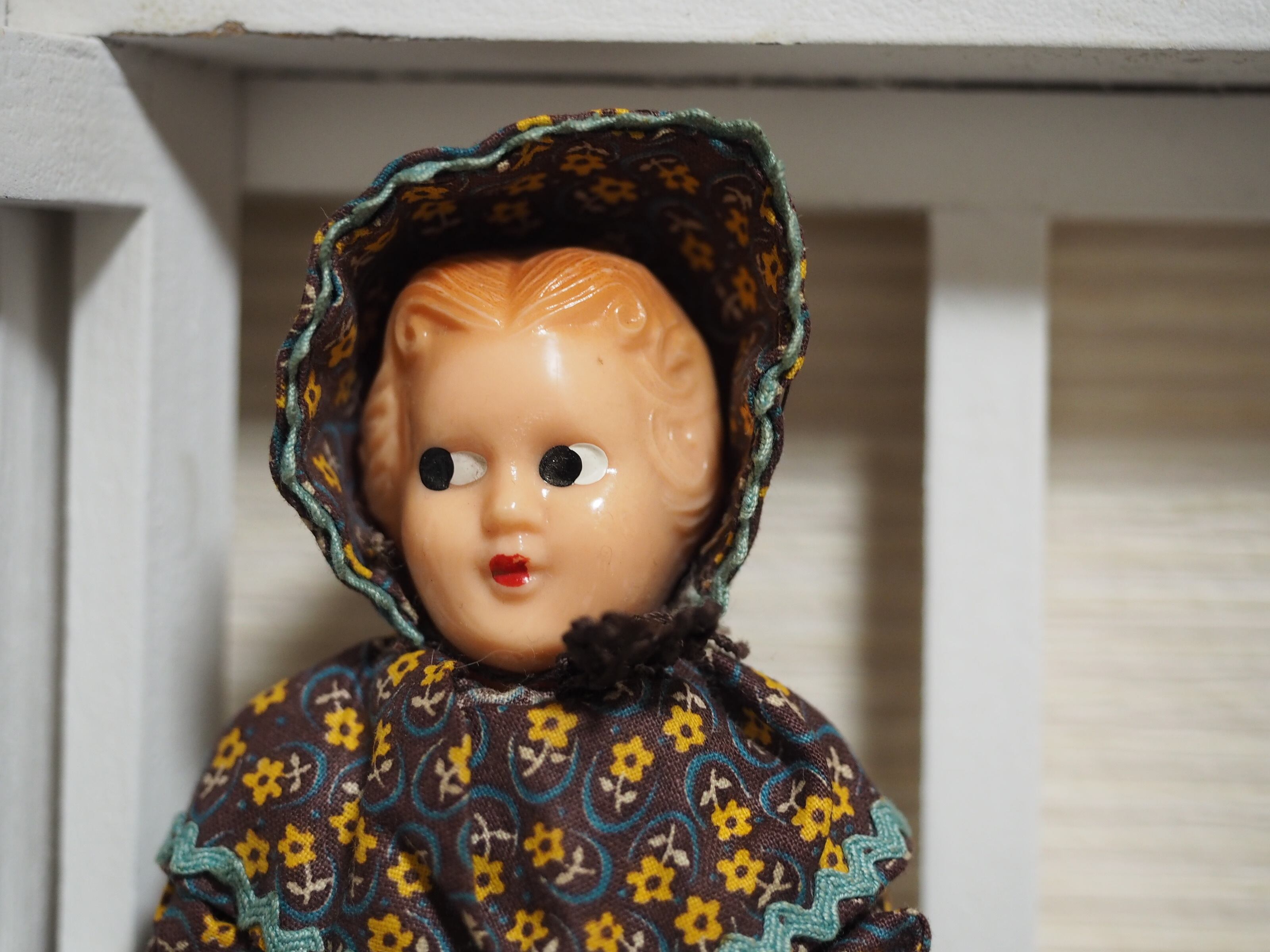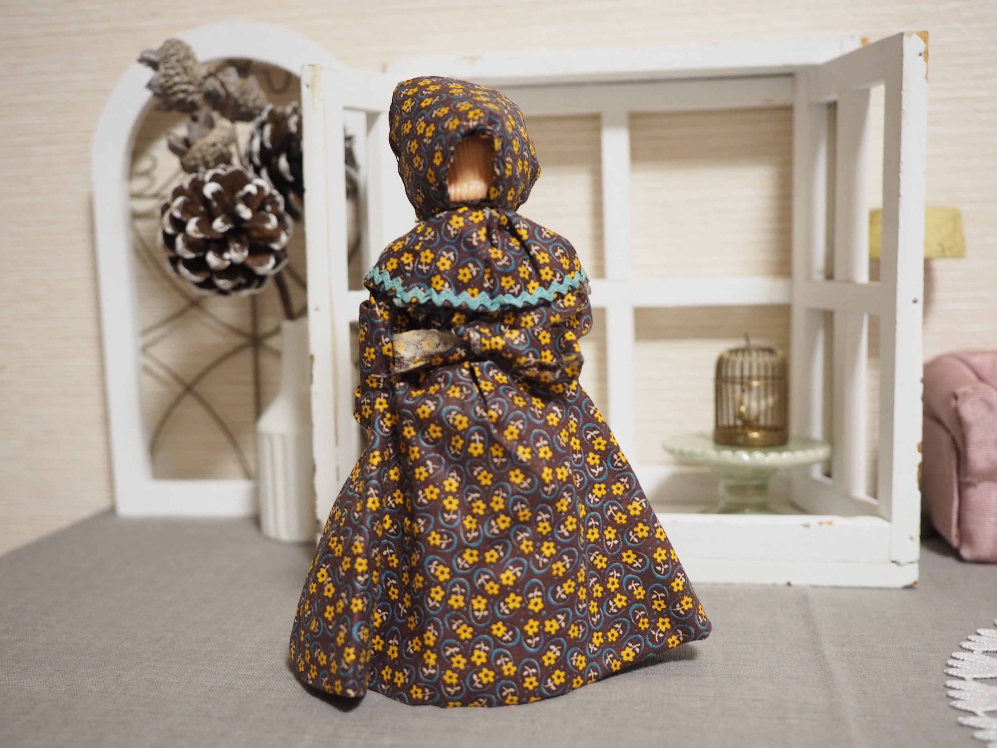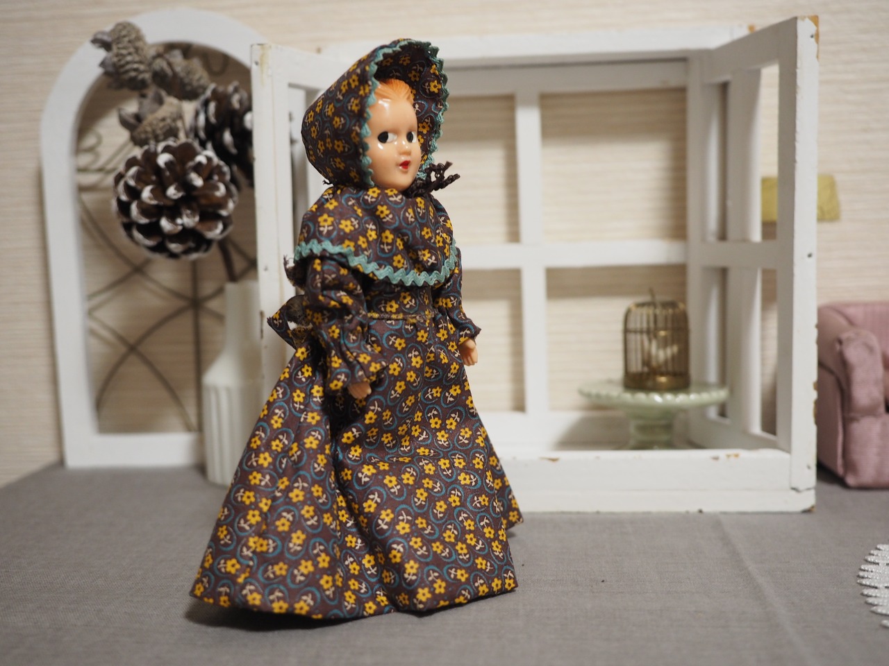 ドールと洋服作りのための糸や布がセットになった裁縫セットに入っていたタイプのプラスチックドールで、ブラウンにオレンジの小花柄、グリーンの山道リボンが素敵なボネ付きワンピースを着用しています。